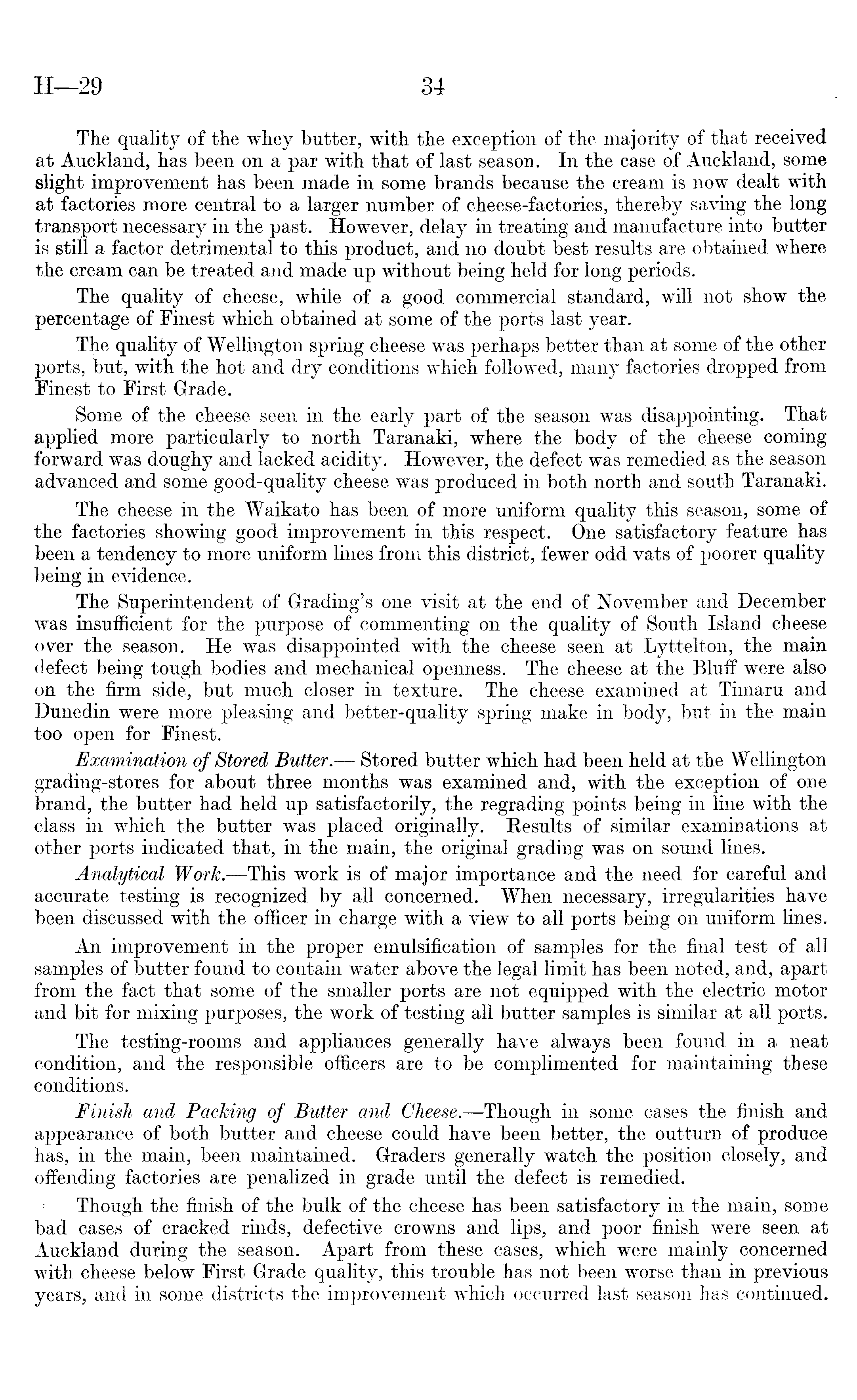 The quality of the whey butter, with the exception of the majority of that received at Auckland, has been on a par with that of last season. In the case of Auckland, some slight improvement has been made in some brands because the cream is now dealt with at factories more central to a larger number of cheese-factories, thereby saving the long transport necessary in the past. However, delay in treating and manufacture into butter is still a factor detrimental to this product, and no doubt best results are obtained where the cream can be treated and made up without being held for long periods. The quality of cheese, while of a good commercial standard, will not show the percentage of Finest which obtained at some of the ports last year. The quality of Wellington spring cheese was perhaps better than at some of the other ports, but, with the hot and dry conditions which followed, many factories dropped from Finest to First Grade. Some of the cheese seen in the early part of the season was disappointing. That applied more particularly to north Taranaki, where the body of the cheese coming forward was doughy and lacked acidity. However, the defect was remedied as the season advanced and some good-quality cheese was produced in both north and south Taranaki. The cheese in the Waikato has been of more uniform quality this season, some of the factories showing good improvement in this respect. One satisfactory feature has been a tendency to more uniform lines from this district, fewer odd vats of poorer quality being in evidence. The Superintendent of Grading's one visit at the end of November and December was insufficient for the purpose of commenting 011 the quality of South Island cheese over the season. He was disappointed with the cheese seen at Lyttelton, the main defect being tough bodies and mechanical openness. The cheese at the Bluff were also on the firm side, but much closer in texture. The cheese examined at Timaru and Dunedin were more pleasing and better-quality spring make in body, but in the main too open for Finest. Examination of Stored Butter. — Stored butter which had been held at the Wellington grading-stores for about three months was examined and, with the exception of one brand, the butter had held up satisfactorily, the regrading points being in line with the class in which the butter was placed originally. Results of similar examinations at other ports indicated that, in the main, the original grading was on sound lines. Analytical Work. —This work is of major importance and the need for careful and accurate testing is recognized by all concerned. When necessary, irregularities have been discussed with the officer in charge with a view to all ports being on uniform lines. An improvement in the proper emulsification of samples for the final test of all samples of butter found to contain water above the legal limit has been noted, and, apart from the fact that some of the smaller ports are not equipped with the electric motor and bit for mixing purposes, the work of testing all butter samples is similar at all ports. The testing-rooms and appliances generally have always been found in a neat condition, and the responsible officers are to be complimented for maintaining these conditions. Finish and Packing of Butter and Cheese. —Though in some cases the finish and appearance of both butter and cheese could have been better, the outturn of produce has, in the main, been maintained. Graders generally watch the position closely, and offending factories are penalized in grade until the defect is remedied. Though the finish of the bulk of the cheese has been satisfactory in the main, some bad cases of cracked rinds, defective crowns and lips, and poor finish were seen at Auckland during the season. Apart from these cases, which were mainly concerned with cheese below First Grade quality, this trouble has not been worse than in previous years, and in some districts the improvement which occurred last season has continued.