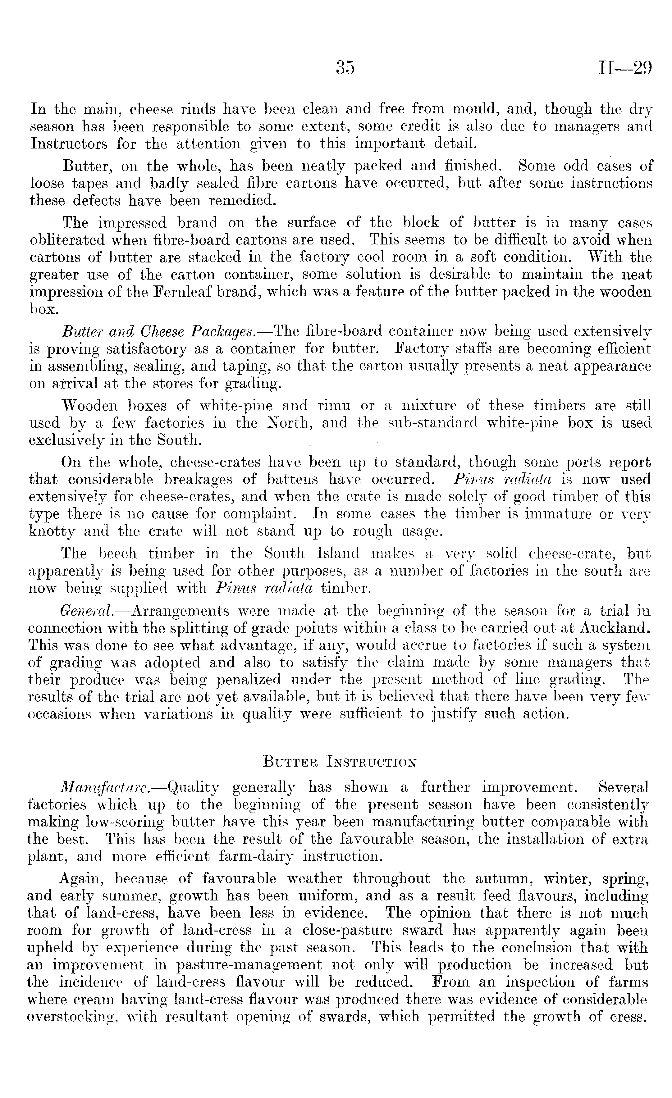 In the main, cheese rinds have been clean and free from mould, and, though the dry season has been responsible to some extent, some credit is also due to managers and Instructors for the attention given to this important detail. Butter, on the whole, has been neatly packed and finished. Some odd cases of loose tapes and badly sealed fibre cartons have occurred, but after some instructions these defects have been remedied. The impressed brand on the surface of the block of butter is in many cases obliterated when fibre-board cartons are used. This seems to be difficult to avoid when cartons of butter are stacked in the factory cool room in a soft condition. With the greater use of the carton container, some solution is desirable to maintain the neat impression of the Fernleaf brand, which was a feature of the butter packed in the wooden box. Butter and Cheese Packages.—The fibre-board container now being used extensively is proving satisfactory as a container for butter. Factory staffs are becoming efficient in assembling, sealing, and taping, so that the carton usually presents a neat appearance on arrival at the stores for grading. Wooden boxes of white-pine and rimu or a mixture of these timbers are still used by a few factories in the North, and the sub-standard white-pine box is used exclusively in the South. On the whole, cheese-crates have been up to standard, though some ports report that considerable breakages of battens have occurred. Pinus radiata is now used extensively for cheese-crates, and when the crate is made solely of good timber of this type there is no cause for complaint. In some cases the timber is immature or very knotty and the crate will not stand up to rough usage. The beech timber in the South Island makes a very solid cheese-crate, but apparently is being used for other purposes, as a number of factories in the south are now being supplied with Pinus radiata timber. General. —Arrangements were made at the beginning of the season for a trial in connection with the splitting of grade points within a class to be carried out at Auckland. This was done to see what advantage, if any, would accrue to factories if such a system of grading was adopted and also to satisfy the claim made by some managers that their produce was being penalized under the present method of line grading. The results of the trial are not yet available, but it is believed that there have been very few occasions when variations in quality were sufficient to justify such action. Butter Instruction Manufacture. —Quality generally has shown a further improvement. Several factories which up to the beginning of the present season have been consistently making low-scoring butter have this year been manufacturing butter comparable with the best. This has been the result of the favourable season, the installation of extra plant, and more efficient farm-dairy instruction. Again, because of favourable weather throughout the autumn, winter, spring, and early summer, growth has been uniform, and as a result feed flavours, including that of land-cress, have been less in evidence. The opinion that there is not much room for growth of land-cress in a close-pasture sward has apparently again been upheld by experience during the past season. This leads to the conclusion that with an improvement in pasture-management not only will production be increased but the incidence of land-cress flavour will be reduced. From an inspection of farms where cream having land-cress flavour was produced there was evidence of considerable overstocking, with resultant opening of swards, which permitted the growth of cress.