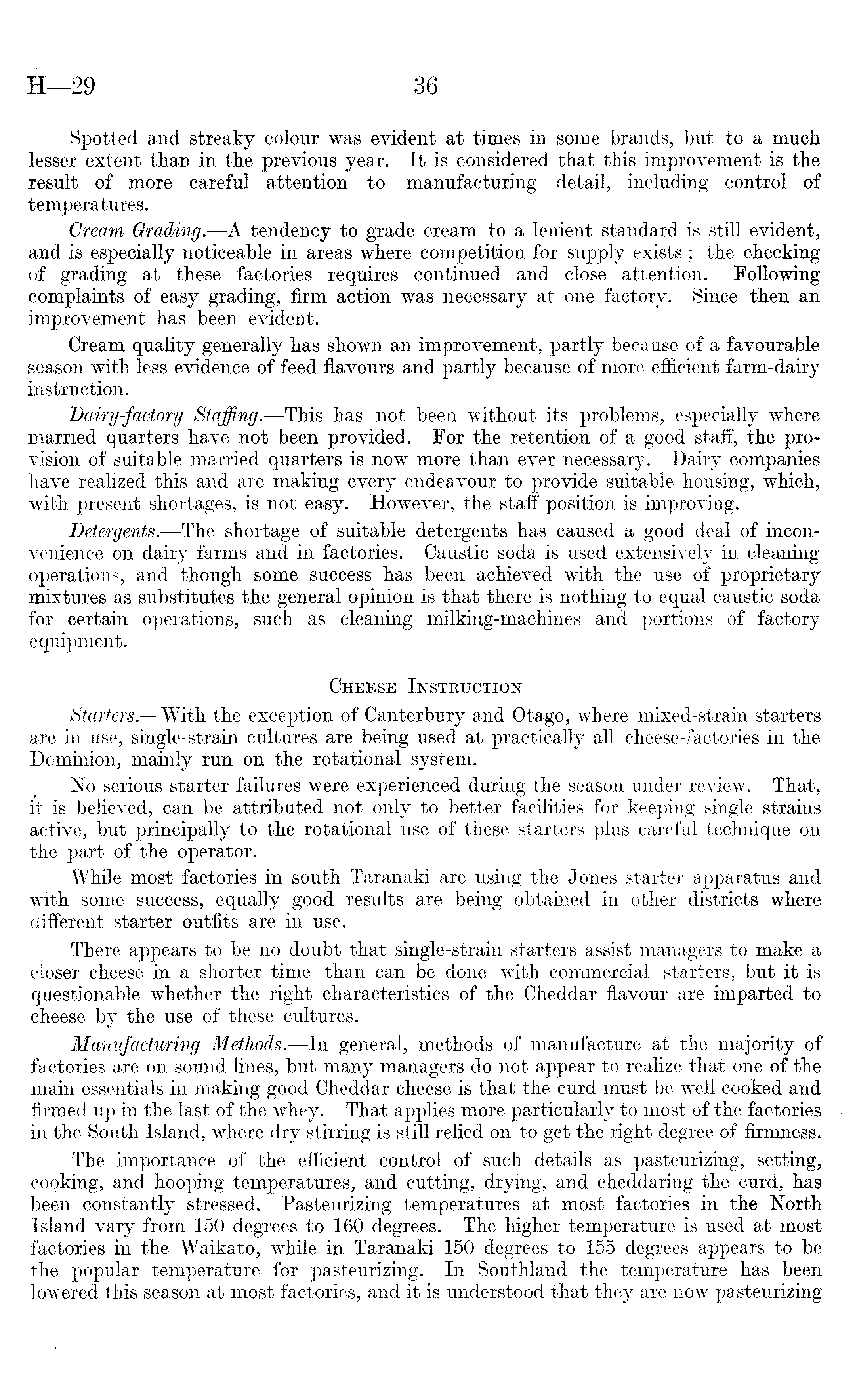Spotted and streaky colour was evident at times in some brands, but to a much lesser extent than in the previous year. It is considered that this improvement is the result of more careful attention to manufacturing detail, including control of temperatures. Cream Grading.—A tendency to grade cream to a lenient standard is still evident, and is especially noticeable in areas where competition for supply exists ; the checking of grading at these factories requires continued and close attention. Following complaints of easy grading, firm action was necessary at one factory. Since then an improvement has been evident. Cream quality generally has shown an improvement, partly because of a favourable season with less evidence of feed flavours and partly because of more efficient farm-dairy instruction. Dairy-factory Staffing.—This has not been without its problems, especially where married quarters have not been provided. For the retention of a good staff, the provision of suitable married quarters is now more than ever necessary. Dairy companies have realized this and are making every endeavour to provide suitable housing, which, with present shortages, is not easy. However, the staff position is improving. Detergents.—The shortage of suitable detergents has caused a good deal of inconvenience on dairy farms and in factories. Caustic soda is used extensively in cleaning operations, and though some success has been achieved with the use of proprietary mixtures as substitutes the general opinion is that there is nothing to equal caustic soda for certain operations, such as cleaning milking-machines and portions of factory equipment. Cheese Instruction Starters. —With the exception of Canterbury and Otago, where mixed-strain starters are in use, single-strain cultures are being used at practically all cheese-factories in the Dominion, mainly run on the rotational system. No serious starter failures were experienced during the season under review. That, it is believed, can be attributed not only to better facilities for keeping single strains active, but principally to the rotational use of these starters plus careful technique on the part of the operator. While most factories in south Taranaki are using the Jones starter apparatus and with some success, equally good results are being obtained in other districts where different starter outfits are in use. There appears to be no doubt that single-strain starters assist managers to make a closer cheese in a shorter time than can be done with commercial starters, but it is questionable whether the right characteristics of the Cheddar flavour are imparted to cheese by the use of these cultures. Manufacturing Methods. —In general, methods of manufacture at the majority of factories are on sound lines, but many managers do not appear to realize that one of the main essentials in making good Cheddar cheese is that the curd must be well cooked and firmed up in the last of the whey. That applies more particularly to most of the factories in the South Island, where dry stirring is still relied on to get the right degree of firmness. The importance of the efficient control of such details as pasteurizing, setting, cooking, and hooping temperatures, and cutting, drying, and cheddaring the curd, has been constantly stressed. Pasteurizing temperatures at most factories in the North Island vary from 150 degrees to 160 degrees. The higher temperature is used at most factories in the Waikato, while in Taranaki 150 degrees to 155 degrees appears to be the popular temperature for pasteurizing. In Southland the temperature has been lowered this season at most factories, and it is understood that they are now pasteurizing