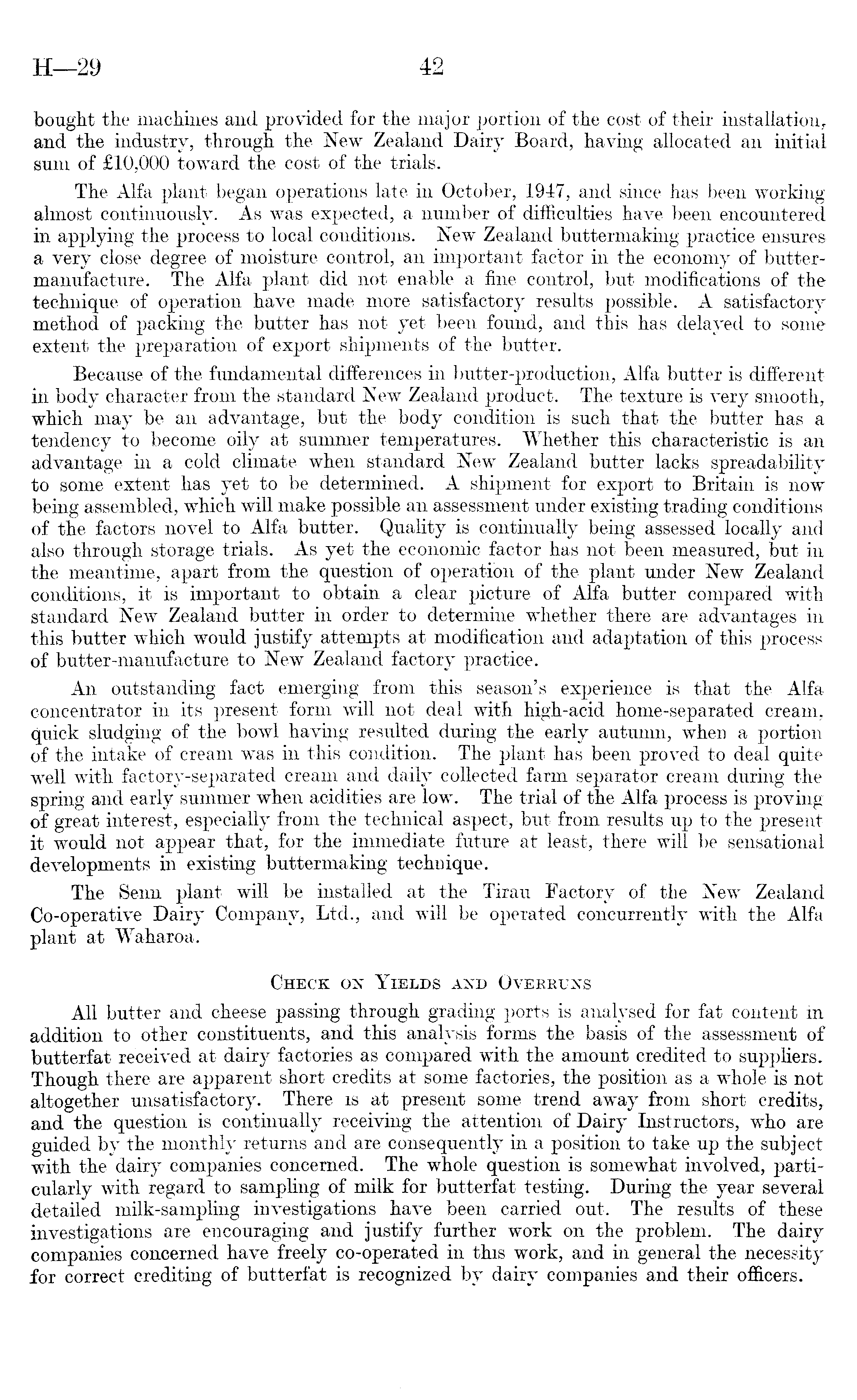 bought the machines and provided for the major portion of the cost of their installation, and the industry, through the New Zealand Dairy Board, having allocated an initial sum of £lO,OOO toward the cost of the trials. The Alfa plant began operations late in October, 1947, and since has been working almost continuously. As was expected, a number of difficulties have been encountered in applying the process to local conditions. New Zealand buttermaking practice ensures a very close degree of moisture control, an important factor in the economy of buttermanufacture. The Alfa plant did not enable a fine control, but modifications of the technique of operation have made more satisfactory results possible. A satisfactory method of packing the butter has not yet been found, and this has delayed to some extent the preparation of export shipments of the butter. Because of the fundamental differences in butter-production, Alfa butter is different in body character from the standard New Zealand product. The texture is very smooth, which may be an advantage, but the body condition is such that the butter has a tendency to become oily at summer temperatures. Whether this characteristic is an advantage in a cold climate when standard New Zealand butter lacks spreadability to some extent has yet to be determined. A shipment for export to Britain is now being assembled, which will make possible an assessment under existing trading conditions of the factors novel to Alfa butter. Quality is continually being assessed locally and also through storage trials. As yet the economic factor has not been measured, but in the meantime, apart from the question of operation of the plant under New Zealand conditions, it is important to obtain a clear picture of Alfa butter compared with standard New Zealand butter in order to determine whether there are advantages in this butter which would justify attempts at modification and adaptation of this process of butter-manufacture to New Zealand factory practice. An outstanding fact emerging from this season's experience is that the Alfa concentrator in its present form will not deal with high-acid home-separated cream, quick sludging of the bowl having resulted during the early autumn, when a portion of the intake of cream was in this condition. The plant has been proved to deal quite well with factory-separated cream and daily collected farm separator cream during the spring and early summer when acidities are low. The trial of the Alfa process is proving of great interest, especially from the technical aspect, but from results up to the present it would not appear that, for the immediate future at least, there will be sensational developments in existing buttermaking technique. The Senn plant will be installed at the Tirau Factory of the New Zealand Co-operative Dairy Company, Ltd., and will be operated concurrently with the Alfa plant at Waharoa. Check on Yields and Overruns All butter and cheese passing through grading ports is analysed for fat content in addition to other constituents, and this analysis forms the basis of the assessment of butterfat received at dairy factories as compared with the amount credited to suppliers. Though there are apparent short credits at some factories, the position as a whole is not altogether unsatisfactory. There is at present some trend away from short credits, and the question is continually receiving the attention of Dairy Instructors, who are guided by the monthly returns and are consequently in a position to take up the subject with the dairy companies concerned. The whole question is somewhat involved, particularly with regard to sampling of milk for butterfat testing. During the year several detailed milk-sampling investigations have been carried out. The results of these investigations are encouraging and justify further work on the problem. The dairy companies concerned have freely co-operated in this work, and in general the necessity for correct crediting of butterfat is recognized by dairy companies and their officers.