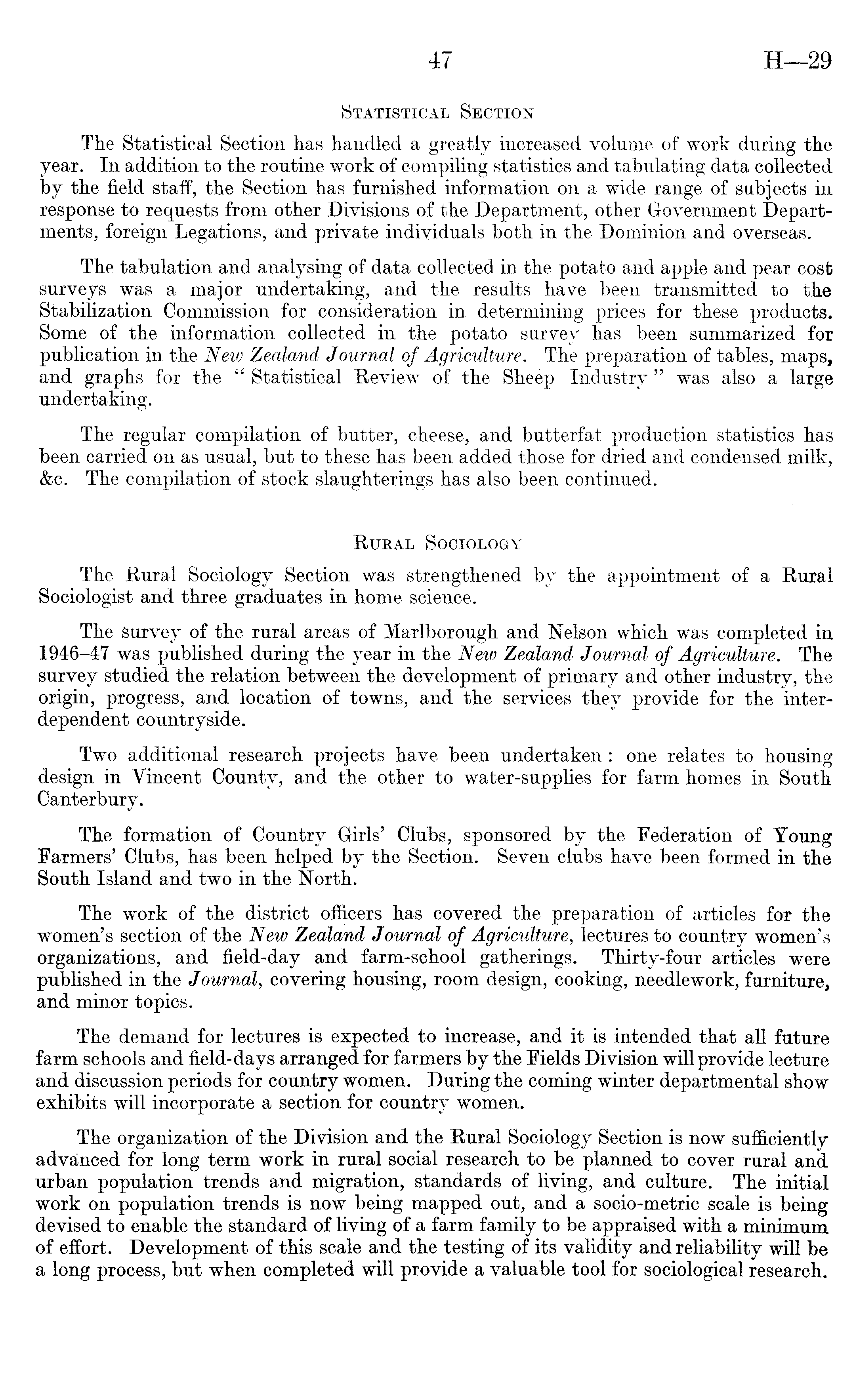 Statistical Section The Statistical Section has handled a greatly increased volume of work during the year. In addition to the routine work of compiling statistics and tabulating data collected by the field staff, the Section has furnished information on a wide range of subjects in response to requests from other Divisions of the Department, other Government Departments, foreign Legations, and private individuals both in the Dominion and overseas. The tabulation and analysing of data collected in the potato and apple and pear cost surveys was a major undertaking, and the results have been transmitted to the Stabilization Commission for consideration in determining prices for these products. Some of the information collected in the potato survey has been summarized for publication in the New Zealand Journal of Agriculture. The preparation of tables, maps, and graphs for the "Statistical Review of the Sheep Industry" was also a large undertaking. The regular compilation of butter, cheese, and butterfat production statistics has been carried on as usual, but to these has been added those for dried and condensed milk, &c. The compilation of stock slaughterings has also been continued. Rural Sociology The Rural Sociology Section was strengthened by the appointment of a Rural Sociologist and three graduates in home science. The Survey of the rural areas of Marlborough and Nelson which was completed in 1946-47 was published during the year in the New Zealand Journal of Agriculture. The survey studied the relation between the development of primary and other industry, the origin, progress, and location of towns, and the services they provide for the interdependent countryside. Two additional research projects have been undertaken : one relates to housing design in Vincent County, and the other to water-supplies for farm homes in South Canterbury. The formation of Country Girls' Clubs, sponsored by the Federation of Young Farmers' Clubs, has been helped by the Section. Seven clubs have been formed in the South Island and two in the North. The work of the district officers has covered the preparation of articles for the women's section of the New Zealand Journal of Agriculture, lectures to country women's organizations, and field-day and farm-school gatherings. Thirty-four articles were published in the Journal, covering housing, room design, cooking, needlework, furniture, and minor topics. The demand for lectures is expected to increase, and it is intended that all future farm schools and field-days arranged for farmers by the Fields Division will provide lecture and discussion periods for country women. During the coming winter departmental show exhibits will incorporate a section for country women. The organization of the Division and the Rural Sociology Section is now sufficiently advanced for long term work in rural social research to be planned to cover rural and urban population trends and migration, standards of living, and culture. The initial work on population trends is now being mapped out, and a socio-metric scale is being devised to enable the standard of living of a farm family to be appraised with a minimum of effort. Development of this scale and the testing of its validity and reliability will be a long process, but when completed will provide a valuable tool for sociological research.