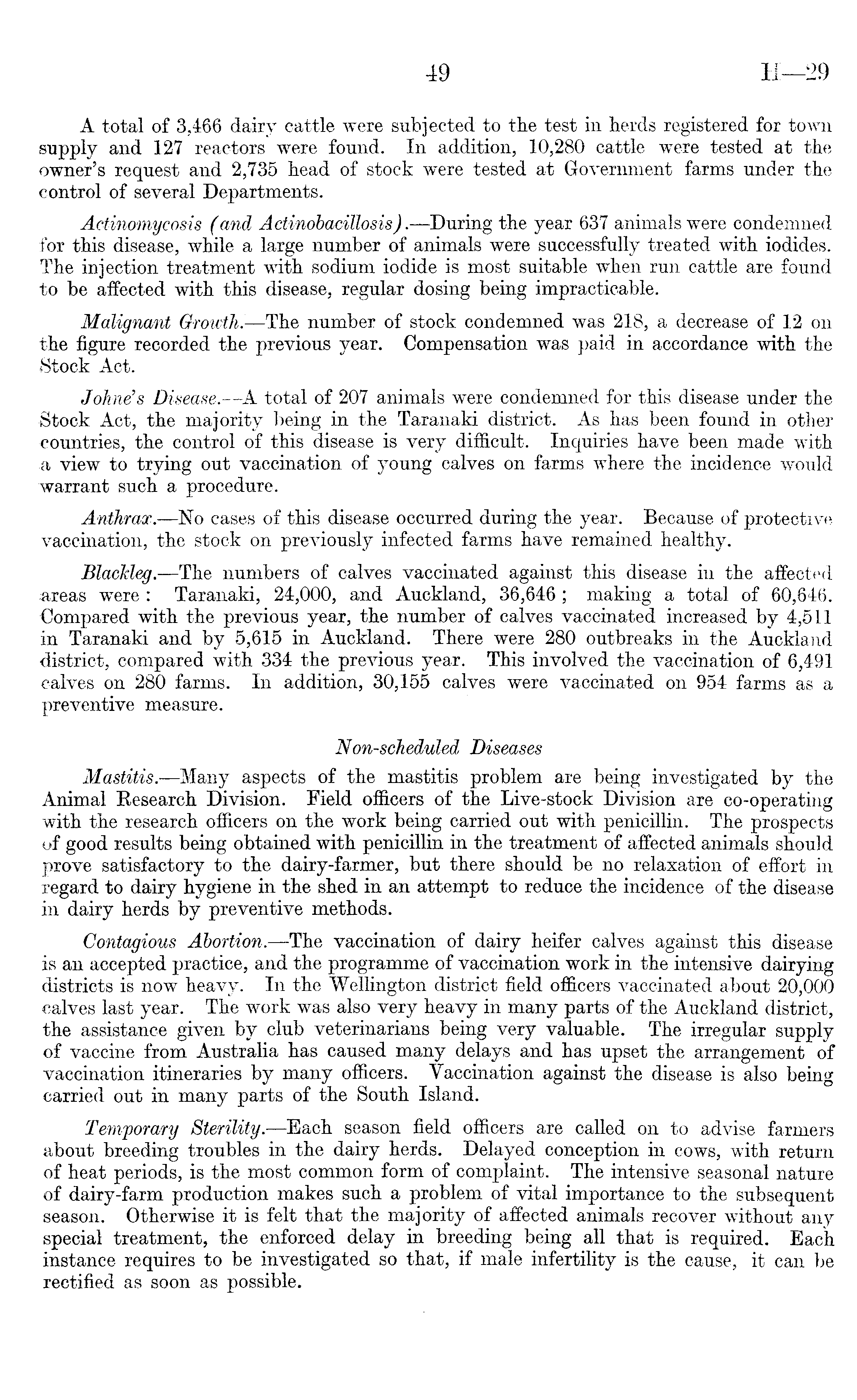 A total of 3,466 dairy cattle were subjected to the test in herds registered for town supply and 127 reactors were found. In addition, 10,280 cattle were tested at the owner's request and 2,735 head of stock were tested at Government farms under the control of several Departments. Actinomycosis (and Actinobacillosis). —During the year 637 animals were condemned for this disease, while a large number of animals were successfully treated with iodides. The injection treatment with sodium iodide is most suitable when run cattle are found to be affected with this disease, regular dosing being impracticable. Malignant Growth. —The number of stock condemned was 218, a decrease of 12 on the figure recorded the previous year. Compensation was paid in accordance with the Stock Act. Johne's Disease.—A. total of 207 animals were condemned for this disease under the Stock Act, the majority being in the Taranaki district. As has been found in other countries, the control of this disease is very difficult. Inquiries have been made with a, view to trying out vaccination of young calves on farms where the incidence would warrant such a procedure. Anthrax. —No cases of this disease occurred during the year. Because of protective vaccination, the stock on previously infected farms have remained healthy. Blackleg.—The numbers of calves vaccinated against this disease in the affected areas were : Taranaki, 24,000, and Auckland, 36,646 ; making a total of 60,646. Compared with the previous year, the number of calves vaccinated increased by 4,511 in Taranaki and by 5,615 in Auckland. There were 280 outbreaks in the Auckland district, compared with 334 the previous year. This involved the vaccination of 6,491 calves on 280 farms. In addition, 30,155 calves were vaccinated on 954 farms as a preventive measure. Non-scheduled Diseases Mastitis. —Many aspects of the mastitis problem are being investigated by the Animal Research Division. Field officers of the Live-stock Division are co-operating with the research officers on the work being carried out with penicillin. The prospects of good results being obtained with penicillin in the treatment of affected animals should prove satisfactory to the dairy-farmer, but there should be no relaxation of effort in regard to dairy hygiene in the shed in an attempt to reduce the incidence of the disease in dairy herds by preventive methods. Contagious Abortion.—The vaccination of dairy heifer calves against this disease is an accepted practice, and the programme of vaccination work in the intensive dairying districts is now heavy. In the Wellington district field officers vaccinated about 20,000 calves last year. The work was also very heavy in many parts of the Auckland district, the assistance given by club veterinarians being very valuable. The irregular supply of vaccine from Australia has caused many delays and has upset the arrangement of vaccination itineraries by many officers. Vaccination against the disease is also being carried out in many parts of the South Island. Temporary Sterility.—Each season field officers are called on to advise farmers about breeding troubles in the dairy herds. Delayed conception in cows, with return of heat periods, is the most common form of complaint. The intensive seasonal nature of dairy-farm production makes such a problem of vital importance to the subsequent season. Otherwise it is felt that the majority of affected animals recover without any special treatment, the enforced delay in breeding being all that is required. Each instance requires to be investigated so that, if male infertility is the cause, it can be rectified as soon as possible.