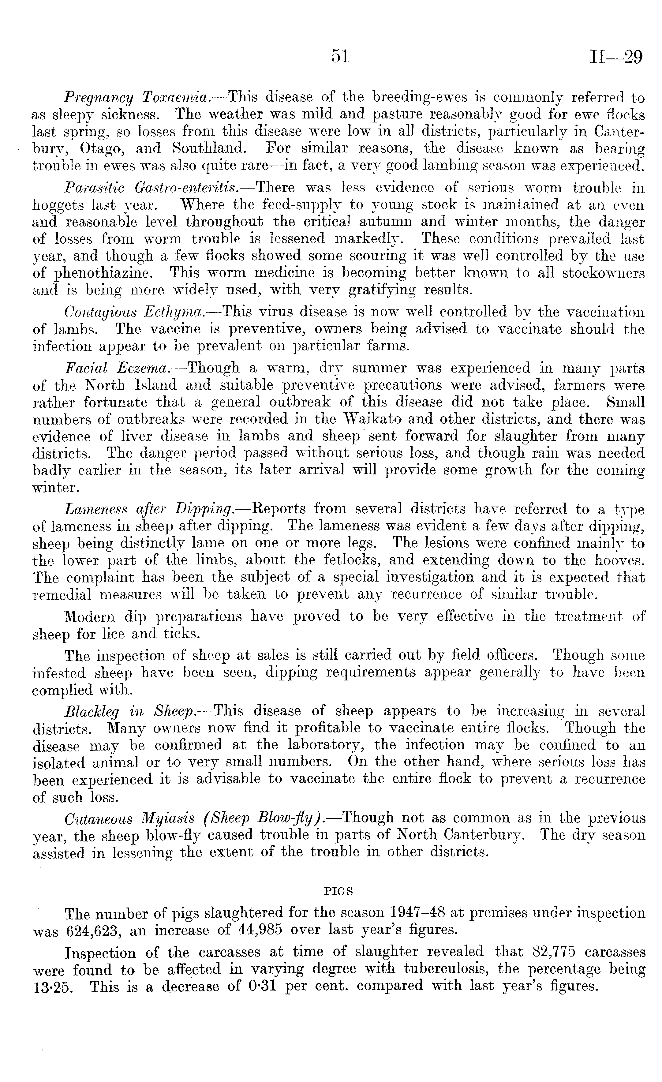 Pregnancy Toxaemia. —This disease of the breeding-ewes is commonly referred to as sleepy sickness. The weather was mild and pasture reasonably good for ewe flocks last spring, so losses from this disease were low in all districts, particularly in Canterbury, Otago, and Southland. For similar reasons, the disease known as bearing trouble in ewes was also quite rare —in fact, a very good lambing season was experienced. Parasitic Gastro-enteritis. —There was less evidence of serious worm trouble in hoggets last year. Where the feed-supply to young stock is maintained at an even and reasonable level throughout the critical autumn and winter months, the danger of losses from worm trouble is lessened markedly. These conditions prevailed last year, and though a few flocks showed some scouring it was well controlled by the use of phenothiazine. This worm medicine is becoming better known to all stockowners and is being more widely used, with very gratifying results. Contagious Ecthyma. —This virus disease is now well controlled by the vaccination of lambs. The vaccine is preventive, owners being advised to vaccinate should the infection appear to be prevalent on particular farms. Facial Eczema. —Though a warm, dry summer was experienced in many parts of the North Island and suitable preventive precautions were advised, farmers were rather fortunate that a general outbreak of this disease did not take place. Small numbers of outbreaks were recorded in the Waikato and other districts, and there was evidence of liver disease in lambs and sheep sent forward for slaughter from many districts. The danger period passed without serious loss, and though rain was needed badly earlier in the season, its later arrival will provide some growth for the coming winter. Lameness after Dipping. —Reports from several districts have referred to a type of lameness in sheep after dipping. The lameness was evident a few days after dipping, sheep being distinctly lame on one or more legs. The lesions were confined mainly to the lower part of the limbs, about the fetlocks, and extending down to the hooves. The complaint has been the subject of a special investigation and it is expected that remedial measures will be taken to prevent any recurrence of similar trouble. Modern dip preparations have proved to be very effective in the treatment of sheep for lice and ticks. The inspection of sheep at sales is still carried out by field officers. Though some infested sheep have been seen, dipping requirements appear generally to have been complied with. Blackleg in Sheep.—This disease of sheep appears to be increasing in several districts. Many owners now find it profitable to vaccinate entire flocks. Though the disease may be confirmed at the laboratory, the infection may be confined to an isolated animal or to very small numbers. On the other hand, where serious loss has been experienced it is advisable to vaccinate the entire flock to prevent a recurrence of such loss. Cutaneous Myiasis (Sheep Blow-fly). —Though not as common as in the previous year, the sheep blow-fly caused trouble in parts of North Canterbury. The dry season assisted in lessening the extent of the trouble in other districts. PIGS The number of pigs slaughtered for the season 1947-48 at premises under inspection was 624,623, an increase of 44,985 over last year's figures. Inspection of the carcasses at time of slaughter revealed that 82,775 carcasses were found to be affected in varying degree with tuberculosis, the percentage being 13-25. This is a decrease of 0-31 per cent, compared with last year's figures.