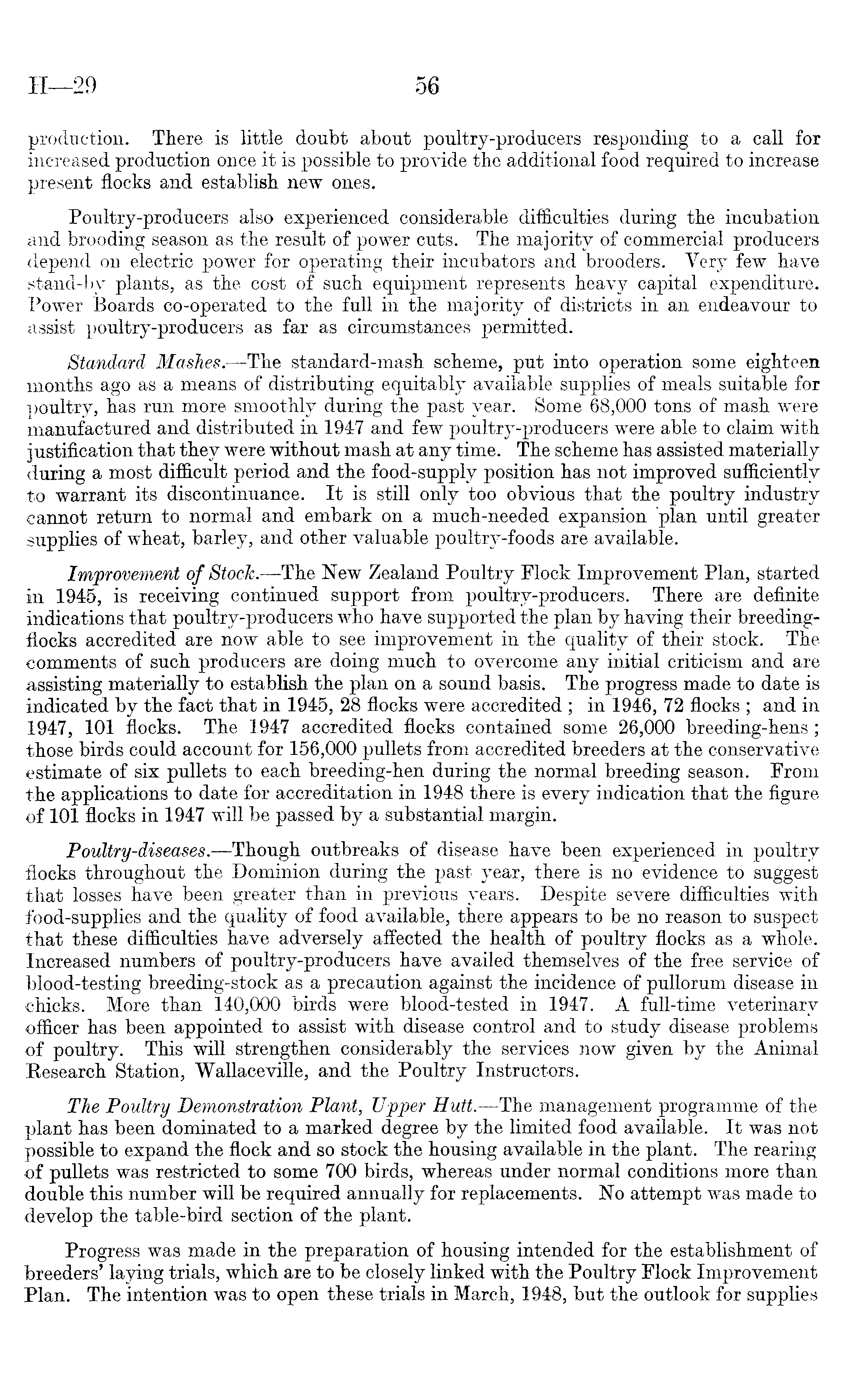 production. There is little doubt about poultry-producers responding to a call for increased production once it is possible to provide the additional food required to increase present flocks and establish new ones. Poultry-producers also experienced considerable difficulties during the incubation and brooding season as the result of power cuts. The majority of commercial producers depend on electric power for operating their incubators and brooders. Very few have stand-by plants, as the cost of such equipment represents heavy capital expenditure. Power Boards co-operated to the full in the majority of districts in an endeavour to assist poultry-producers as far as circumstances permitted. Standard Mashes.—The standard-mash scheme, put into operation some eighteen months ago as a means of distributing equitably available supplies of meals suitable for poultry, has run more smoothly during the past year. Some 68,000 tons of mash were manufactured and distributed in 1947 and few poultry-producers were able to claim with justification that they were without mash at any time. The scheme has assisted materially during a most difficult period and the food-supply position has not improved sufficiently to warrant its discontinuance. It is still only too obvious that the poultry industry cannot return to normal and embark on a much-needed expansion plan until greater supplies of wheat, barley, and other valuable poultry-foods are available. Improvement of Stock. —The New Zealand Poultry Flock Improvement Plan, started in 1945, is receiving continued support from poultry-producers. There are definite indications that poultry-producers who have supported the plan by having their breedingflocks accredited are now able to see improvement in the quality of their stock. The comments of such producers are doing much to overcome any initial criticism and are assisting materially to establish the plan on a sound basis. The progress made to date is indicated by the fact that in 1945, 28 flocks were accredited ; in 1946, 72 flocks ; and in 1947, 101 flocks. The 1947 accredited flocks contained some 26,000 breeding-hens; those birds could account for 156,000 pullets from accredited breeders at the conservative estimate of six pullets to each breeding-hen during the normal breeding season. From the applications to date for accreditation in 1948 there is every indication that the figure of 101 flocks in 1947 will be passed by a substantial margin. Poultry-diseases. —Though outbreaks of disease have been experienced in poultry flocks throughout the Dominion during the past year, there is no evidence to suggest that losses have been greater than in previous years. Despite severe difficulties with food-supplies and the quality of food available, there appears to be no reason to suspect that these difficulties have adversely affected the health of poultry flocks as a whole. Increased numbers of poultry-producers have availed themselves of the free service of blood-testing breeding-stock as a precaution against the incidence of pullorum disease in chicks. More than 140,000 birds were blood-tested in 1947. A full-time veterinary officer has been appointed to assist with disease control and to study disease problems of poultry. This will strengthen considerably the services now given by the Animal Research Station, Wallaceville, and the Poultry Instructors. The Poultry Demonstration Plant, Upper Hutt. —The management programme of the plant has been dominated to a marked degree by the limited food available. It was not possible to expand the flock and so stock the housing available in the plant. The rearing of pullets was restricted to some 700 birds, whereas under normal conditions more than double this number will be required annually for replacements. No attempt was made to develop the table-bird section of the plant. Progress was made in the preparation of housing intended for the establishment of breeders' laying trials, which are to be closely linked with the Poultry Flock Improvement Plan. The intention was to open these trials in March, 1948, but the outlook for supplies