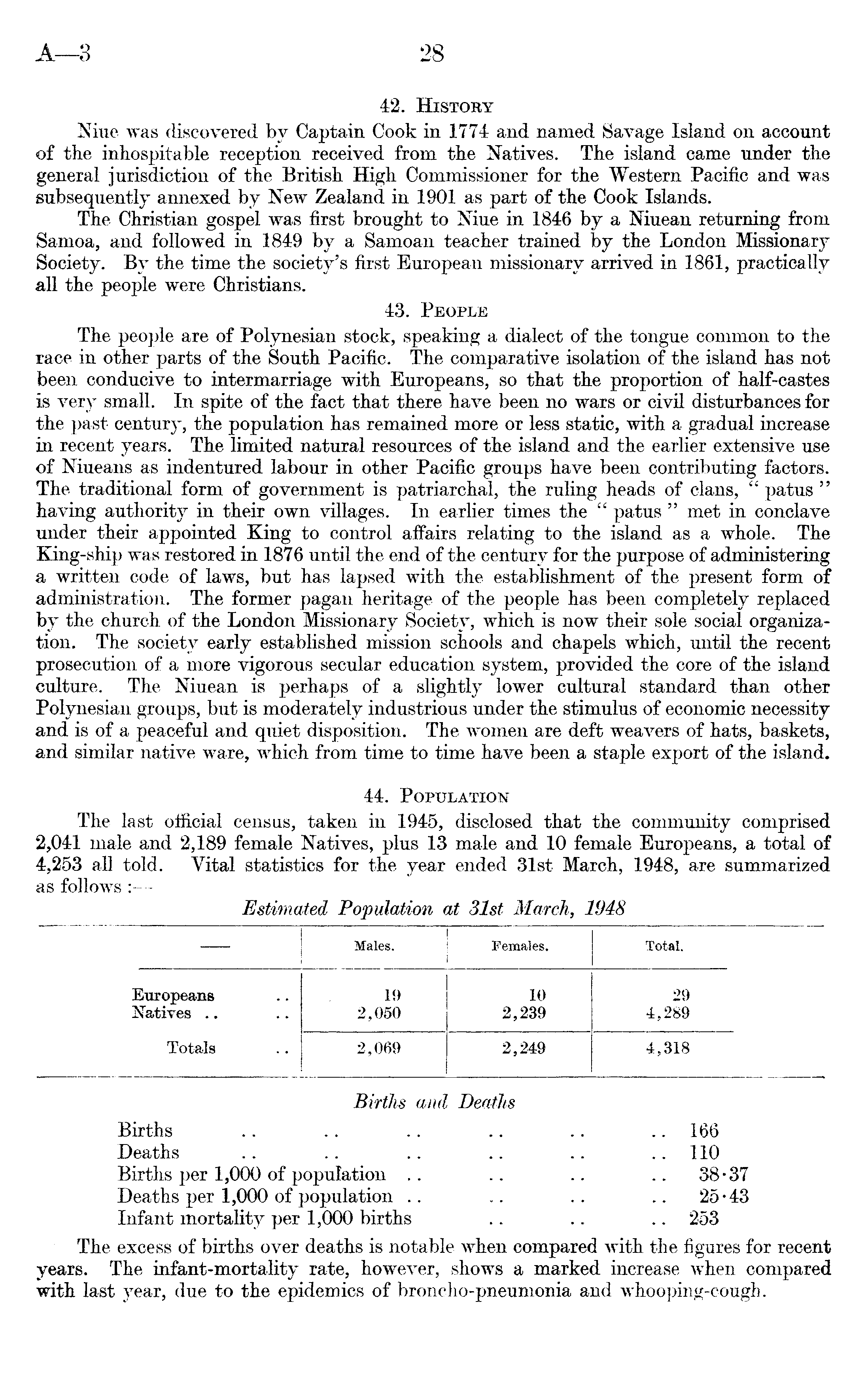 42. History Nine was discovered by Captain Cook in 1774 and named Savage Island on account of the inhospitable reception received from the Natives. The island came under the general jurisdiction of the British High Commissioner for the Western Pacific and was subsequently annexed by New Zealand in 1901 as part of the Cook Islands. The Christian gospel was first brought to Niue in 1846 by a Niuean returning from Samoa, and followed in 1849 by a Samoan teacher trained by the London Missionary Society. By the time the society's first European missionary arrived in 1861, practically all the people were Christians. 43. People The people are of Polynesian stock, speaking a dialect of the tongue common to the race in other parts of the South Pacific. The comparative isolation of the island has not been conducive to intermarriage with Europeans, so that the proportion of half-castes is very small. In spite of the fact that there have been no wars or civil disturbances for the past century, the population has remained more or less static, with a gradual increase in recent years. The limited natural resources of the island and the earlier extensive use of Niueans as indentured labour in other Pacific groups have been contributing factors. The traditional form of government is patriarchal, the ruling heads of clans, " patus " having authority in their own villages. In earlier times the " patus " met in conclave under their appointed King to control affairs relating to the island as a whole. The King-ship was restored in 1876 until the end of the century for the purpose of administering a written code of laws, but has lapsed with the establishment of the present form of administration. The former pagan heritage of the people has been completely replaced by the church of the London Missionary Society, which is now their sole social organization. The society early established mission schools and chapels which, until the recent prosecution of a more vigorous secular education system, provided the core of the island culture. The Niuean is perhaps of a slightly lower cultural standard than other Polynesian groups, but is moderately industrious under the stimulus of economic necessity and is of a peaceful and quiet disposition. The women are deft weavers of hats, baskets, and similar native ware, which from time to time have been a staple export of the island. 44. Population The last official census, taken in 1945, disclosed that the community comprised 2,041 male and 2,189 female Natives, plus 13 male and 10 female Europeans, a total of 4,253 all told. Vital statistics for the year ended 31st March, 1948, are summarized as follows :