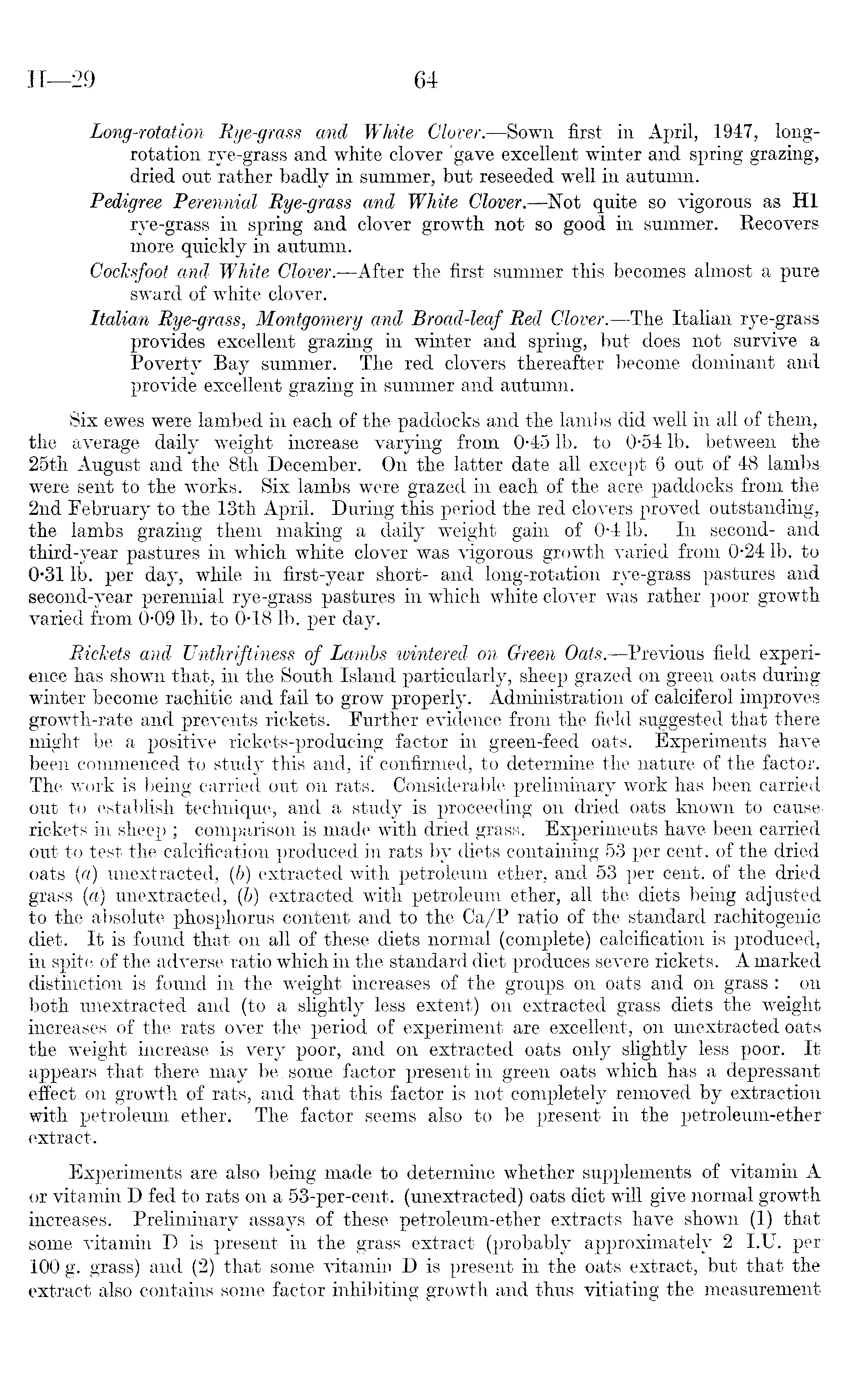 Long-rotation Rye-grass and White Clover. —Sown first in April, 1947, longrotation rye-grass and white clover gave excellent winter and spring grazing, dried out rather badly in summer, but reseeded well in autumn. Pedigree Perennial Rye-grass and White Clover.—Not quite so vigorous as HI rye-grass in spring and clover growth not so good in summer. Recovers more quickly in autumn. CocJcsfoot and White Clover.—After the first summer this becomes almost a pure sward of white clover. Italian Rye-grass, Montgomery and Broad-leaf Red Clover.—The Italian rye-grass provides excellent grazing in winter and spring, but does not survive a Poverty Bay summer. The red clovers thereafter become dominant and provide excellent grazing in summer and autumn. Six ewes were lambed in each of the paddocks and the lambs did well in all of them, the average daily weight increase varying from 045 lb. to 0-54 lb. between the 25th August and the Bth December. On the latter date all except 6 out of 48 lamba were sent to the works. Six lambs were grazed in each of the acre paddocks from the 2nd February to the 13th April. During this period the red clovers proved outstanding, the lambs grazing them making a daily weight gain of 0-4 lb. In second- and third-year pastures in which white clover was vigorous growth varied from 0*24 lb. to o*3l lb. per day, while in first-year short- and long-rotation rye-grass pastures and second-year perennial rye-grass pastures in which white clover was rather poor growth varied from 0-09 lb. to o*lB lb. per day. Rickets and Unthriftiness of Lambs wintered on Green Oats. —Previous field experience has shown that, in the South Island particularly, sheep grazed on green oats during winter become rachitic and fail to grow properly. Administration of calciferol improves growth-rate and prevents rickets. Further evidence from the field suggested that there might be a positive rickets-producing factor in green-feed oats. Experiments have been commenced to study this and, if confirmed, to determine the nature of the factor. The work is being carried out on rats. Considerable preliminary work has been carried out to establish technique, and a study is proceeding on dried oats known to cause, rickets in sheep ; comparison is made with dried grass. Experiments have been carried out to test the calcification produced in rats by diets containing 53 per cent, of the dried oats (a) unextracted, (b) extracted with petroleum ether, and 53 per cent, of the dried grass (a) unextracted, (b) extracted with petroleum ether, all the diets being adjusted to the absolute phosphorus content and to the Ca/P ratio of the standard rachitogenic diet. It is found that on all of these diets normal (complete) calcification is produced, in spite of the adverse ratio which in the standard diet produces severe rickets. A marked distinction is found in the weight increases of the groups on oats and on grass : on both unextracted and (to a slightly less extent) on extracted grass diets the weight increases of the rats over the period of experiment are excellent, on unextracted oatsthe weight increase is very poor, and on extracted oats only slightly less poor. It appears that there may be. some factor present in green oats which has a depressant effect on growth of rats, and that this factor is not completely removed by extraction with petroleum ether. The factor seems also to be present in the petroleum-ether extract. Experiments are also being made to determine whether supplements of vitamin A or vitamin D fed to rats on a 53-per-cent. (unextracted) oats diet will give normal growth increases. Preliminary assays of these petroleum-ether extracts have shown (1) that some vitamin D is present in the grass extract (probably approximately 2 I.U. per 100 g. grass) and (2) that some vitamin D is present in the oats extract, but that the extract also contains some factor inhibiting growth and thus vitiating the measurement