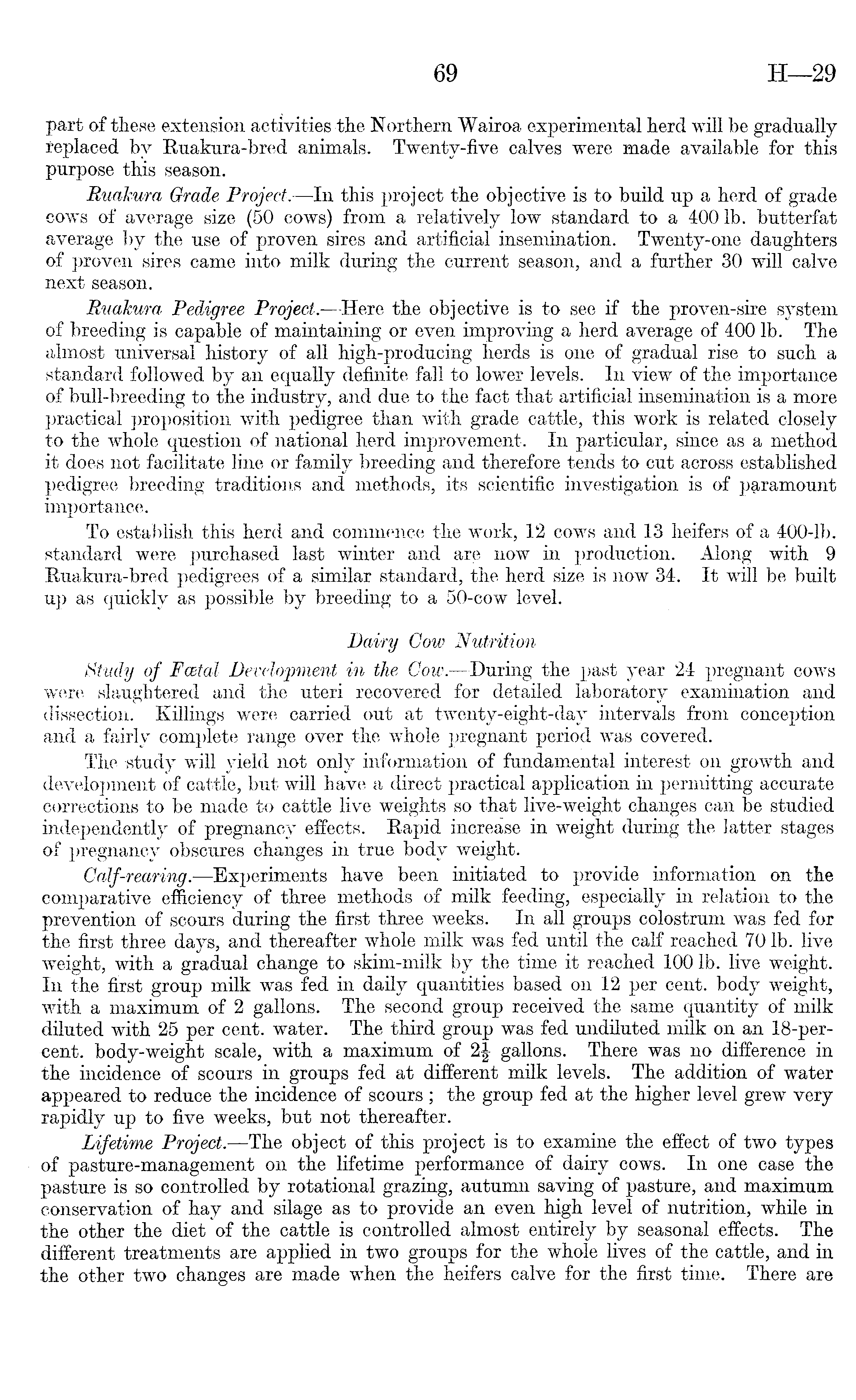 part of these extension activities the Northern Wairoa experimental herd will be gradually replaced by Ruakura-bred animals. Twenty-five calves were made available for this purpose this season. Ruakura Grade Project.—ln this project the objective is to build up a herd of grade cows of average size (50 cows) from a relatively low standard to a 400 lb. butterfat average by the use of proven sires and artificial insemination. Twenty-one daughters of proven sires came into milk during the current season, and a further 30 will calve next season. Ruakura Pedigree Project.- —Here the objective is to see if the proven-sire system of breeding is capable of maintaining or even improving a herd average of 400 lb. The almost universal history of all high-producing herds is one of gradual rise to such a standard followed by an equally definite fall to lower levels. In view of the importance of bull-breeding to the industry, and due to the fact that artificial insemination is a more practical proposition with pedigree than with grade cattle, this work is related closely to the whole question of national herd improvement. In particular, since as a method it does not facilitate line or family breeding and therefore tends to cut across established pedigree breeding traditions and methods, its scientific investigation is of paramount importance. To establish this herd and commence the work, 12 cows and 13 heifers of a 400-lb. standard were purchased last winter and are now in production. Along with 9 Ruakura-bred pedigrees of a similar standard, the herd size is now 34. It will be built up as quickly as possible by breeding to a 50-cow level. Dairy Cow Nutrition Study of Fcetal Development in the Cow. —During the past year 24 pregnant cows were slaughtered and the uteri recovered for detailed laboratory examination and dissection. Killings were carried out at twenty-eight-day intervals from conception and a fairly complete range over the whole pregnant period was covered. The study will yield not only information of fundamental interest on growth and development of cattle, but will have a direct practical application in permitting accurate •corrections to be made to cattle live weights so that live-weight changes can be studied independently of pregnancy effects. Rapid increase in weight during the latter stages of pregnancy obscures changes in true body weight. Calf -rearing.—Experiments have been initiated to provide information on the comparative efficiency of three methods of milk feeding, especially in relation to the prevention of scours during the first three weeks. In all groups colostrum was fed for the first three days, and thereafter whole milk was fed until the calf reached 70 lb. live weight, with a gradual change to skim-milk by the time it reached 100 lb. live weight. In the first group milk was fed in daily quantities based on 12 per cent, body weight, with a ma.Tnmnm of 2 gallons. The second group received the same quantity of milk diluted with 25 per cent, water. The third group was fed undiluted milk on an 18-per-cent. body-weight scale, with a maximum of 2f gallons. There was no difference in the incidence of scours in groups fed at different milk levels. The addition of water appeared to reduce the incidence of scours ; the group fed at the higher level grew very rapidly up to five weeks, but not thereafter. Lifetime Project.—The object of this project is to examine the effect of two types of pasture-management on the lifetime performance of dairy cows. In one case the pasture is so controlled by rotational grazing, autumn saving of pasture, and maximum conservation of hay and silage as to provide an even high level of nutrition, while in the other the diet of the cattle is controlled almost entirely by seasonal effects. The different treatments are applied in two groups for the whole lives of the cattle, and in the other two changes are made when the heifers calve for the first time. There are