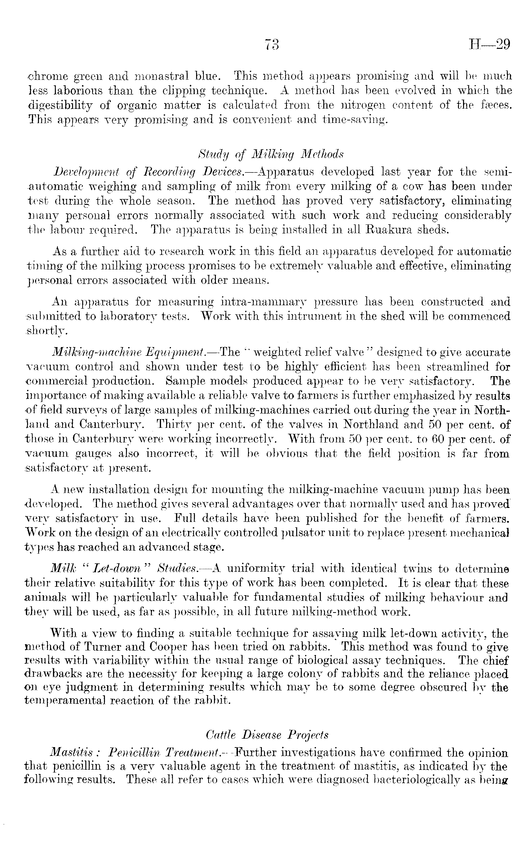 «hrome green and monastral blue. This method appears promising and will be much less laborious than the clipping technique. A method has been evolved in which the digestibility of organic matter is calculated from the nitrogen content of the faeces. "This appears very promising and is convenient and time-saving. Study of Milking Methods Development of Recording Devices. —Apparatus developed last year for the semiautomatic weighing and sampling of milk from every milking of a cow has been under test during the whole season. The method has proved very satisfactory, eliminating many personal errors normally associated with such work and reducing considerably the labour required. The apparatus is being installed in all Kuakura sheds. As a further aid to research work in this field an apparatus developed for automatic timing of the milking process promises to be extremely valuable and effective, eliminating personal errors associated with older means. An apparatus for measuring intra-mammary pressure has been constructed and submitted to laboratory tests. Work with this intrument in the shed will be commenced shortly. Milking-machine Equipment. —The '' weighted relief valve " designed to give accurate vacuum control and shown under test to be highly efficient has been streamlined for commercial production. Sample models produced appear to be very satisfactory. The importance of making available a reliable valve to farmers is further emphasized by results of field surveys of large samples of milking-machines carried out during the year in Northland and Canterbury. Thirty per cent, of the valves in Northland and 50 per cent, of those in Canterbury were working incorrectly. With from 50 per cent, to 60 per cent, of vacuum gauges also incorrect, it will be obvious that the field position is far from satisfactory at present. A new installation design for mounting the milking-machine vacuum pump has been •developed. The method gives several advantages over that normally used and has proved very satisfactory in use. Full details have been published for the benefit of farmers. Work on the design of an electrically controlled pulsator unit to replace present mechanical types has reached an advanced stage. Milk " Let-down " Studies. —A uniformity trial with identical twins to determine their relative suitability for this type of work has been completed. It is clear that these animals will be particularly valuable for fundamental studies of milking behaviour and they will be used, as far as possible, in all future milking-method work. With a view to finding a suitable technique for assaying milk let-down activity, the method of Turner and Cooper has been tried on rabbits. This method was found to give results with variability within the usual range of biological assay techniques. The chief drawbacks are the necessity for keeping a large colony of rabbits and the reliance placed on-eye judgment in determining results which may be to some degree obscured bv the temperamental reaction of the rabbit. Cattle Disease Projects Mastitis : Penicillin Treatment.- —Further investigations have confirmed the opinion that penicillin is a very valuable agent in the treatment of mastitis, as indicated by the following results. These all refer to cases which were diagnosed bacteriologically as beinsr