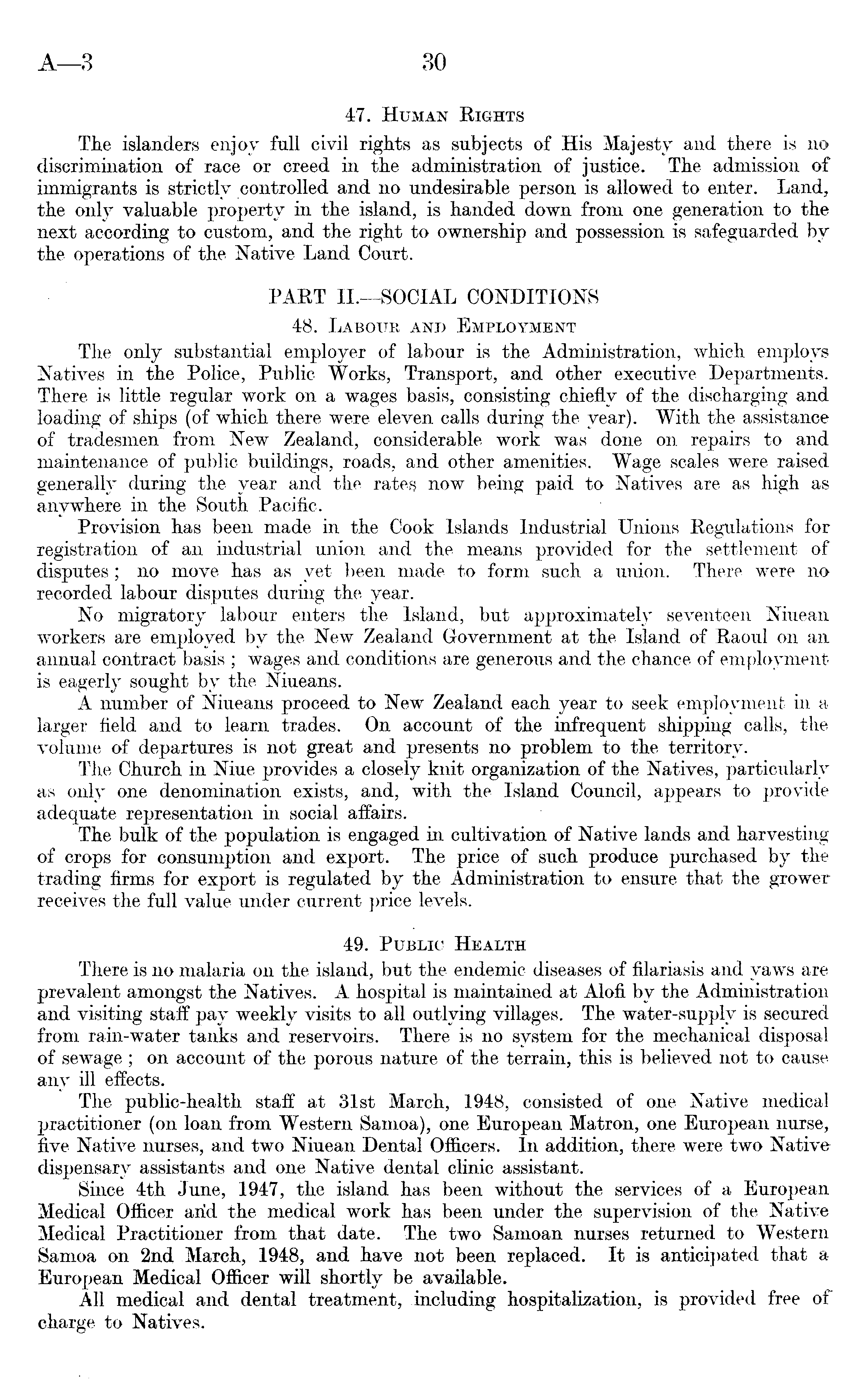 47. Human Rights The islanders enjoy full civil rights as subjects of His Majesty and there is no discrimination of race or creed in the administration of justice. The admission of immigrants is strictly controlled and no undesirable person is allowed to enter. Land, the only valuable property in the island, is handed down from one generation to the next according to custom, and the right to ownership and possession is safeguarded by the operations of the Native Land Court. PART lI.—SOCIAL CONDITIONS 48. Labour and Employment The only substantial employer of labour is the Administration, which employs Natives in the Police, Public Works, Transport, and other executive. Departments. There, is little regular work on a wages basis, consisting chiefly of the discharging and loading of ships (of which there were eleven calls during the year). With the assistance of tradesmen from New Zealand, considerable work was done on repairs to and maintenance of public buildings, roads, and other amenities. Wage scales were, raised generally during the year and the rates now being paid to Natives are as high as anywhere in the South Pacific. Provision has been made in the Cook Islands Industrial Unions Regulations for registration of an industrial union and the means provided for the settlement of disputes ; no move has as yet been made to form such a union. There were no recorded labour disputes during the year. No migratory labour enters the Island, but approximately seventeen Niuean workers are employed by the New Zealand Government at the Island of Raoul on an annual contract basis ; wages and conditions are generous and the chance, of employment is eagerly sought by the Niueans. A number of Niueans proceed to New Zealand each year to seek employment in a larger field and to learn trades. On account of the infrequent shipping calls, the volume of departures is not great and presents no problem to the. territory. The Church in Niue provides a closely knit organization of the Natives, particularly as only one denomination exists, and, with the Island Council, appears to provide adequate representation in social affairs. The bulk of the population is engaged in cultivation of Native lands and harvesting of crops for consumption and export. The price of such produce purchased by the trading firms for export is regulated by the Administration to ensure that the grower receives the full value under current price levels. 49. Public Health There is no malaria on the island, but the endemic diseases of filariasis and yaws are prevalent amongst the Natives. A hospital is maintained at Alofi by the Administration and visiting staff pay weekly visits to all outlying villages. The water-supply is secured from rain-water tanks and reservoirs. There is no system for the mechanical disposal of sewage ; on account of the porous nature of the terrain, this is believed not to cause any ill effects. The public-health staff at 31st March, 1948, consisted of one Native medical practitioner (on loan from Western Samoa), one European Matron, one European nurse, five Native nurses, and two Niuean Dental Officers. In addition, there were two Native dispensary assistants and one Native dental clinic assistant. Since 4th June, 1947, the island has been without the services of a European Medical Officer arid the medical work has been under the supervision of the Native Medical Practitioner from that date. The two Samoan nurses returned to Western Samoa on 2nd March, 1948, and have not been replaced. It is anticipated that a European Medical Officer will shortly be available. All medical and dental treatment, including hospitalization, is provided free of charge to Natives.