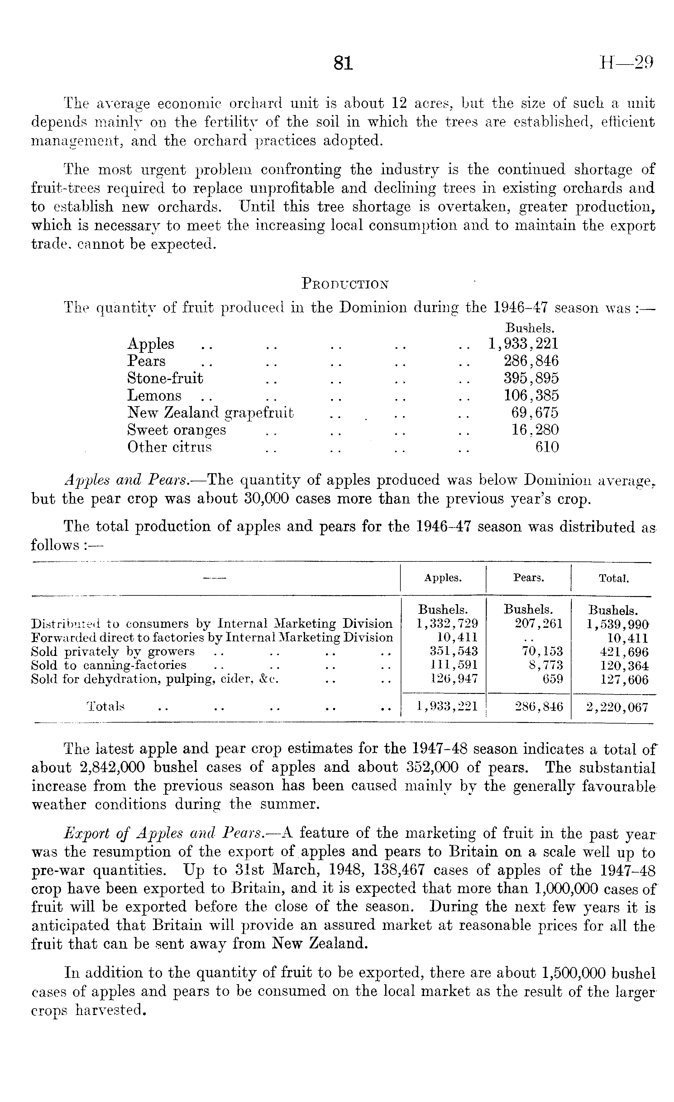 The average economic orchard unit is about 12 acres, but the size of such a unit depends mainly on the fertility of the soil in which the trees are established, efficient management, and the orchard practices adopted. The most urgent problem confronting the industry is the continued shortage of fruit-trees required to replace unprofitable and declining trees in existing orchards and to establish new orchards. Until this tree shortage is overtaken, greater production, which is necessary to meet the increasing local consumption and to maintain the export trade, cannot be expected. Production The quantity of fruit produced in the Dominion during the 1946-47 season was : Bushels. Apples .. .. .. .. .. 1,933,221 Pears .. .. .. .. .. 286,846 Stone-fruit .. .. .. .. 395,895 Lemons .. .. .. .. .. 106,385 New Zealand grapefruit .. . .. .. 69,675 Sweet oranges .. .. .. .. 16,280 Other citrus .. .. .. .. 610 Apples and Pears.- —The quantity of apples produced was below Dominion average, but the pear crop was about 30,000 cases more than the previous year's crop.
