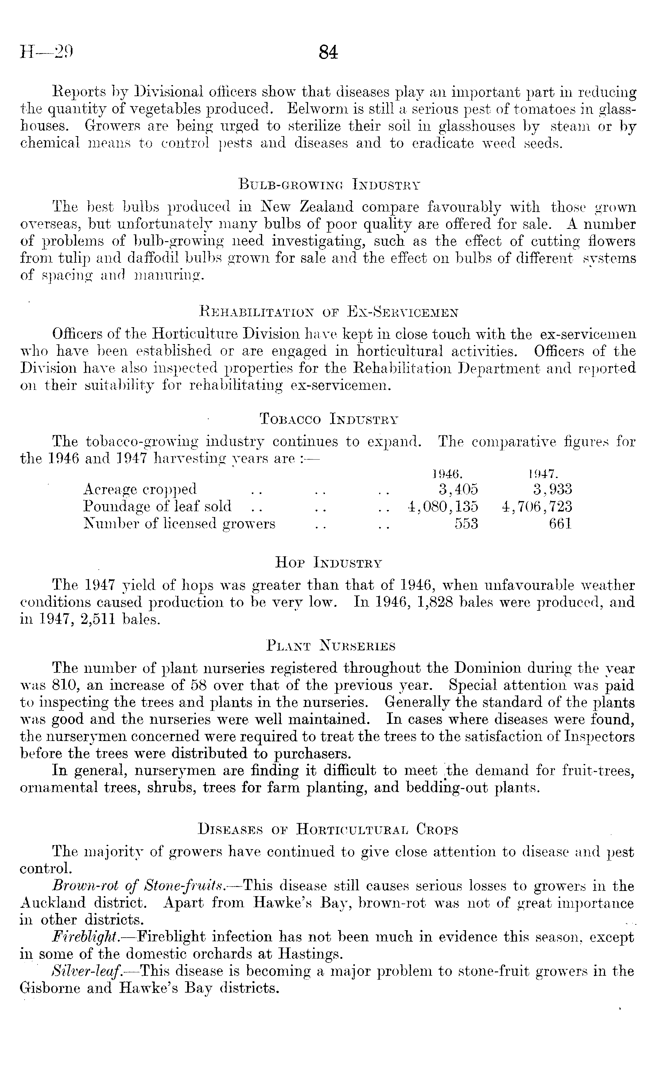 Reports by Divisional officers show that diseases play an important part in reducing the quantity of vegetables produced. Eelworm is still a serious pest of tomatoes in glasshouses. Growers are being urged to sterilize their soil in glasshouses by steam or by chemical means to control pests and diseases and to eradicate weed seeds. Bulb-growing Industry The best bulbs produced in New Zealand compare favourably with those grown overseas, but unfortunately many bulbs of poor quality are offered for sale. A number of problems of bulb-growing need investigating, such as the effect of cutting flowers from tulip and daffodil bulbs grown for sale and the effect on bulbs of different systems of spacing and manuring. Rehabilitation of Ex-Servicemen Officers of the Horticulture Division have kept in close touch with the ex-servicemen who have been established or are engaged in horticultural activities. Officers of the Division have also inspected properties for the Rehabilitation Department and reported on their suitability for rehabilitating ex-servicemen. Tobacco Industry The tobacco-growing industry continues to expand. The comparative figures for the 1946 and 1947 harvesting vears are : 1946. 1947. Acreage cropped .. .. .. 3,405 3,933 Poundage of leaf sold .. .. .. 4,080,135 4,706,723 Number of licensed growers .. .. 553 661 Hop Industry The 1947 yield of hops was greater than that of 1946, when unfavourable weather conditions caused production to be very low. In 1946, 1,828 bales were produced, and in 1947, 2,511 bales. Plant Nurseries The number of plant nurseries registered throughout the Dominion during the year was 810, an increase of 58 over that of the previous year. Special attention was paid to inspecting the trees and plants in the nurseries. Generally the standard of the plants was good and the nurseries were well maintained. In cases where diseases were found, the nurserymen concerned were required to treat the trees to the satisfaction of Inspectors before the trees were distributed to purchasers. In general, nurserymen are finding it difficult to meet ,the demand for fruit-trees, ornamental trees, shrubs, trees for farm planting, and bedding-out plants. Diseases op Horticultural Crops The majority of growers have continued to give close attention to disease and pest control. Brown-rot of Stone-fruits. —This disease still causes serious losses to growers in the Auckland district. Apart from Hawke's Bay, brown-rot was not of great importance in other districts. Fireblight.—Fireblight infection has not been much in evidence this season, except in some of the domestic orchards at Hastings. Silver-leaf. —This disease is becoming a major problem to stone-fruit growers in the Gisborne and Hawke's Bay districts.