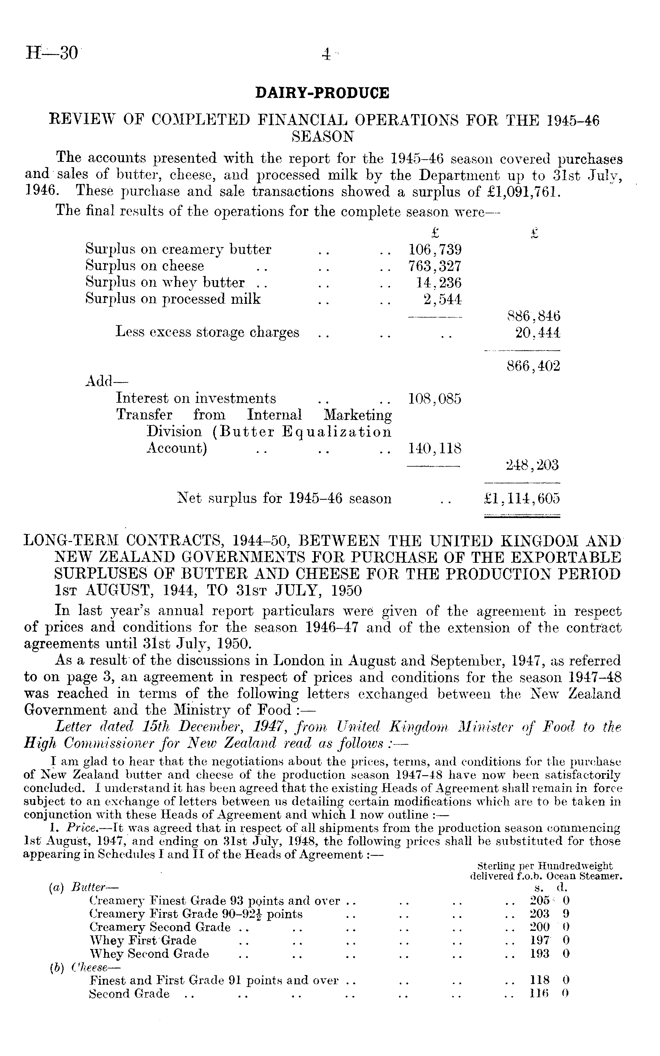 DAIRY-PRODUCE REVIEW OF COMPLETED FINANCIAL OPERATIONS FOR THE 1945-46 SEASON The accounts presented with the report for the 1945-46 season covered purchases and sales of butter, cheese, and processed milk by the Department up to 31st July, 1946. These purchase and sale transactions showed a surplus of £1,091,761. The final results of the operations for the complete season were — £ £ Surplus on creamery butter .. .. 106,739 Surplus on cheese .. .. .. 763,327 Surplus on whey butter .. .. .. 14,236 Surplus on processed milk .. .. 2,544 886,846 Less excess storage charges .. .. .. 20,444 866,402 Add— Interest on investments .. .. 108,085 Transfer from Internal Marketing Division (Butter Equalization Account) .. .. .. 140,118 248,203 Net surplus for 1945-46 season .. £1,114,605 LONG-TERM CONTRACTS, 1944-50, BETWEEN THE UNITED KINGDOM AND NEW ZEALAND GOVERNMENTS FOR PURCHASE OF THE EXPORTABLE SURPLUSES OF BUTTER AND CHEESE FOR THE PRODUCTION PERIOD IST AUGUST, 1944, TO 31ST JULY, 1950 In last year's annual report particulars were given of the agreement in respect of prifees and conditions for the season 1946-47 and of the extension of the contract agreements until 3lst July, 1950. As a result of the discussions in London in August and September, 1947, as referred to on page 3, an agreement in respect of prices and conditions for the season 1947-48 was reached in terms of the following letters exchanged between the New Zealand Government and the Ministry of Food : Letter dated 15th December, 1947, from United Kingdom Minister of Food to the High Commissioner for New Zealand read as follows I am glad to hear that the negotiations about the prices, terms, and conditions for the purchase of New Zealand butter and cheese of the production season 1947-18 have now been satisfactorily concluded. I understand it has been agreed that the existihg Heads of Agreeihent shall remain in force subject to an exchange of letters between us detailing certain modifications which are to be taken in conjunction with these Heads of Agreement and which I now outline : 1. Price.—lt was agreed that in respect of all shipments from the production season commencing Ist' August, 1947, and ending on 31st July, the following prices shall be substituted for those appearing in Schedules I and II of the Heads of AgreementSterling per Hundredweight delivered f.o.b. Ocean Steamer. (a)' Butter*— s. d. Creamery Finest Grade 93 points and over .. .. .. .. 205 ■ 0 Creamery First Grade 90-92j points .. .. .. .. 203 9 Creamery Secbiid Gtade .. .. .. .. .. .. 200 0 Whey First Grade .. .. .. .. .. .. 197' 0 Whey Second Grade .. .. .. .. .. .. 193 0 (b) Cheese — Finest and First Grade 91 points and over .. .. .. ..1180 Second Grade .. .. .. .. .. .. .. 116 0