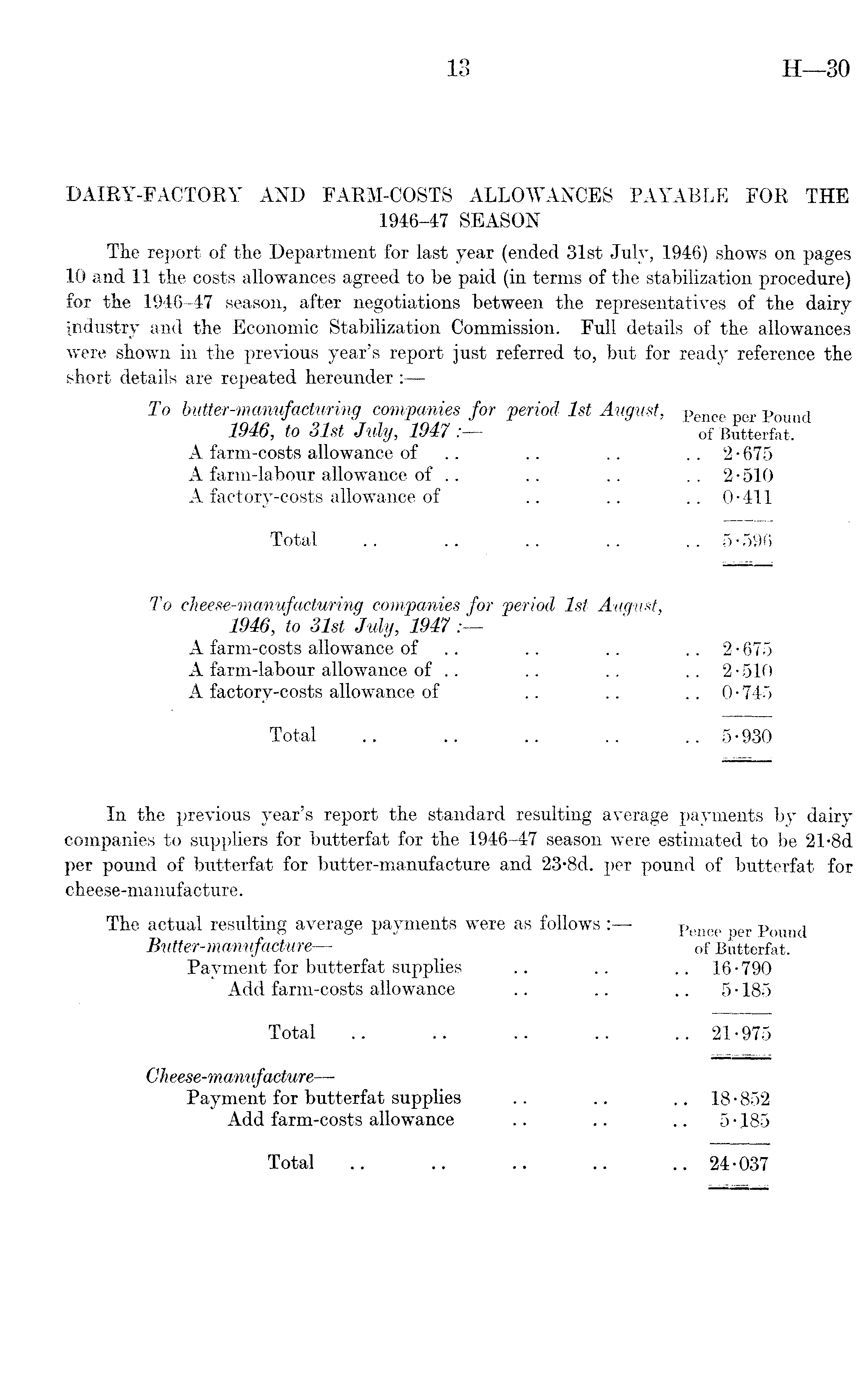 DAIRY-FACTORY AND FARM-COSTS ALLOWANCES PAYABLE FOR THE 1946-47 SEASON The report of the Department for last year (ended 31st July, 1946) shows on pages 10 and 11 the costs allowances agreed to be paid (in terms of the stabilization procedure) for the 1946-47 season, after negotiations between the representatives of the dairyindustry and the Economic Stabilization Commission. Full details of the allowances were shown in the previous year's report just referred to, but for ready reference the short details are repeated hereunder : To butter-manufacturing companies for period Ist August, p ence per p oU nd 1946, to 31st July, 1947 : of Butterfat. A farm-costs allowance of .. .. .. ..2-675 A farm-labour allowance of .. .. .. .. 2-510 A factory-costs allowance of .. .. ..0-411 Total .. .. .. .. .. 5-596 To cheese-manufacturing companies for period Ist August, 1946, to 31st July, 1947 A farm-costs allowance of .. .. .. ..2-675 A farm-labour allowance of .. .. .. 2-510 A factory-costs allowance of .. .. .. 0-745 Total .. .. .. .. .. 5-930 In the previous year's report the standard resulting average payments by dairy companies to suppliers for butterfat for the 1946-47 season were estimated to be 21-8 d per pound of butterfat for butter-manufacture and 23-Bd. per pound of butterfat for cheese-manufacture. The actual resulting average payments were as follows : Pence per Pound Butter-manufacture — of .Butterfat. Payment for butterfat supplies .. .. .. 16-790 Add farm-costs allowance .. .. .. 5 • 185 Total .. .. .. .. .. 21-975 Cheese-manufacture — Payment for butterfat supplies .. .. .. 18-852 Add farm-costs allowance .. .. .. 5-185 Total .. .. .. .. .. 24-037