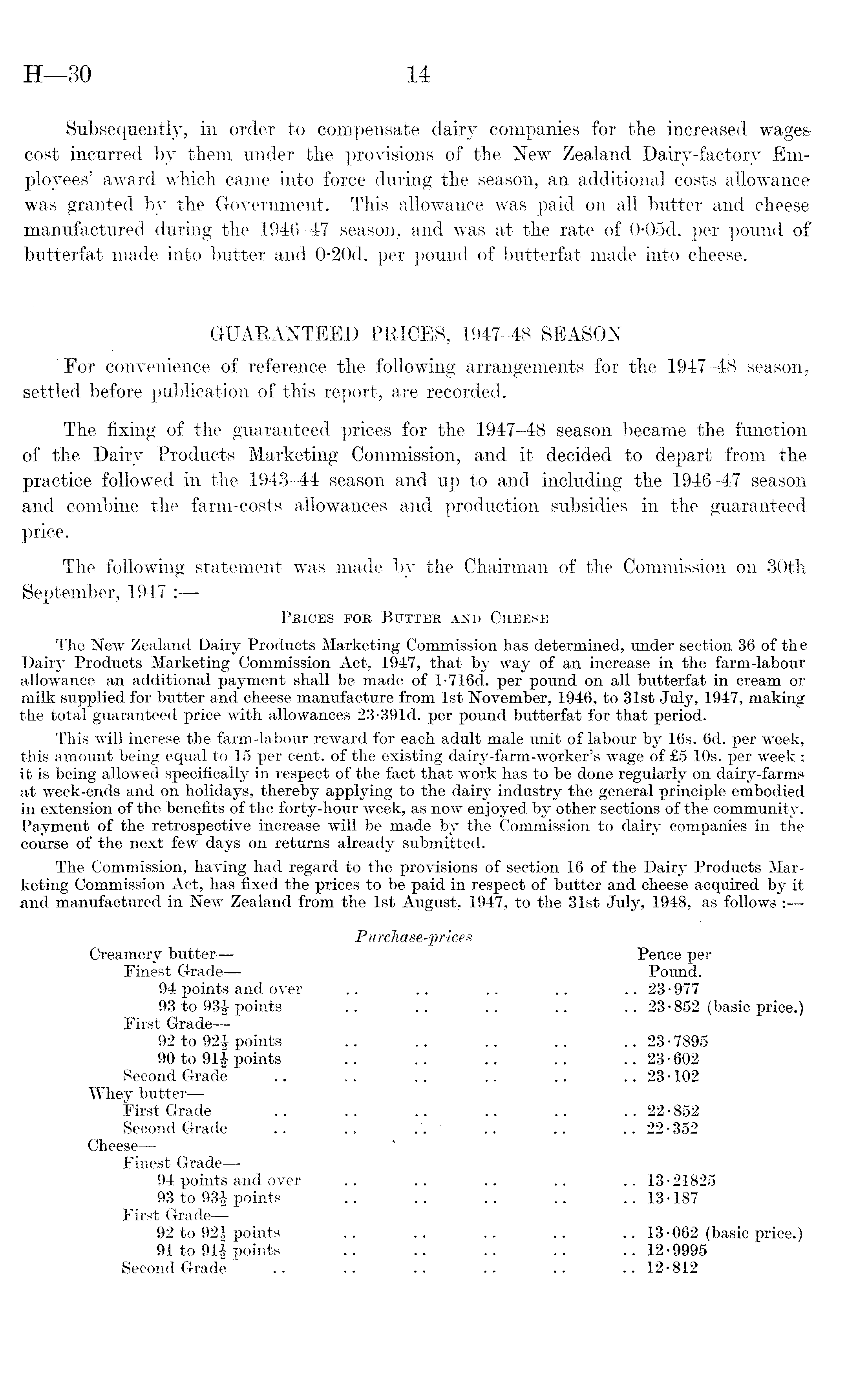 Subsequently, in order to compensate dairy companies for the increased wages cost incurred by them under the provisions of the New Zealand Dairy-factory Employees' award which came into force during the season, an additional costs allowance was granted by the Government. This allowance was paid on all butter and cheese manufactured during the 1946-47 season, and was at the rate of 0-05 d. per pound of butterfat made into butter and O2od. per pound of butterfat made into cheese. GUARANTEED PRICES, 1947-48 SEASON For convenience of reference the following arrangements for the 1947-48 season, settled before publication of this report, are recorded. The fixing of the guaranteed prices for the 1947-48 season became the function of the Dairy Products Marketing Commission, and it decided to depart from the practice followed in the 1943-44 season and up to and including the 1946-47 season and combine the farm-costs allowances and production subsidies in the guaranteed price. The following statement was made by the Chairman of the Commission on 30th September, 1947 : Prices fob Butter and Cheese The New Zealand Dairy Products Marketing Commission has determined, under section 36 of the Dairy Products Marketing Commission Act, 1947, that by way of an increase in the farm-labour allowance an additional payment shall be made of l-716d. per pound on all butterfat in cream or miik supplied for butter and cheese manufacture from Ist November, 1946, to 31st July, 1947, making the total guaranteed price with allowances 23-391 d. per pound butterfat for that period. This will increse the farm-labour reward for each adult male unit of labour by 16s. 6d. per week, this amount being equal to 15 per cent, of the existing dairy-farm-worker's wage of £5 10s. per week ; it is being allowed specifically in respect of the fact that work has to be done regularly on dairy-farms at week-ends and on holidays, thereby applying to the dairy industry the general principle embodied in extension of the benefits of the forty-hour week, as now enjoyed by other sections of the community. Payment of the retrospective increase will be made by the Commission to dairy companies in the course of the next few days on returns already submitted. The Commission, having had regard to the provisions of section 16 of the Dairy Products Marketing Commission Act, has fixed the prices to be paid in respect of butter and cheese acquired by it and manufactured in New Zealand from the Ist August, 1947, to the 31st July, 1948, as follows : Ptirchase-prices Creamery butter — Pence per Finest Grade— Pound. 94 points and over .. .. .. .. .. 23 • 977 93 to 93£ points .. .. .. .. .. 23-852 (basic price.) First Grade—--92 to 92J points .. .. .. .. .. 23-7895 90 to 9lf points .. .. .. .. .. 23-602 Second Grade .. .. .. .. .. .. 23 • 102 Whey butter— First Grade .. .. .. .. .. .. 22 • 852 Second Grade .. .. • .. .. .. 22-352 Cheese — Finest Grade—--94 points and over .. .. .. .. .. 13-21825 93 to 93J points .. .. .. .. .. 13-187 First Grade—--92 to 92£ points .. .. .. .. .. 13-062 (basic price.) 91 to 91l points .. .. .. .. .. 12-9995 Second Grade .. .. .. .. .. .. 12-812