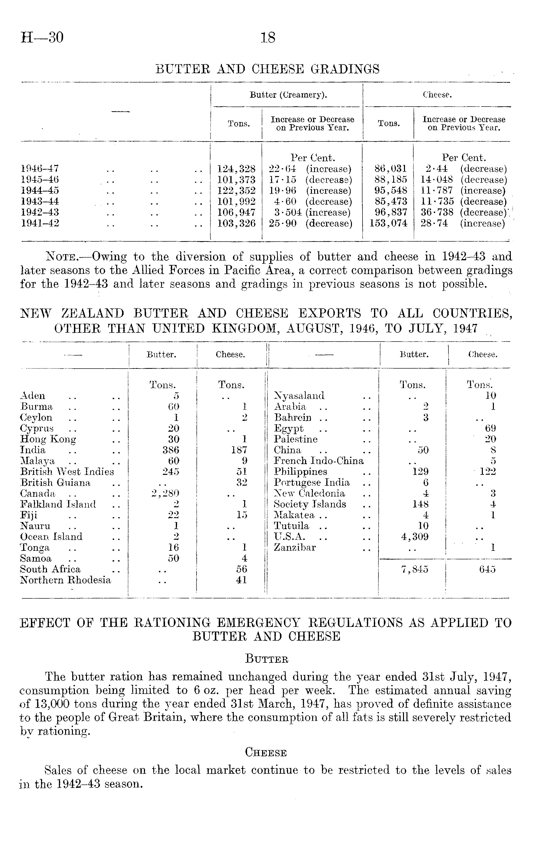 EFFECT OF THE RATIONING EMERGENCY REGULATIONS AS APPLIED TO BUTTER AND CHEESE Butter The butter ration has remained unchanged during the year ended 31st July, 1947, consumption being limited to 6 oz. per head per week. The estimated annual saving of 13,000 tons during the year ended 31st March, 1947, has proved of definite assistance to the people of Great Britain, where the consumption of all fats is still severely restricted by rationing. Cheese Sales of cheese on the local market continue to be restricted to the levels of sales in the 1942-43 season.