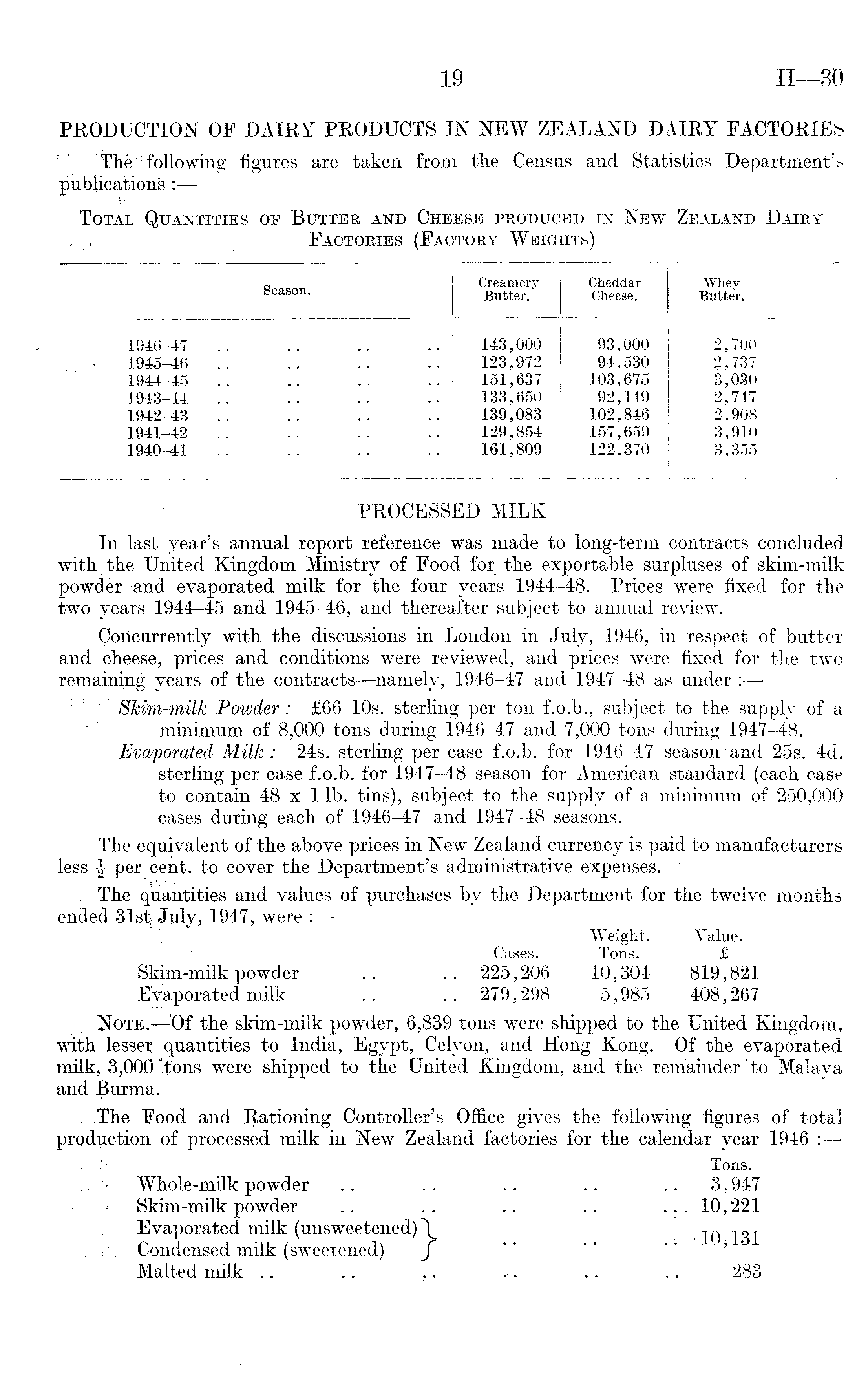PRODUCTION OF DAIRY PRODUCTS IN NEW ZEALAND DAIRY FACTORIES The following figures are taken from the Census and Statistics Department's publications:—