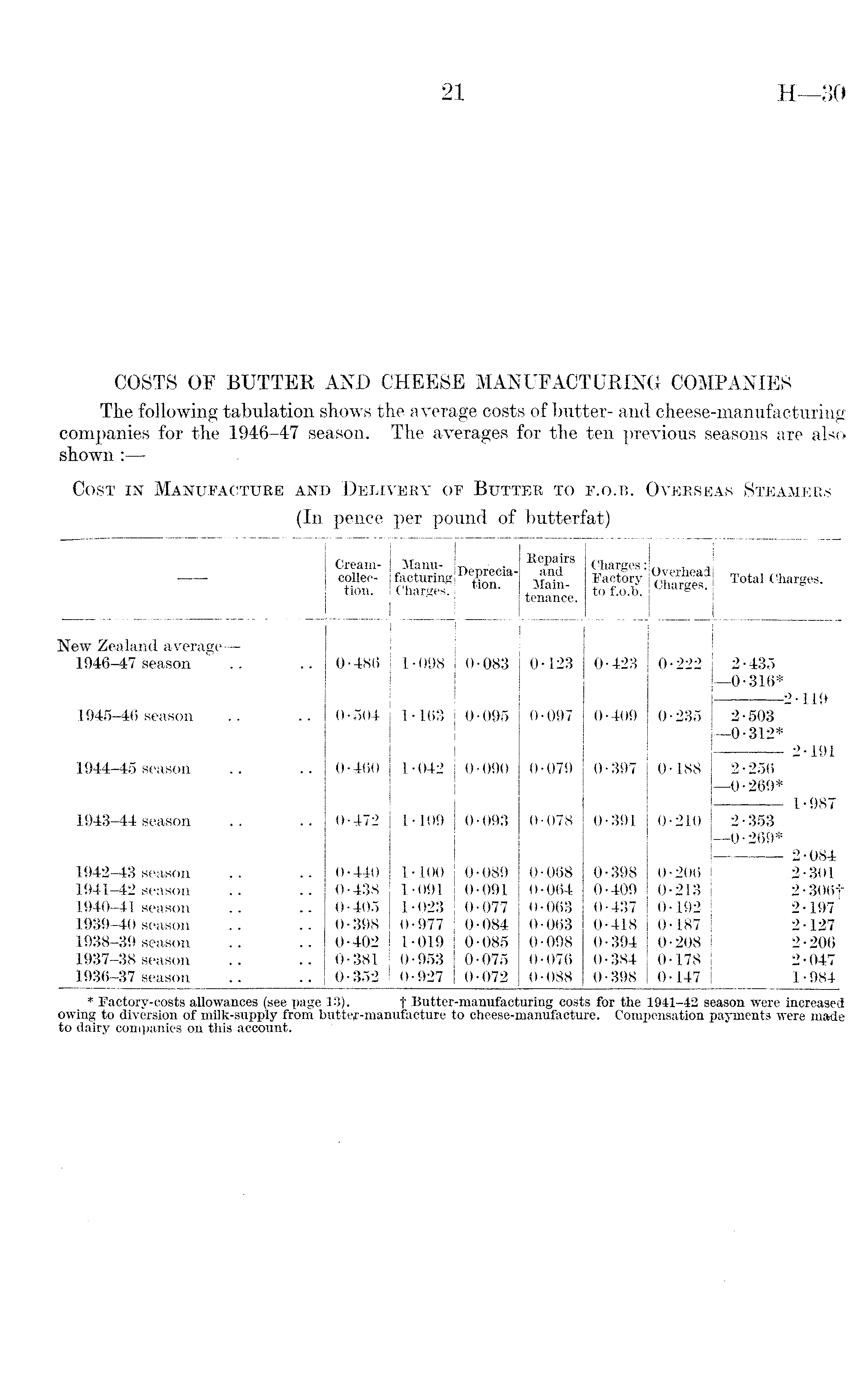 (In pence per pound of butterfat) — collection. Manufacturing Charges. Depreciation. Repairs and Maintenance. Charges: Factory to f.o.b. Overhead Charges. Total Charges. New Zealand average— | 1946-47 season 0-486 1 098 0-083 0-123 0-423 0-222 2 •435 —0 ■316* 2-119 1945-46 season 0-504 1 163 0-095 0-097 0-409 0-235 2' •503 —0 ■312* 2-191 1944-45 season 0-460 1 042 0-090 0-079 0-397 0-188 2•256 —0 ■269* 1-987 1943-44 season 0-472 1 ■109 0-093 0-078 0-391 0-210 %• 353 —0' ■269* 2-084 1942-43 season 0-440 1 •100 0-089 0-068 0-398 0-206 2-301 1941—42 season 0-438 1 •091 0-091 0-064 0-409 0-213 2-306f 1940-41 season 0-405 1 023 0-077 0-063 0-437 0-192 2-197 1939-40 season 0-398 0' ■977 0-084 0-063 0-418 0-187 2-127 1938-39 season 0-402 I■019 0-085 0-098 0-394 0-208 2-206 1937-38 season 0-381 0•953 0-075 0-076 0-384 0-178 2-047 1936-37 season 0-352 0' •927 0-072 0-088 0-398 0-147 1-984 * Factory-costs allowances (see page 13). t Butter-manufacturing costs for the 1941-42 season were increased owing to diversion of milk-supply from butter-manufacture to cheese-manufacture. Compensation payments were made to dairy companies on this account.