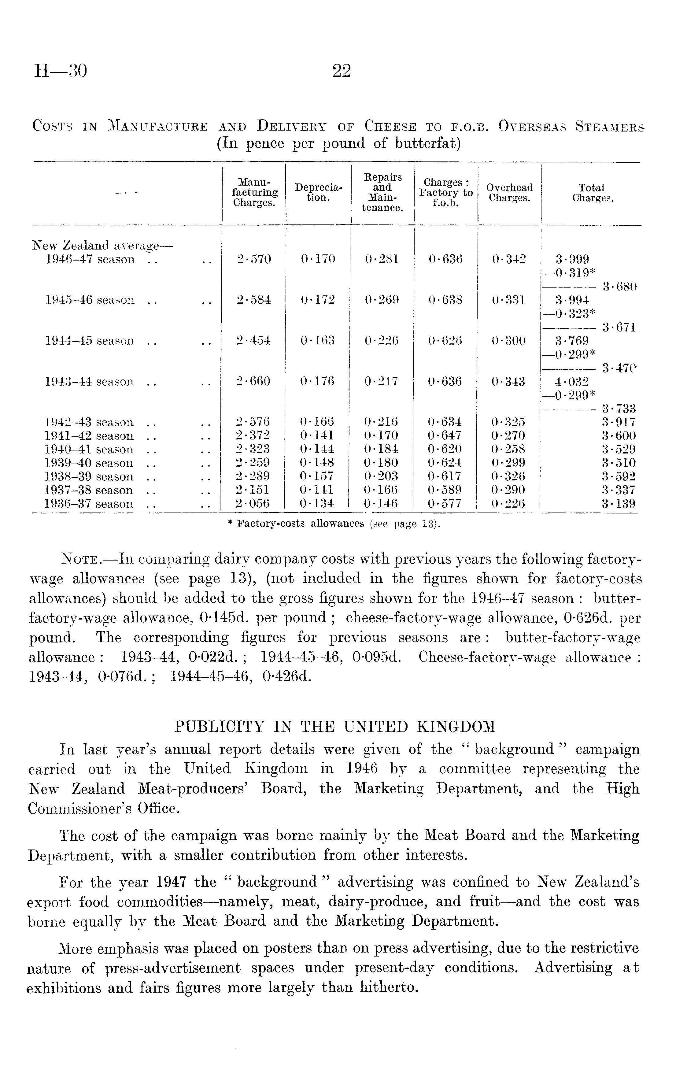 (In pence per pound of butterfat) — Manufacturing Charges. Depreciation. Repairs and Maintenance. Charges: Factory to f.o.b. 1 Overhead Charges. Total Charges. New Zealand average— 1946-47 season 2-570 0-170 0-281 0-636 0-342 3-999 —0-319* 3-680 3-671 3-470 3-733 3-917 3-600 3-529 3-510 3-592 3-337 3-139 1945-46 season 2-584 0-172 0-269 0-638 0-331 3-994 —0-323* 1944-45 season 2-454 0-163 0-226 0-626 0-300 3-769 —0-299* 1943-44 season 2-660 0-176 0-217 0-636 0-343 4-032 —0-299* 1942-43 season 1941-42 season 1940-41 season 1939-40 season 1938-39 season 1937-38 season 1936-37 season 2-576 2-372 2-323 2-259 2-289 2-151 2-056 0-166 0-141 0-144 0-148 0-157 0-141 0-134 0-216 0-170 0-184 0-180 0-203 0-166 0-146 0-634 0-647 0-620 0-624 0-617 0-589 0-577 0-325 0-270 0-258 0-299 0-326 0-290 0-226 * Factory-costs allowances (see pag< 5 13).