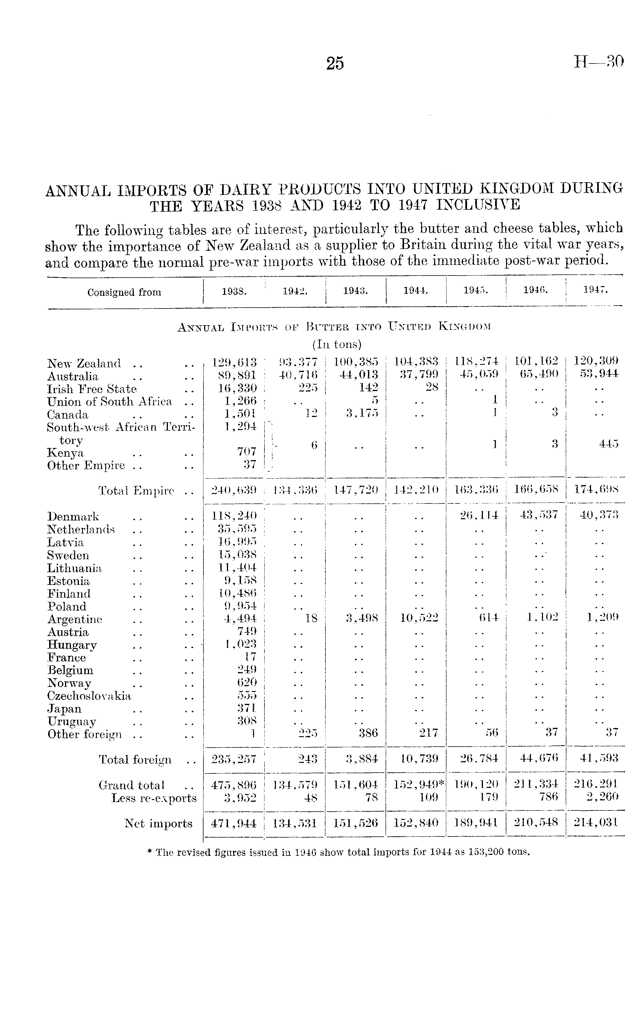 ANNUAL IMPORTS OF DAIRY PRODUCTS INTO UNITED KINGDOM DURING THE YEARS 1938 AND 1942 TO 1947 INCLUSIVE The following tables are of interest, particularly the butter and cheese tables, which show the importance of New Zealand as a supplier to Britain during the vital war years, and compare the normal pre-war imports with those of the immediate post-war period.