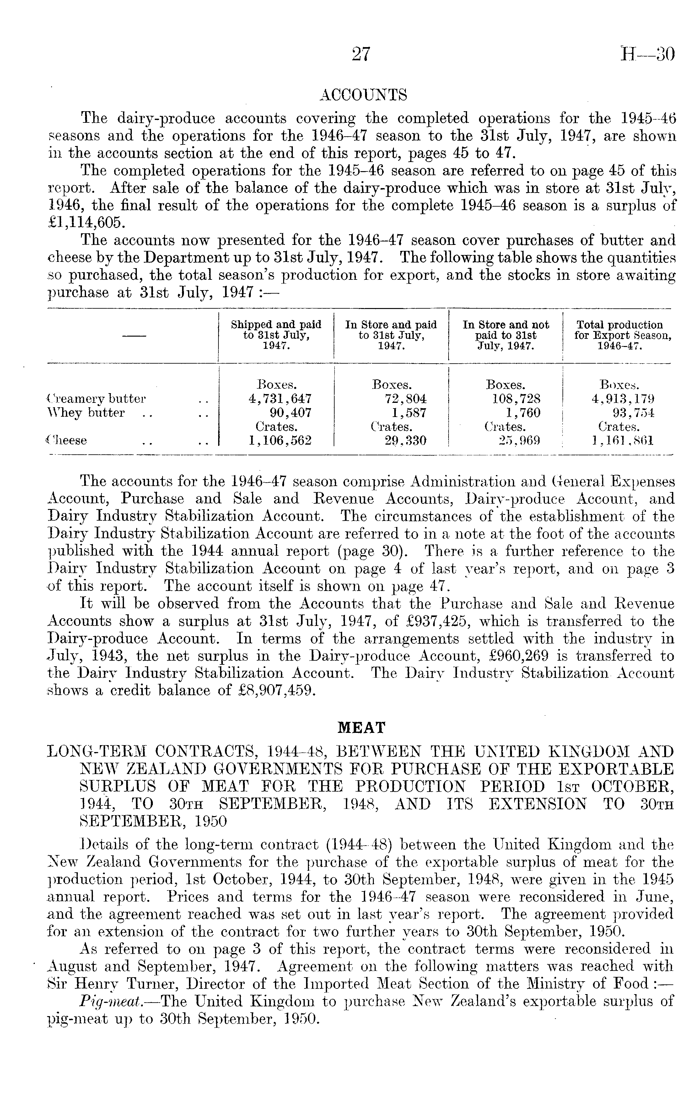The accounts for the 1946-47 season comprise Administration and General Expenses Account, Purchase and Sale and Revenue Accounts, Dairy-produce Account, and Dairy Industry Stabilization Account. The circumstances of the establishment of the Dairy Industry Stabilization Account are referred to in a note at the foot of the accounts published with the 1944 annual report (page 30). There is a further reference to the Dairy Industry Stabilization Account on page 4 of last year's report, and on page 3 of this report. The account itself is shown on page 47. It will be observed from the Accounts that the Purchase and Sale and Revenue Accounts show a surplus at 31st July, 1947, of £937,425, which is transferred to the Dairy-produce Account. In terms of the arrangements settled with the industry in July, 1943, the net surplus in the Dairy-produce Account, £960,269 is transferred to the Dairy Industry Stabilization Account. The Dairy Industry Stabilization Account shows a credit balance of £8,907,459. MEAT LONG-TERM CONTRACTS, 1944-48, BETWEEN THE UNITED KINGDOM AND NEW ZEALAND GOVERNMENTS FOR PURCHASE OF THE EXPORTABLE SURPLUS OF MEAT FOR THE PRODUCTION PERIOD IST OCTOBER, 1944, TO 30TH SEPTEMBER, 1948, AND ITS EXTENSION TO 30th SEPTEMBER, 1950 Details of the long-term contract (1944-48) between the United Kingdom and the New Zealand Governments for the purchase of the exportable surplus of meat for the production period, Ist October, 1944, to 30th September, 1948, were given in the 1945 annual report. Prices and terms for the 1946-47 season were reconsidered in June, and the agreement reached was set out in last year's report. The agreement provided for an extension of the contract for two further years to 30th September, 1950. As referred to on page 3 of this report, the contract terms were reconsidered in August and September, 1947. Agreement on the following matters was reached with Sir Henry Turner, Director of the Imported Meat Section of the Ministry of Food: — Pig-meat.—The United Kingdom to purchase New Zealand's exportable surplus of pig-meat up to 30th September, 1950.
