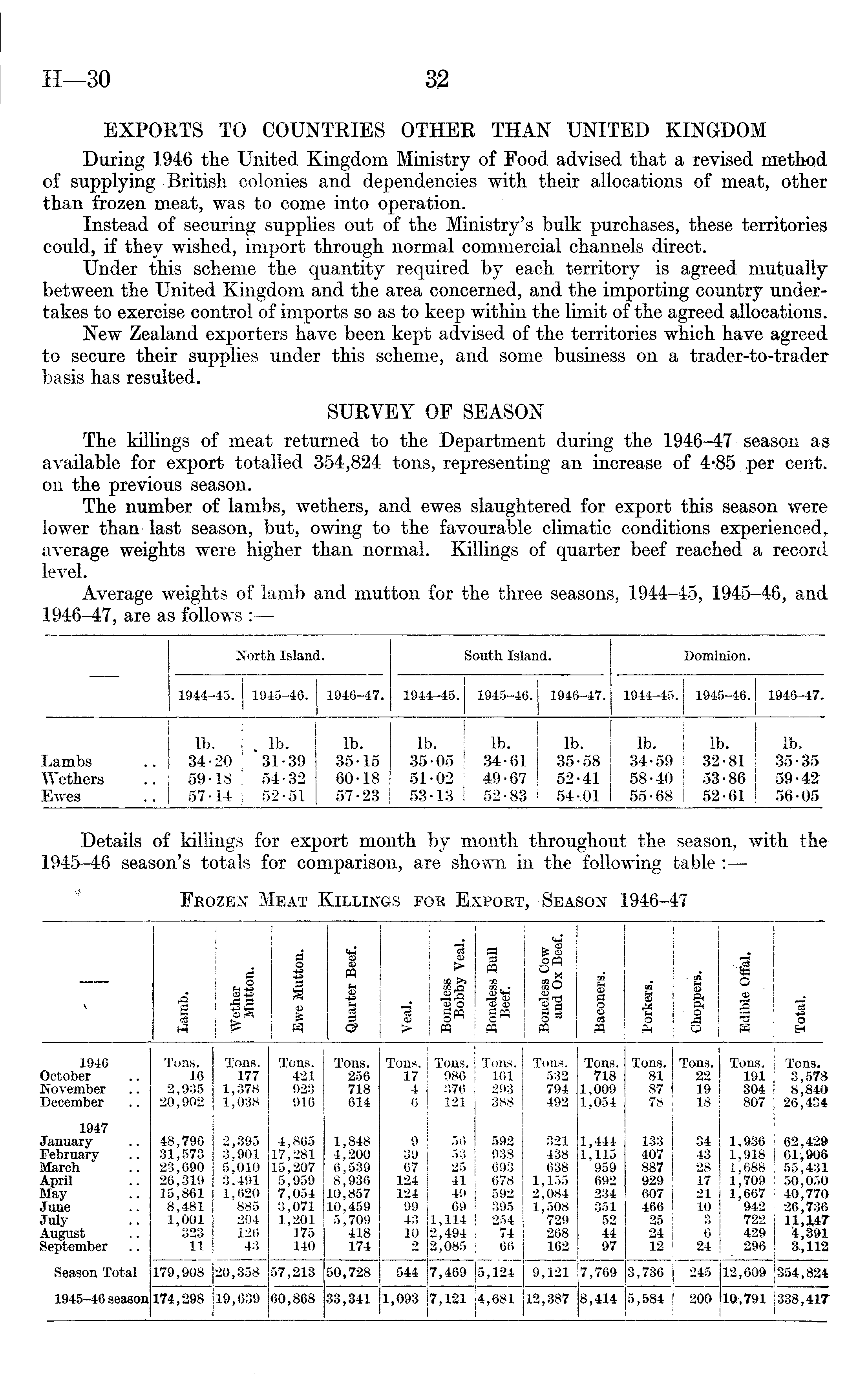 EXPORTS TO COUNTRIES OTHER THAN UNITED KINGDOM During 1946 the United Kingdom Ministry of Food advised that a revised method of supplying British colonies and dependencies with their allocations of meat, other than frozen meat, was to come into operation. Instead of securing supplies out of the Ministry's bulk purchases, these territories could, if they wished, import through normal commercial channels direct. Under this scheme the quantity required by each territory is agreed mutually between the United Kingdom and the area concerned, and the importing country undertakes to exercise control of imports so as to keep within the limit of the agreed allocations. New Zealand exporters have been kept advised of the territories which have agreed to secure their supplies under this scheme, and some business on a trader-to-trader basis has resulted. SURVEY OF SEASON The killings of meat returned to the Department during the 1946-47 season as available for export totalled 354,824 tons, representing an increase of 4*85 per cent, on the previous season. The number of lambs, wethers, and ewes slaughtered for export this season were lower than last season, but, owing to the favourable climatic conditions experienced, average weights were higher than normal. Killings of quarter beef reached a record level. Average weights of lamb and mutton for the three seasons, 1944-45, 1945-46, and 1946-47, are as follows :