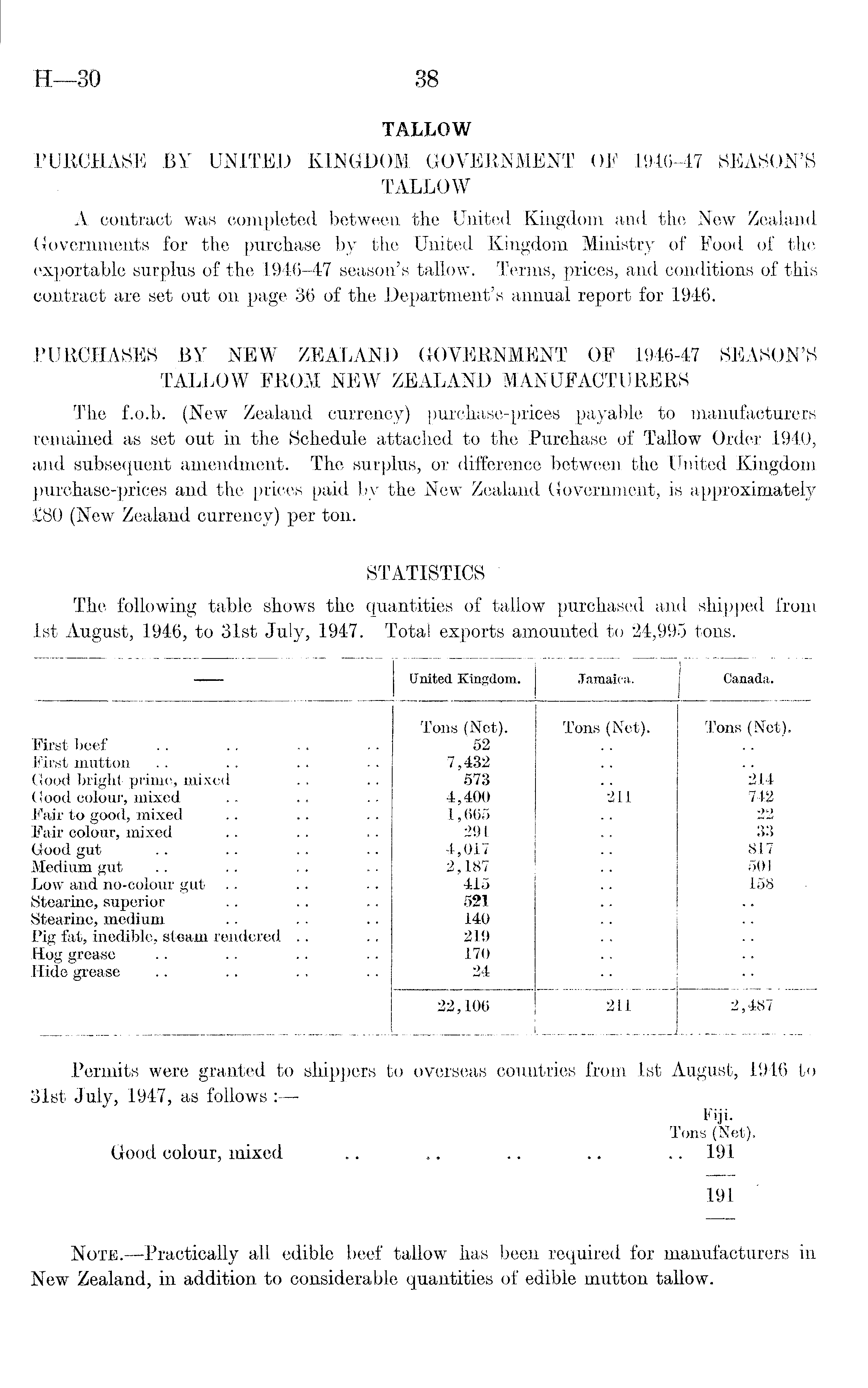 Permits were granted to shippers to overseas countries from Ist August, 1946 to 31st July, 1947, as follows : Fiji. Tons (Net). Good colour, mixed .. .. .. .. .. 191 191 Note.—Practically all edible beef tallow lias been required for manufacturers in New Zealand, in addition to considerable quantities of edible mutton tallow.