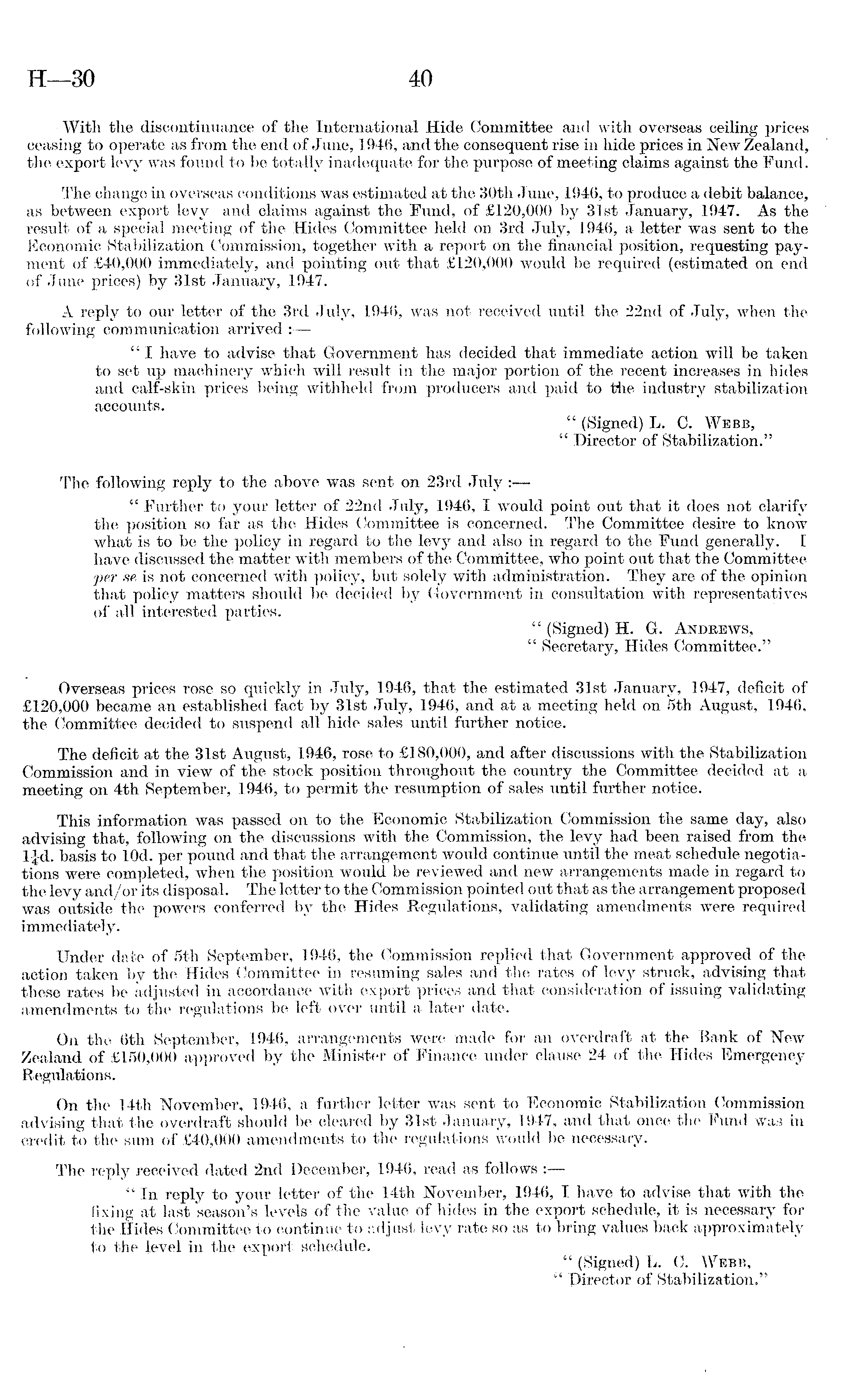 With the discontinuance of the International Hide Committee and with overseas ceiling prices ceasing to operate as from the end of June, 1946, and the consequent rise in hide prices in New Zealand, the export levy was found to be totally inadequate for the purpose of meeting claims against the Fund. The change in overseas conditions was estimated at the 30th June, 1946, to produce a debit balance, as between export levy and claims against the Fund, of £120,000 by 31st January, 1947. As the result of a special meeting of the Hides Committee held on 3rd July, 1946, a letter was sent to the Economic Stabilization Commission, together with a report on the financial position, requesting payment of £40,000 immediately, and pointing out that £120,000 would be required (estimated on end of June prices) by 31st January, 1947. A reply to our letter of the 3rd July, 1946, was not received until the 22nd of July, when the following communication arrived : " I have to advise that Government has decided that immediate action will be taken to set up machinery which will result in the major portion of the recent increases in hides and calf-skin prices being withheld from producers and paid to the industry stabilization accounts. " (Signed) L. C. Webb, " Director of Stabilization." The following reply to the above was sent on 23rd July : " Further to your letter of 22nd July, 1946, I would point out that it does not clarify the position so far as the Hides Committee is concerned. The Committee desire to know what is to be the policy in regard to the levy and also in regard to the Fund generally. I have discussed the matter with members of the Committee, who point out that the Committee per se is not concerned with policy, but solely with administration. They are of the opinion that policy matters should be decided by Government in consultation with representatives of all interested parties. " (Signed) H. G. Andrews, " Secretary, Hides Committee." Overseas prices rose so quickly in July, 1946, that the estimated 31st January, 1947, deficit of £120,000 became an established fact by 31st July, 1946, and at a meeting held on sth August, 1946, the Committee decided to suspend all hide sales until further notice. The deficit at the 31st August, 1946, rose to £lBO,OOO, and after discussions with the Stabilization Commission and in view of the stock position throughout the country the Committee decided at a meeting on 4th September, 194-6, to permit the resumption of sales until further notice. This information was passed on to the Economic Stabilization Commission the same day, also advising that, following on the discussions with the Commission, the levy had been raised from the lid. basis to lOd. per pound and that the arrangement would continue until the meat schedule negotiations were completed, when the position would be reviewed and new arrangements made in regard to the levy and/or its disposal. The letter to the Commission pointed out that as the arrangement proposed was outside the powers conferred by the Hides Regulations, validating amendments were required immediately. Under date of sth September, 1946, the Commission replied that Government approved of the action taken by the Hides Committee in resuming sales and the rates of levy struck, advising that these rates be adjusted in accordance with export prices and that consideration of issuing validating amendments to the regulations be left over until a later date. On the 6th September, 1946, arrangements were made for an overdraft at the Bank of New Zealand of £150,000 approved by the Minister of Finance under clause 24 of the Hides Emergency Regulations. On "the 14th November, 1946, a further letter was sent to Economic Stabilization Commission advising that the overdraft should be cleared by 31st January, 1947, and that once the Fund was in credit to the sum of £40,000 amendments to the regulations would be necessary. The reply received dated 2nd December, 1946, read as follows : " In reply to your letter of the 14th November, 1946, I have to advise that with the fixing at last season's levels of the value of hides in the export schedule, it is necessary for the Hides Committee to continue to adjust levy rate so as to bring values back approximately to the level in the export schedule. " (Signed) L. C. Webb, " Director of Stabilization."