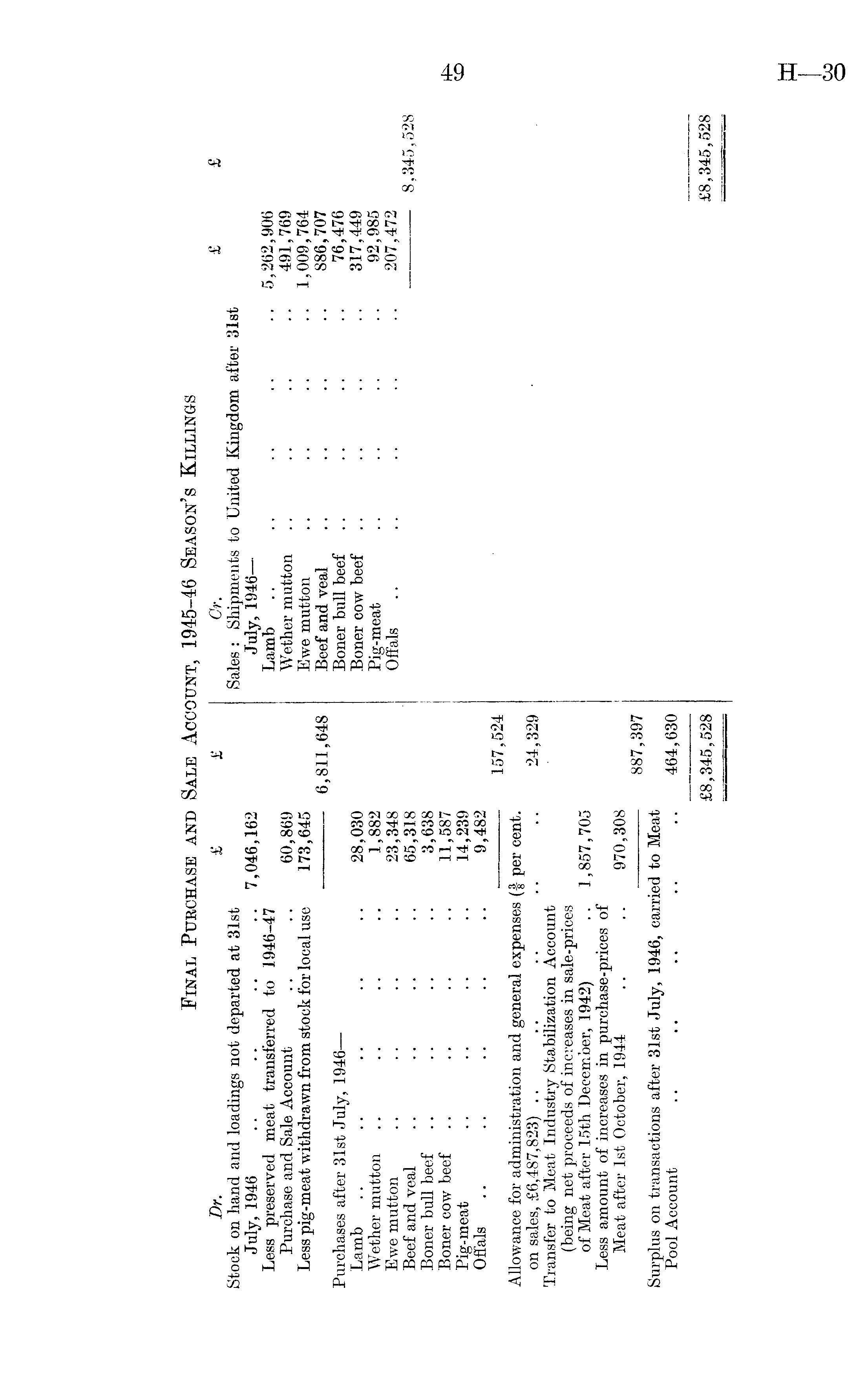 Final Purchase and Sale Account, 1945-46 Season's Killings Dr. £ £ Cr. £ £ Stock on hand and loadings not departed at 31st Sales : Shipments to United Kingdom after 31st July, 1946 .. .. .. .. 7,046,162 July, 1946 Less preserved meat transferred to 1946-47 Lamb .. .. .. .. .. 5,262,906 Purchase and Sale Account .. .. 60,869 Wether mutton .. .. .. .. 491,769 Less pig-meat withdrawn from stock for local use 173,645 Ewe mutton .. .. .. .. 1,009,764 6,811,648 Beef and veal .. .. .. .. 886,707 Purchases after 31st July, 1946— Boner bull beef . . .. .. .. 76,476 Lamb .. .. .. .. .. 28,030 Boner cow beef .. .. .. .. 317,449 Wether mutton .. .. .. ... 1,882 Pig-meat .. .. .. .. 92,985 Ewe mutton .. .. .. .. 23,348 Offals .. .. .. .. .. 207,472 Beef and veal .. .. .. .. 65,318 8,345,528 Boner bull beef .. .. .. .. 3,638 Boner cow beef .. .. .. .. 11,587 Pig-meat .. .. .. .. 14,239 Offals .. .. .. .. .. 9,482 157,524 Allowance for administration and general expenses (f per cent. on sales, £6,487,823) .. .. .. .. .. 24,329 Transfer to Meat Industry Stabilization Account (being net proceeds of increases in sale-prices of Meat after 15th December, 1942) .. 1,857, 705 Less amount of increases in purchase-prices of Meat after Ist October, 1944 .. .. 970,308 887,397 Surplus on transactions after 31st July, 1946, carried to Meat Pool Account .. .. .. .. .. 464,630 £8,345,528 £8,345,528