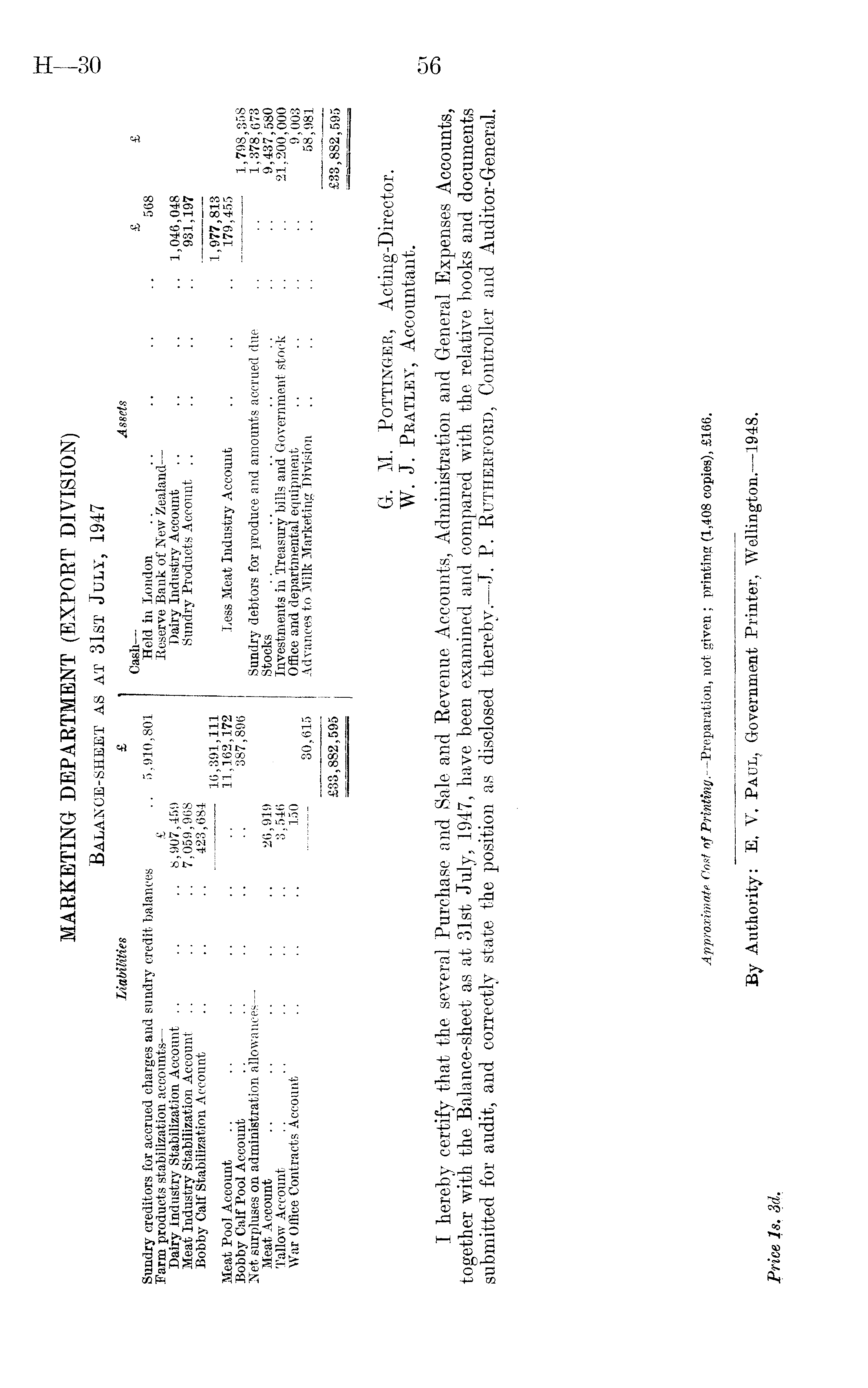 MARKETING DEPARTMENT (EXPORT DIVISION) Balance-sheet as at 31st July, 1947 Liabilities & Assets Cash— £ £ Sundry creditors for accrued charges and sundry credit balances .. 5,910,801 Held in London .. .. .. .. .. 568 Farm products stabilization accounts— £ Reserve Bank of New Zealand— Dairy Industry Stabilization Account .. .. .. 8,907,459 Dairy Industry Account .. .. .. .. 1,046,048 Meat Industry Stabilization Account .. .. .. 7,059,968 Sundry Products Account .. .. .. .. 931,197 Bobby Calf Stabilization Account .. .. .. 423,684 16,391,111 1,977,813 Meat Pool Account .. .. .. .. .. .. 11,162,172 Less Meat Industry Account .. .. .. 179,455 Bobby Calf Pool Account .. .. .. .. .. 387,896 1,798,358 Net surpluses on administration allowances— Sundry debtors for produce and amounts accrued due .. .. 1,378,673 Meat Account .. .. .. .. .. 26,919 . Stocks .. .. .. .. .. .. .. 9,437,580 Tallow Account .. .. .. .. .. 3,546 Investments in Treasury bills and Government stock .. .. 21,200,000 War Office Contracts Account .. .. .. 150 Office and departmental equipment .. .. .. .. 9,003 30,615 Advances to Milk Marketing Division .. .. .. .. 58,981 £33,882,595 £33,882,595 1 ===== G. M. POTTINGER, Acting-Director. W. J. Pratley, Accountant. I hereby certify that the several Purchase and Sale and Revenue Accounts, Administration and General Expenses Accounts, together with the Balance-sheet as at 31st July, 1947, have been examined and compared with the relative books and documents submitted for audit, and correctly state the position as disclosed thereby.— J. P. Rutherford, Controller and Auditor-General.