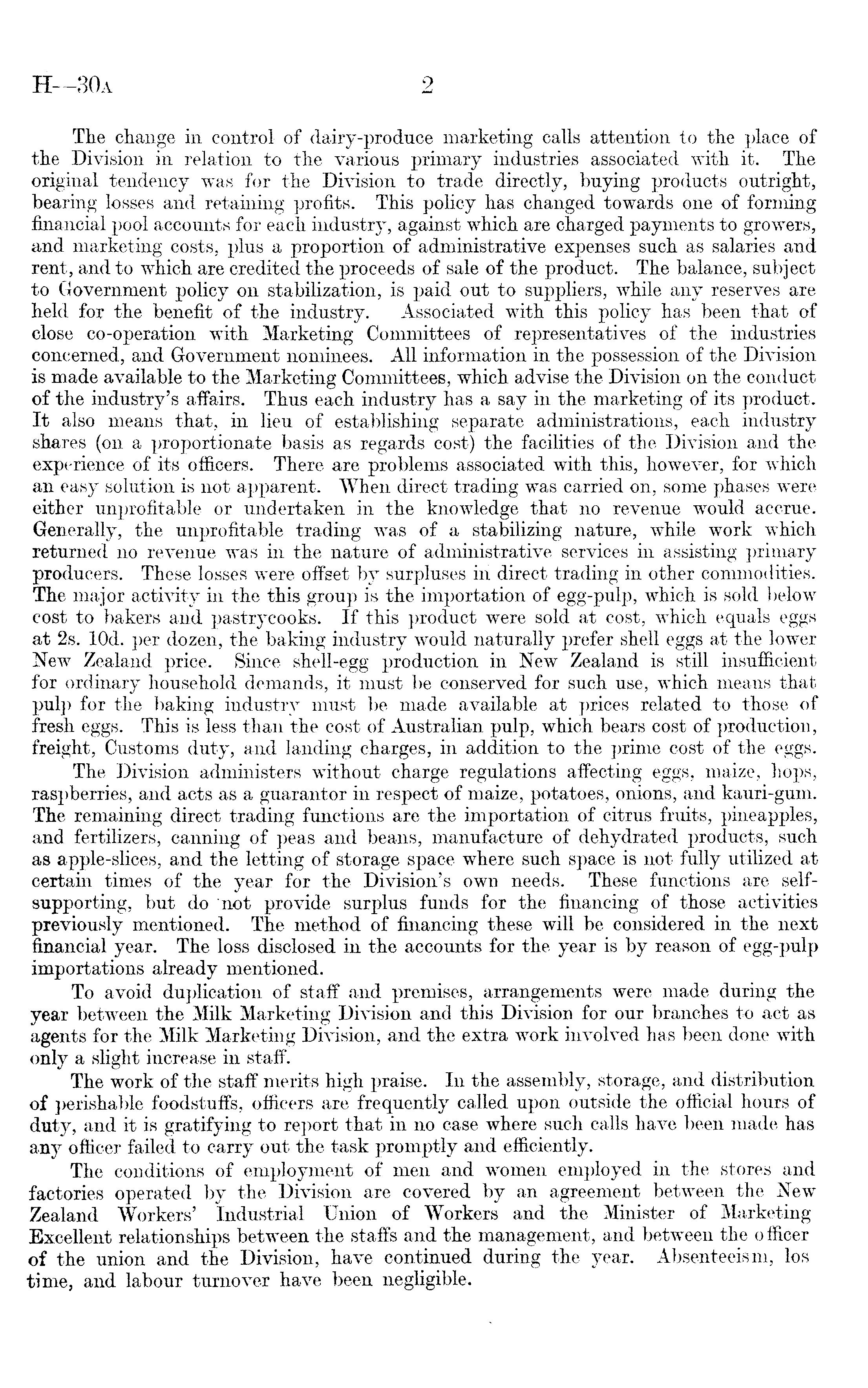 The change in control of dairy-produce marketing calls attention to the place of the Division in relation to the various primary industries associated with it. The original tendency was for the Division to trade directly, buying products outright, bearing losses and retaining profits. This policy has changed towards one of forming financial pool accounts for each industry, against which are charged payments to growers, and marketing costs, plus a proportion of administrative expenses such as salaries and rent, and to which are credited the proceeds of sale of the product. The balance, subject to Government policy on stabilization, is paid out to suppliers, while any reserves are held for the benefit of the industry. Associated with this policy has been that of close co-operation with Marketing Committees of representatives of the industries concerned, and Government nominees. All information in the possession of the Division is made available to the Marketing Committees, which advise the Division on the conduct of the industry's affairs. Thus each industry has a say in the marketing of its product. It also means that, in lieu of establishing separate administrations, each industry shares (on a proportionate basis as regards cost) the facilities of the Division and the experience of its officers. There are problems associated with this, however, for which an easy solution is not apparent. When direct trading was carried on, some phases were either unprofitable or undertaken in the knowledge that no revenue would accrue. Generally, the unprofitable trading was of a stabilizing nature, while work which returned no revenue was in the nature of administrative services in assisting primary producers. These losses were offset by surpluses in direct trading in other commodities. The major activity in the this group is the importation of egg-pulp, which is sold below cost to bakers and pastrycooks. If this product were sold at cost, which equals eggs at 2s. lOd. per dozen, the baking industry would naturally prefer shell eggs at the lower New Zealand price. Since shell-egg production in New Zealand is still insufficient for ordinary household demands, it must be conserved for such use, which means that pulp for the baking industry must be made available at prices related to those of fresh eggs. This is less than the cost of Australian pulp, which bears cost of production, freight, Customs duty, and landing charges, in addition to the prime cost of the eggs. The Division administers without charge regulations affecting eggs, maize, hops, raspberries, and acts as a guarantor in respect of maize, potatoes, onions, and kauri-gum. The remaining direct trading functions are the importation of citrus fruits, pineapples, and fertilizers, canning of peas and beans, manufacture of dehydrated products, such as apple-slices, and the letting of storage space where such space is not fully utilized at certain times of the year for the Division's own needs. These functions are selfsupporting, but do not provide surplus funds for the financing of those activities previously mentioned. The method of financing these will be considered in the next financial year. The loss disclosed in the accounts for the year is by reason of egg-pulp importations already mentioned. To avoid duplication of staff and premises, arrangements were made during the year between the Milk Marketing Division and this Division for our branches to act as agents for the Milk Marketing Division, and the extra work involved has been done with only a slight increase in staff. The work of the staff merits high praise. In the assembly, storage, and distribution of perishable foodstuffs, officers are frequently called upon outside the official hours of duty, and it is gratifying to report that in no case where such calls have been made has any officer failed to carry out the task promptly and efficiently. The conditions of employment of men and women employed in the stores and factories operated by the Division are covered by an agreement between the New Zealand Workers' Industrial Union of Workers and the Minister of Marketing Excellent relationships between the staffs and the management, and between the officer of the union and the Division, have continued during the year. Absenteeism, los time, and labour turnover have been negligible.