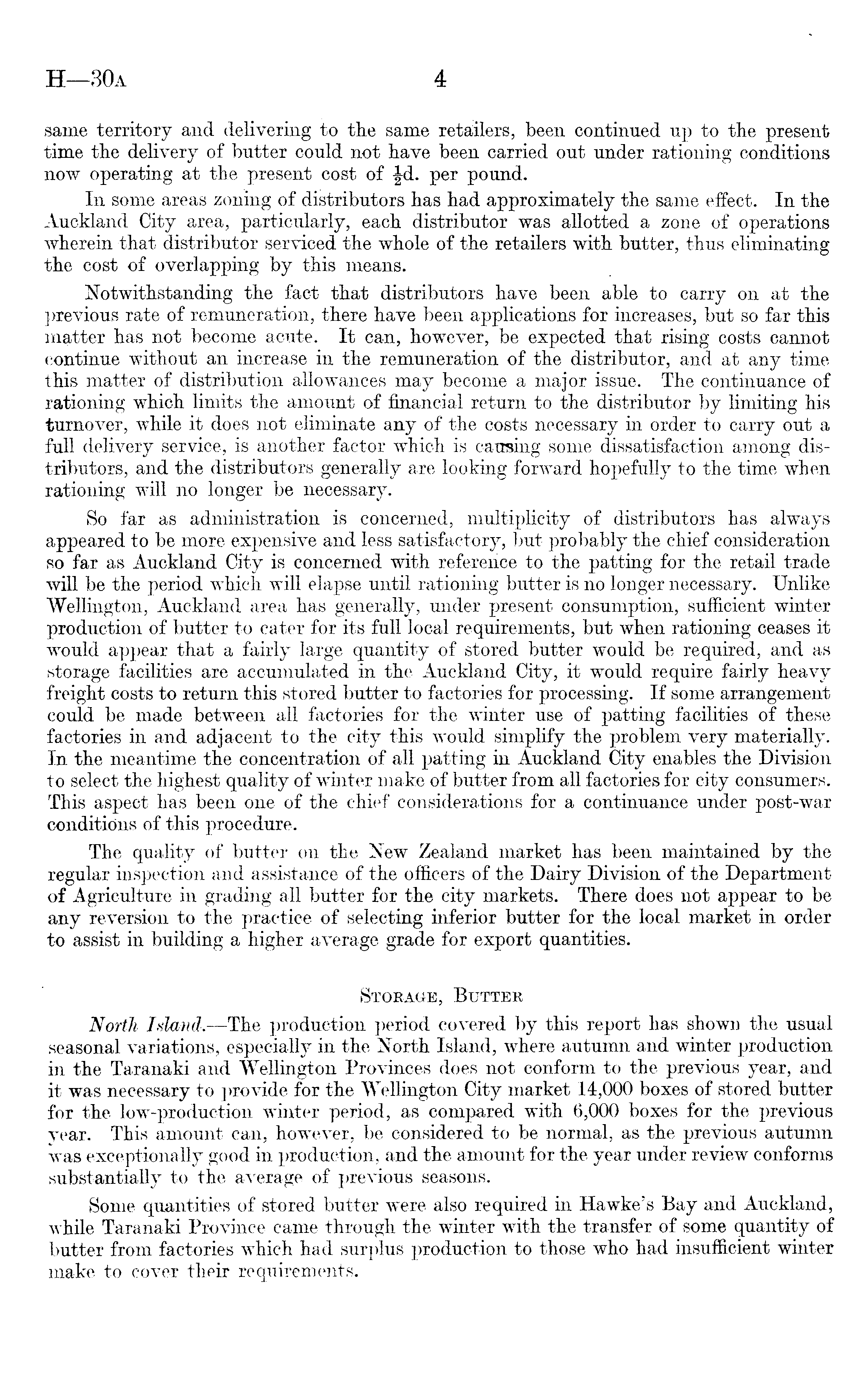 same territory and delivering to the same retailers, been continued up to the present time the delivery of butter could not have been carried out under rationing conditions now operating at the present cost of £d. per pound. In some areas zoning of distributors has had approximately the same effect. In the Auckland City area, particularly, each distributor was allotted a zone of operations wherein that distributor serviced the whole of the retailers with butter, thus eliminating the cost of overlapping by this means. Notwithstanding the fact that distributors have been able to carry on at the previous rate of remuneration, there have been applications for increases, but so far this matter has not become acute. It can, however, be expected that rising costs cannot continue without an increase in the remuneration of the distributor, and at any time this matter of distribution allowances may become a major issue. The continuance of rationing which limits the amount of financial return to the distributor by limiting his turnover, while it does not eliminate any of the costs necessary in order to carry out a full delivery service, is another factor which is causing some dissatisfaction among distributors, and the distributors generally are looking forward hopefully to the time when rationing will no longer be necessary. So far as administration is concerned, multiplicity of distributors has always appeared to be more expensive and less satisfactory, but probably the chief consideration so far as Auckland City is concerned with reference to the patting for the retail trade will be the period which will elapse until rationing butter is no longer necessary. Unlike Wellington, Auckland area has generally, under present consumption, sufficient winter production of butter to cater for its full local requirements, but when rationing ceases it would appear that a fairly large quantity of stored butter would be required, and as storage facilities are accumulated in the Auckland City, it would require fairly heavy freight costs to return this stored butter to factories for processing. If some arrangement could be made between all factories for the winter use of patting facilities of these factories in and adjacent to the city this would simplify the problem very materially. In the meantime the concentration of all patting in Auckland City enables the Division to select the highest quality of winter make of butter from all factories for city consumers. This aspect has been one of the chief considerations for a continuance under post-war conditions of this procedure. The quality of butter on the New Zealand market has been maintained by the regular inspection and assistance of the officers of the Dairy Division of the Department of Agriculture in grading all butter for the city markets. There does not appear to be any reversion to the practice of selecting inferior butter for the local market in order to assist in building a higher average grade for export quantities. Storage, Butter North Island. —The production period covered by this report has shown the usual seasonal variations, especially in the North Island, where autumn and winter production in the Taranaki and Wellington Provinces does not conform to the previous year, and it was necessary to provide for the Wellington City market 14,000 boxes of stored butter for the low-production winter period, as compared with 6,000 boxes for the previous year. This amount can, however, be considered to be normal, as the previous autumn was exceptionally good in production, and the amount for the year under review conforms substantially to the average of previous seasons. Some quantities of stored butter were also required in Hawke's Bay and Auckland, while Taranaki Province came through the winter with the transfer of some quantity of butter from factories which had surplus production to those who had insufficient winter make to cover their requirements.
