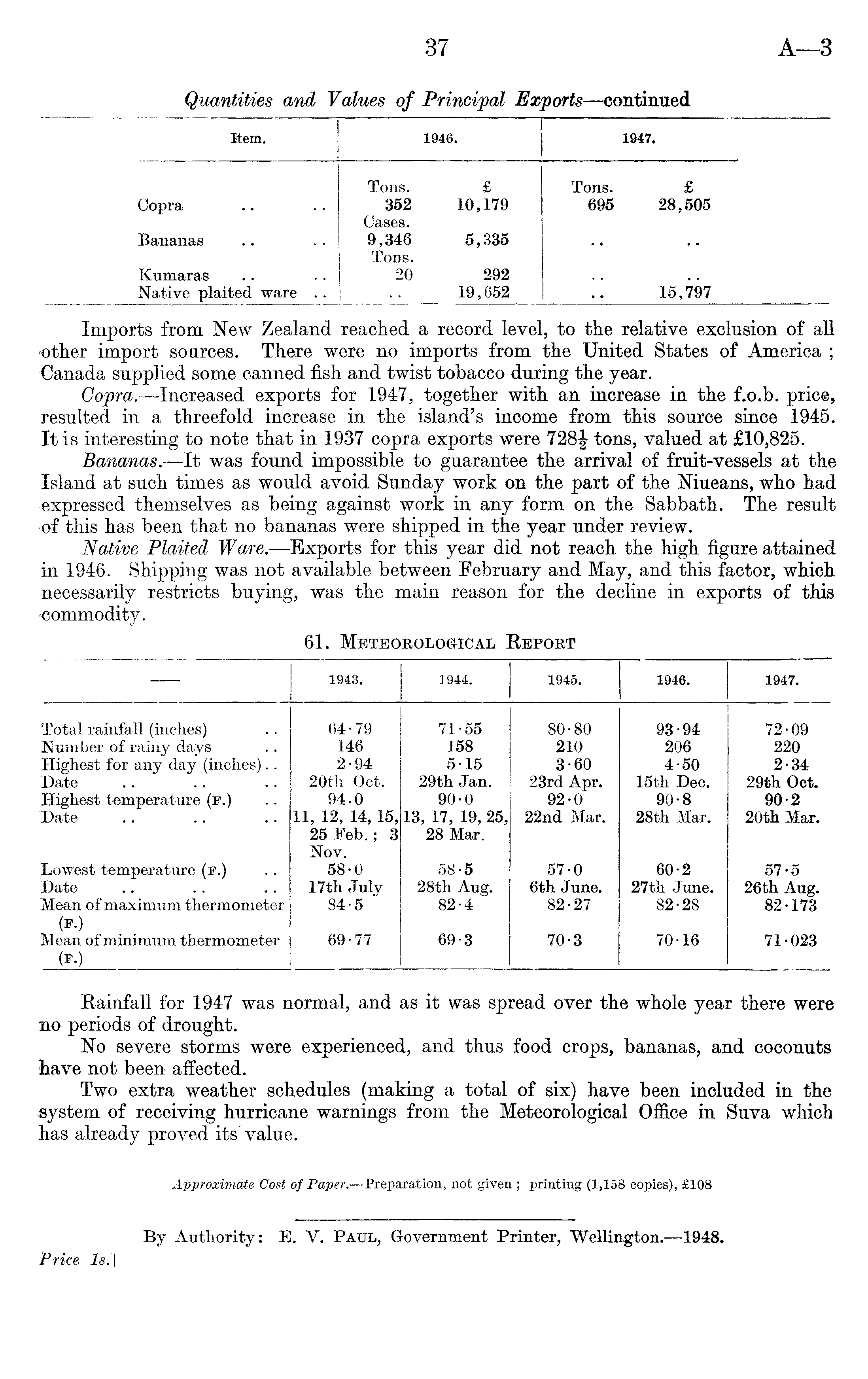 Imports from New Zealand reached a record level, to the relative exclusion of all other import sources. There were no imports from the United States of America ; ■Canada supplied some canned fish and twist tobacco during the year. Copra. —lncreased exports for 1947, together with an increase in the f.o.b. price, resulted in a threefold increase in the island's income from this source since 1945. It is interesting to note that in 1937 copra exports were 728f- tons, valued at £10,825. Bananas. —lt was found impossible to guarantee the arrival of fruit-vessels at the Island at such times as would avoid Sunday work on the part of the Niueans, who had expressed themselves as being against work in any form on the Sabbath. The result of this has been that no bananas were shipped in the year under review. Native Plaited Ware. —Exports for this year did not reach the high figure attained in 1946. Shipping was not available between February and May, and this factor, which necessarily restricts buying, was the main reason for the decline in exports of this commodity.