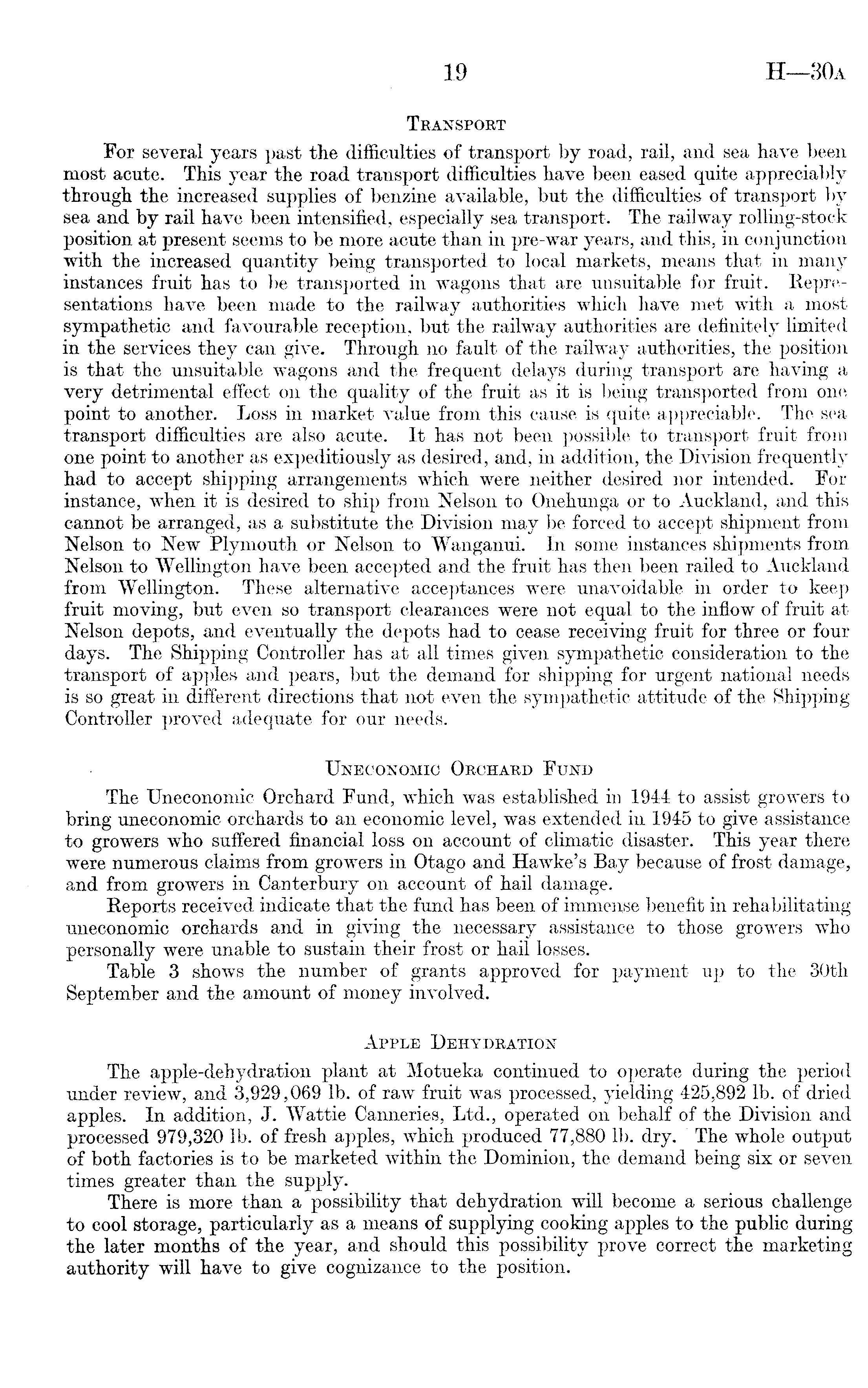 Transport For several years past the difficulties of transport by road, rail, and sea have been most acute. This year the road transport difficulties have been eased quite appreciably through the increased supplies of benzine available, but the difficulties of transport by sea and by rail have been intensified, especially sea transport. The railway rolling-stock position at present seems to be more acute than in pre-war years, and this, in conjunction with the increased quantity being transported to local markets, means that in many instances fruit has to be transported in wagons that are unsuitable for fruit. Representations have been made to the railway authorities which have met with a most sympathetic and favourable reception, but the railway authorities are definitely limited in the services they can give. Through no fault of the railway authorities, the position is that the unsuitable wagons and the frequent delays during transport are having a very detrimental effect on the quality of the fruit as it is being transported from one point to another. Loss in market value from this cause is quite appreciable. The sea transport difficulties are also acute. It has not been possible to transport fruit from one point to another as expeditiously as desired, and, in addition, the Division frequently had to accept shipping arrangements which were neither desired nor intended. For instance, when it is desired to ship from Nelson to Onehunga or to Auckland, and this cannot be arranged, as a substitute the Division may be forced to accept shipment from Nelson to New Plymouth or Nelson to Wanganui. In some instances shipments from Nelson to Wellington have been accepted and the fruit has then been railed to Auckland from Wellington. These alternative acceptances were unavoidable in order to keep fruit moving, but even so transport clearances were not equal to the inflow of fruit at Nelson depots, and eventually the depots had to cease receiving fruit for three or four days. The Shipping Controller has at all times given sympathetic consideration to the transport of apples and pears, but the demand for shipping for urgent national needs is so great in different directions that not even the sympathetic attitude of the Shipping Controller proved adequate for our needs. Uneconomic Orchard Fund The Uneconomic Orchard Fund, which was established in 1944 to assist growers to bring uneconomic orchards to an economic level, was extended in 1945 to give assistance to growers who suffered financial loss on account of climatic disaster. This year there were numerous claims from growers in Otago and Hawke's Bay because of frost damage, and from growers in Canterbury on account of hail damage. Reports received indicate that the fund has been of immense benefit in rehabilitating uneconomic orchards and in giving the necessary assistance to those growers who personally were unable to sustain their frost or hail losses. Table 3 shows the number of grants approved for payment up to the 30th September and the amount of money involved. Apple Dehydration The apple-dehydration plant at Motueka continued to operate during the period under review, and 3,929,069 lb. of raw fruit was processed, yielding 425,892 lb. of dried apples. In addition, J. Wattie Canneries, Ltd., operated on behalf of the Division and processed 979,320 lb. of fresh apples, which produced 77,880 lb. dry. ' The whole output of both factories is to be marketed within the Dominion, the demand being six or seven times greater than the supply. There is more than a possibility that dehydration will become a serious challenge to cool storage, particularly as a means of supplying cooking apples to the public during the later months of the year, and should this possibility prove correct the marketing authority will have to give cognizance to the position.