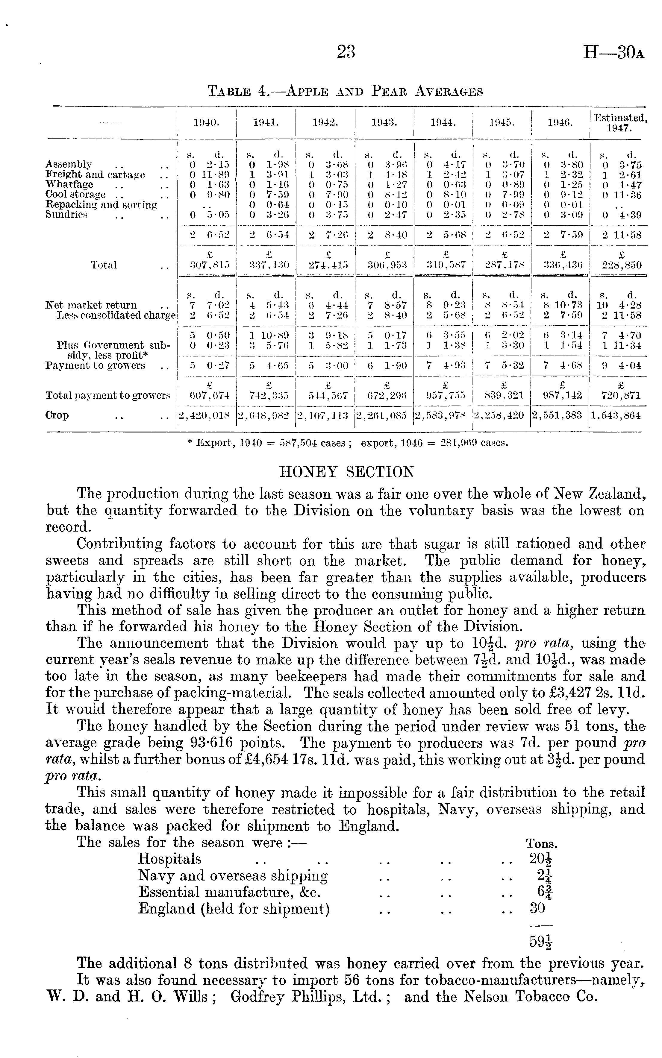 HONEY SECTION The production during the last season was a fair one over the whole of New Zealand, but the quantity forwarded to the Division on the voluntary basis was the lowest on record. Contributing factors to account for this are that sugar is still rationed and other sweets and spreads are still short on the market. The public demand for honey, particularly in the cities, has been far greater than the supplies available, producers having had no difficulty in selling direct to the consuming public. This method of sale has given the producer an outlet for honey and a higher return than if he forwarded his honey to the Honey Section of the Division. The announcement that the Division would pay up to 10|d. pro rata, using the current year's seals revenue to make up the difference between 7|d. and 10£ d., was made too late in the season, as many beekeepers had made their commitments for sale and for the purchase of packing-material. The seals collected amounted only to £3,427 2s. lid. It would therefore appear that a large quantity of honey has been sold free of levy. The honey handled by the Section during the period under review was 51 tons, the average grade being 93*616 points. The payment to producers was 7d. per pound pro rata, whilst a further bonus of £4,654175. lid. was paid, this working out at 3|d. per pound pro rata. This small quantity of honey made it impossible for a fair distribution to the retail trade, and sales were therefore restricted to hospitals, Navy, overseas shipping, and the balance was packed for shipment to England. The sales for the season were : Tons. Hospitals .. .. .. .. .. 20£ Navy and overseas shipping .. .. 2J Essential manufacture, &c. .. .. 6§ England (held for shipment) .. .. .. 30 59| The additional 8 tons distributed was honey carried over from the previous year. It was also found necessary to import 56 tons for tobacco-manufacturers —namely, "W. D. and H. 0. Wills; Godfrey Phillips, Ltd.; and the Nelson Tobacco Co.
