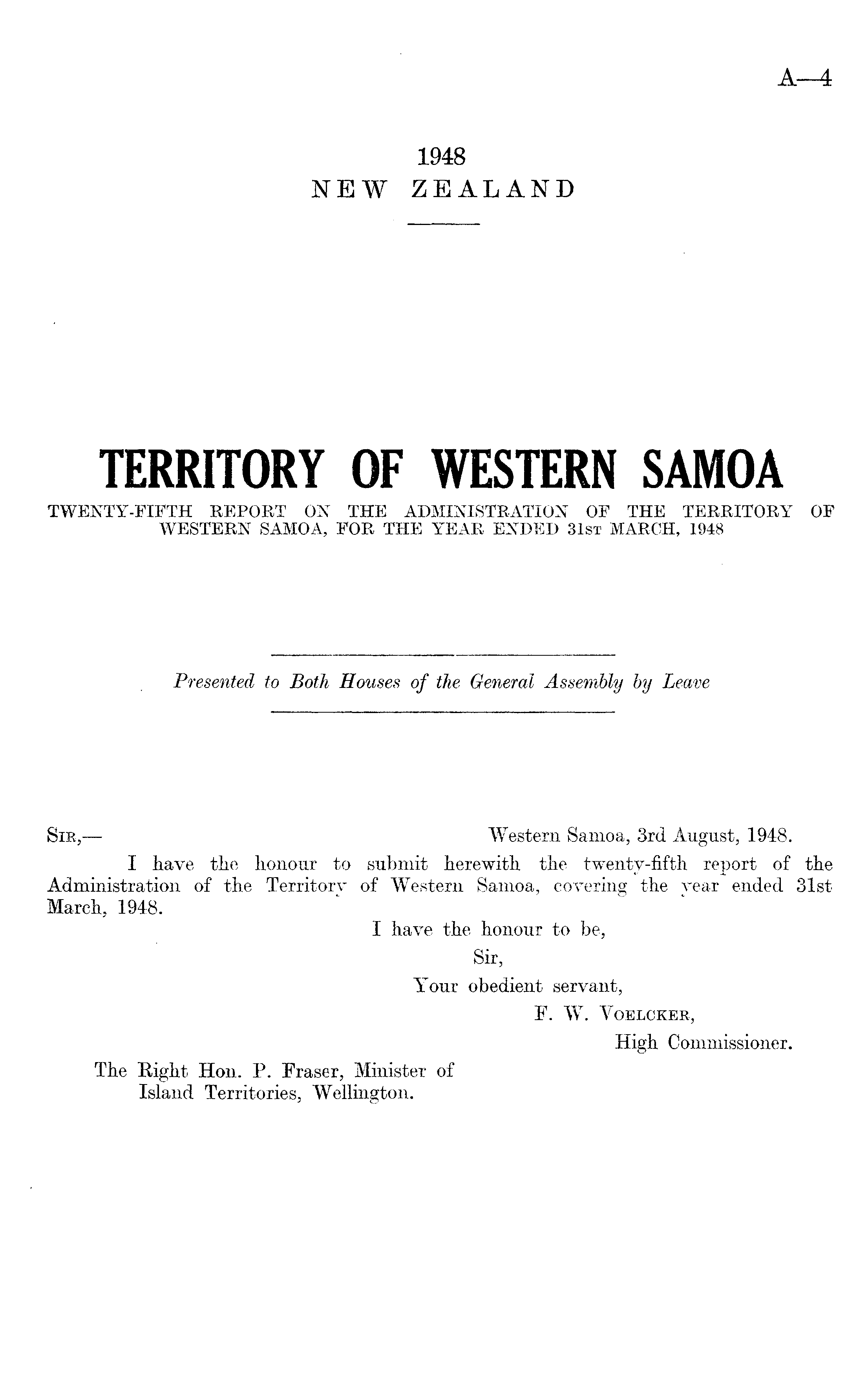 Sib, — Western Samoa, 3rd August, 1948. I have the honour to submit herewith the twenty-fifth report of the Administration of the Territory of Western Samoa, covering the year ended 31st March, 1948. I have the honour to be, Sir, Your obedient servant, F. W. Voelcker, High Commissioner. The Right Hon. P. Eraser, Minister of Island Territories, Wellington.