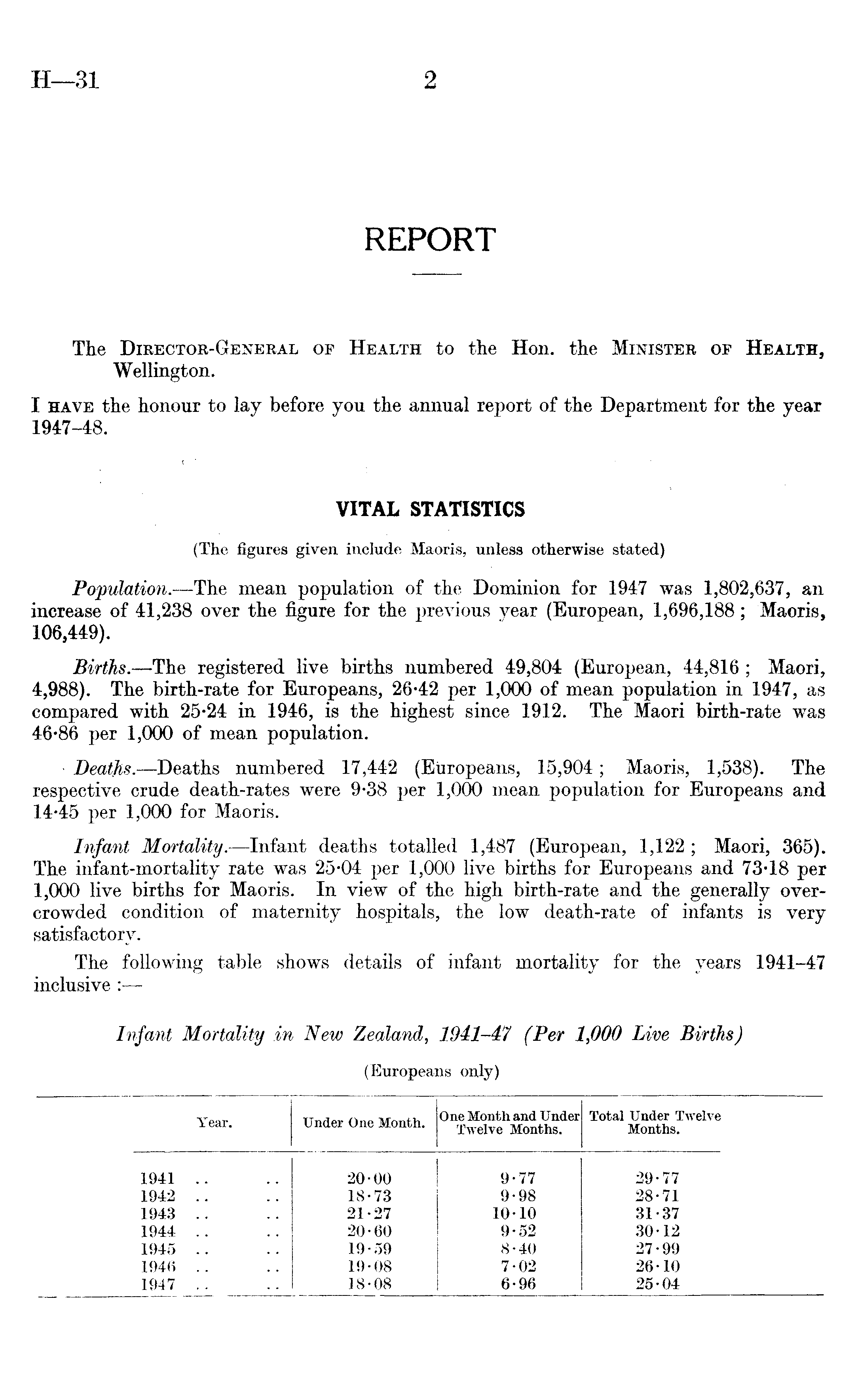 REPORT The Director-General of Health to the Hon. the Minister of Health, Wellington. I have the honour to lay before you the annual report of the Department for the year 1947-48. VITAL STATISTICS (The figures given include Maoris, unless otherwise stated) Population.—The mean population of the Dominion for 1947 was 1,802,637, an increase of 41,238 over the figure for the previous year (European, 1,696,188; Maoris, 106,449). Births.—The registered live births numbered 49,804 (European, 44,816; Maori, 4,988). The birth-rate for Europeans, 26*42 per 1,000 of mean population in 1947, as compared with 25*24 in 1946, is the highest since 1912. The Maori birth-rate was 46*86 per 1,000 of mean population. Deaths. —Deaths numbered 17,442 (Europeans, 15,904; Maoris, 1,538). The respective crude death-rates were 9*38 per 1,000 mean population for Europeans and 14*45 per 1,000 for Maoris. Infant Mortality.—lnfant deaths totalled 1,487 (European, 1,122 ; Maori, 365). The infant-mortality rate was 25*04 per 1,000 live births for Europeans and 73*18 per 1,000 live births for Maoris. In view of the high birth-rate and the generally overcrowded condition of maternity hospitals, the low death-rate of infants is very satisfactory. The following table shows details of infant mortality for the years 1941-47 inclusive :
