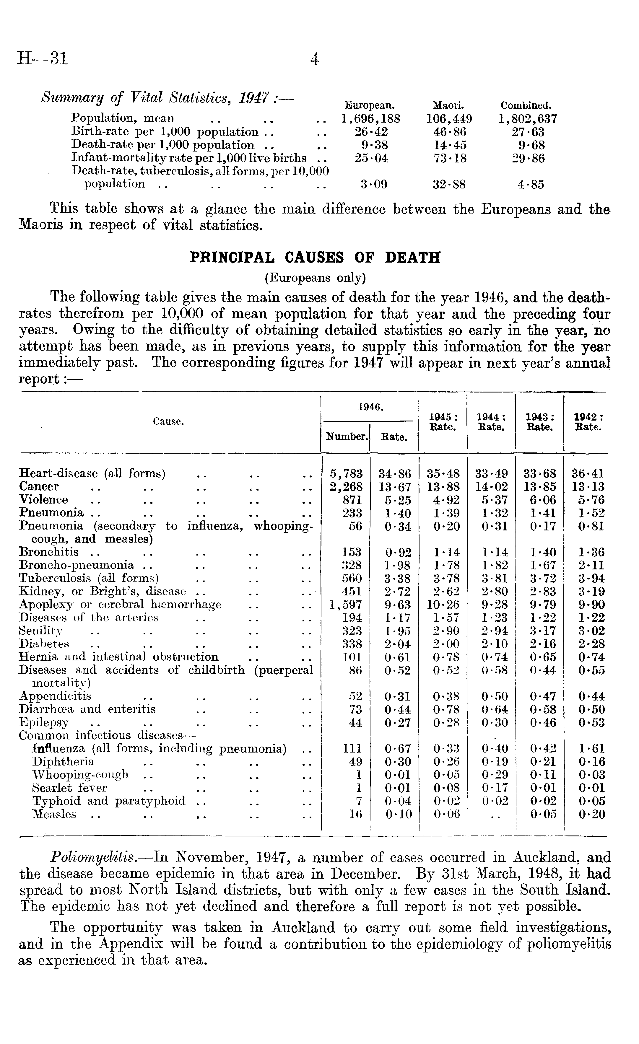 Summary of Vital Statistics, 1947 : EuMpem Maori Combllled Population, mean .. .. .. 1,696,188 106,449 1,802,637 Birth-rate per 1,000 population .. .. 26-42 46-86 27*63 Death-rate per 1,000 population .. .. 9-38 14-45 9-68 Infant-mortality rate per 1,000 live births .. 25-04 73-18 29-86 Death-rate, tuberculosis, all forms, per 10,000 population .. .. .. .. 3-09 32-88 4-85 This table shows at a glance the main difference between the Europeans and the Maoris in respect of vital statistics. PRINCIPAL CAUSES OF DEATH (Europeans only) The following table gives the main causes of death for the year 1946, and the deathrates therefrom per 10,000 of mean population for that year and the preceding four years. Owing to the difficulty of obtaining detailed statistics so early in the year, no attempt has been made, as in previous years, to supply this information for the year immediately past. The corresponding figures for 1947 will appear in next year's annual report: —