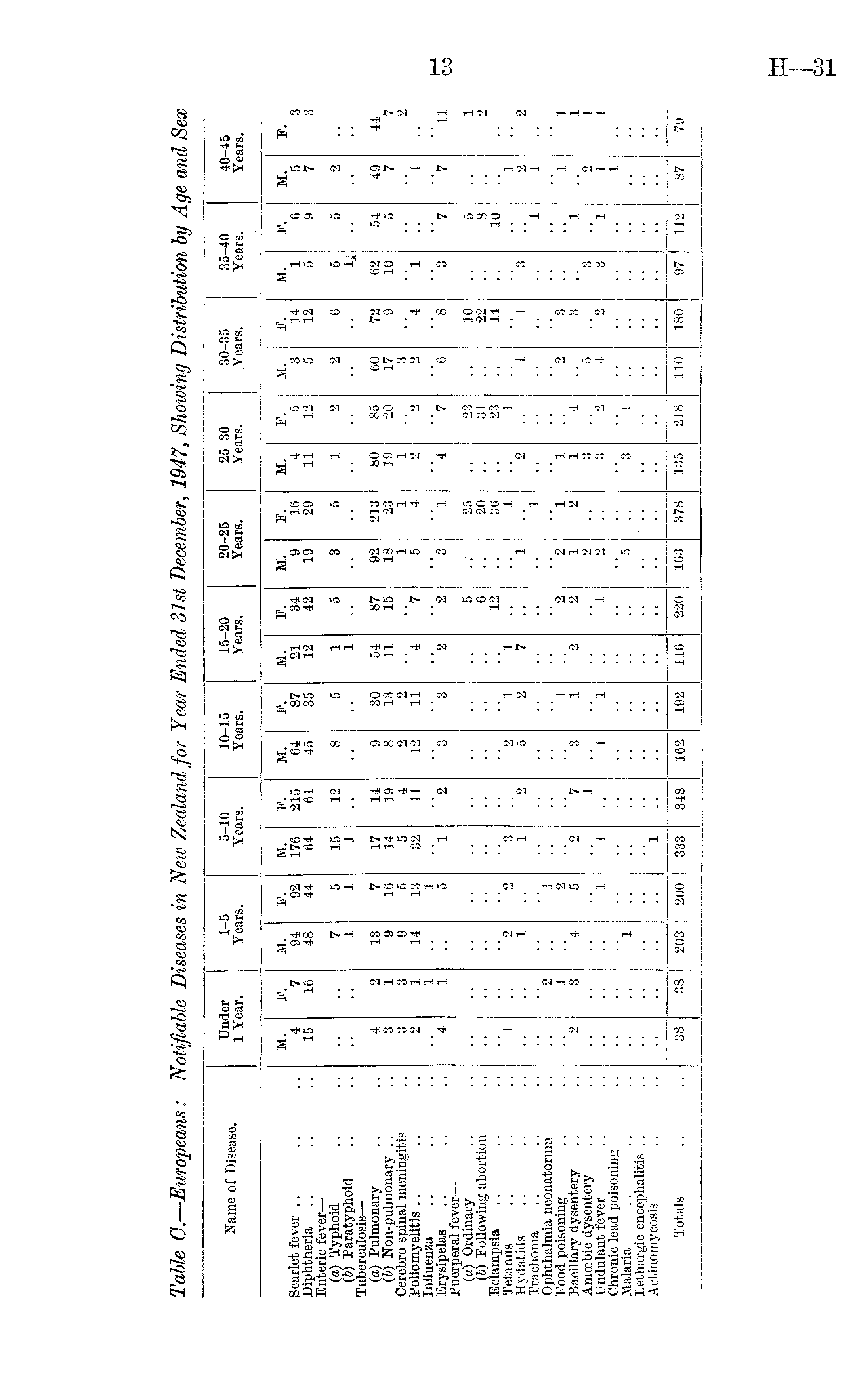 Table C.—Europeans: Notifiable Diseases in New Zealand for Year Ended 31st December, 1947, Showing Distribution by Age and Sex