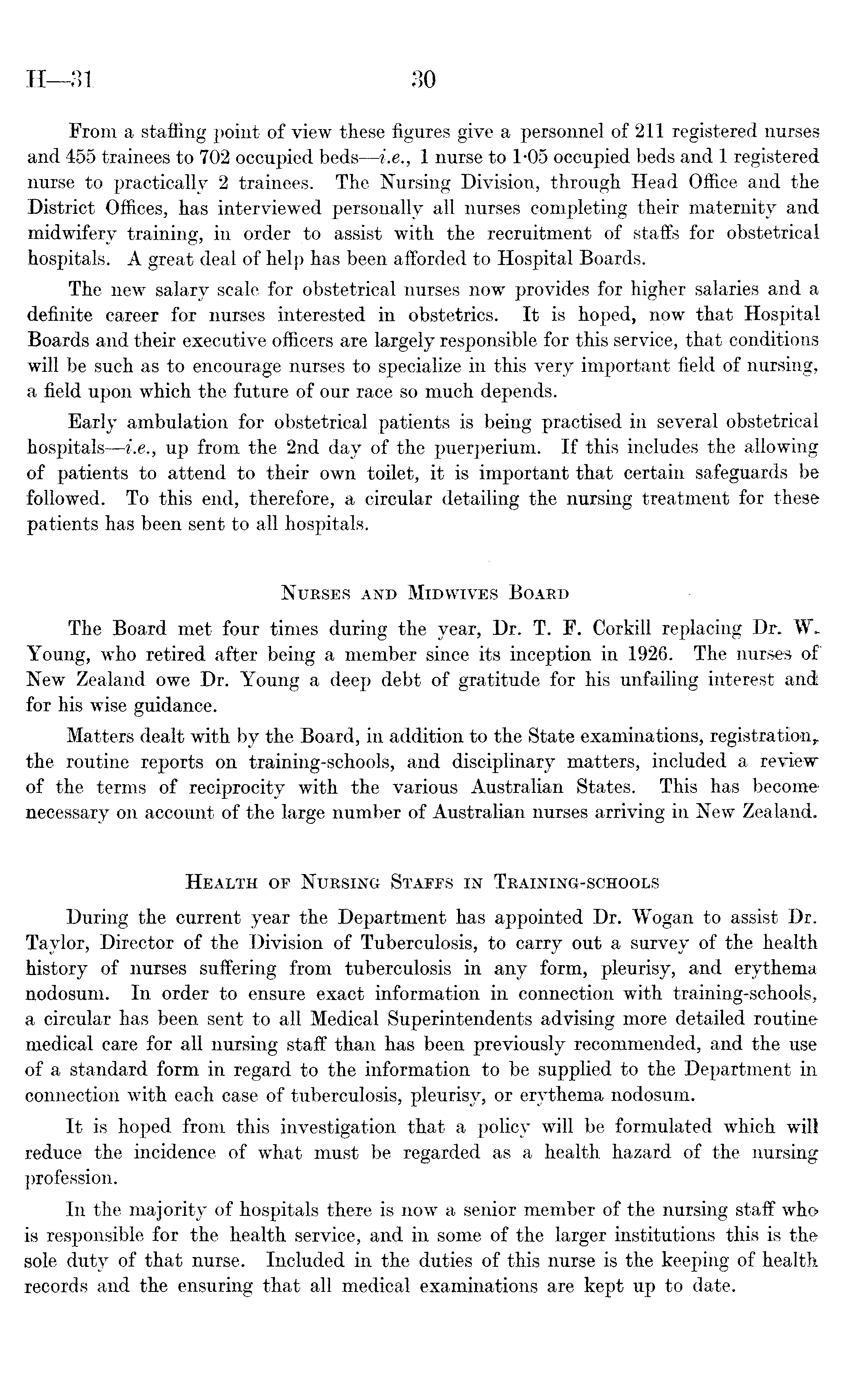 From a staffing point of view these figures give a personnel of 211 registered nurses and 455 trainees to 702 occupied beds —i.e., 1 nurse to I*os occupied beds and 1 registered nurse to practically 2 trainees. The Nursing Division, through Head Office and the District Offices, has interviewed personally all nurses completing their maternity and midwifery training, in order to assist with the recruitment of staffs for obstetrical hospitals. A great deal of help has been afforded to Hospital Boards. The new salary scale for obstetrical nurses now provides for higher salaries and a definite career for nurses interested in obstetrics. It is hoped, now that Hospital Boards and their executive officers are largely responsible for this service, that conditions will be such as to encourage nurses to specialize in this very important field of nursing, a field upon which the future of our race so much depends. Early ambulation for obstetrical patients is being practised in several obstetrical hospitals—i.e., up from the 2nd day of the puerperium. If this includes the allowing of patients to attend to their own toilet, it is important that certain safeguards be followed. To this end, therefore, a circular detailing the nursing treatment for these patients has been sent to all hospitals. Nurses and Midwives Board The Board met four times during the year, Dr. T. F. Corkill replacing Dr. W. Young, who retired after being a member since its inception in 1926. The nurses of New Zealand owe Dr. Young a deep debt of gratitude for his unfailing interest and for his wise guidance. Matters dealt with by the Board, in addition to the State examinations, registration,, the routine reports on training-schools, and disciplinary matters, included a review of the terms of reciprocity with the various Australian States. This has become necessary on account of the large number of Australian nurses arriving in New Zealand. Health of Nursing Staffs in Training-schools During the current year the Department has appointed Dr. Wogan to assist Dr. Taylor, Director of the Division of Tuberculosis, to carry out a survey of the health history of nurses suffering from tuberculosis in any form, pleurisy, and erythema nodosum. In order to ensure exact information in connection with training-schools, a circular has been sent to all Medical Superintendents advising more detailed routine medical care for all nursing staff than has been previously recommended, and the use of a standard form in regard to the information to be supplied to the Department in connection with each case of tuberculosis, pleurisy, or erythema nodosum. It is hoped from this investigation that a policy will be formulated which will reduce the incidence of what must be regarded as a health hazard of the nursing profession. In the majority of hospitals there is now a senior member of the nursing staff who is responsible for the health service, and in some of the larger institutions this is the sole duty of that nurse. Included in the duties of this nurse is the keeping of health records and the ensuring that all medical examinations are kept up to date.