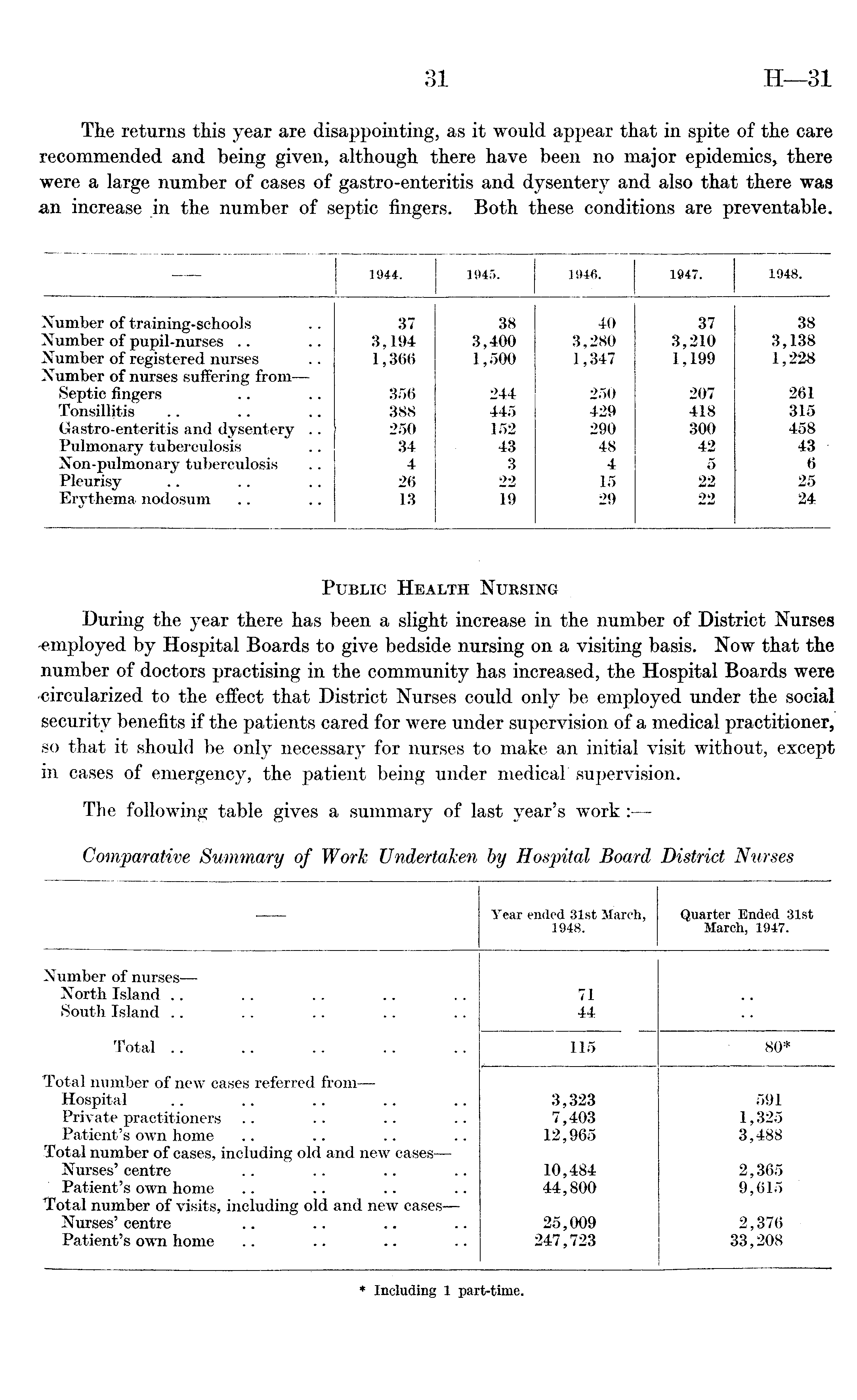 Year ended 31st March, Quarter Ended 31st 1948. March, 1947. Number of nurses— North Island 71 South Island 44 Total 115 80* Total number of new cases referred from — Hospital 3,323 591 Private practitioners 7,403 1,325 Patient's own home 12,965 3,488 Total number of cases, including old and new cases— Nurses' centre 10,484 2,365 Patient's own home 44,800 9,615 Total number of visits, including old and new cases— Nurses' centre 25,009 2,376 Patient's own home 247,723 33,208 * Including 1 part-time.
