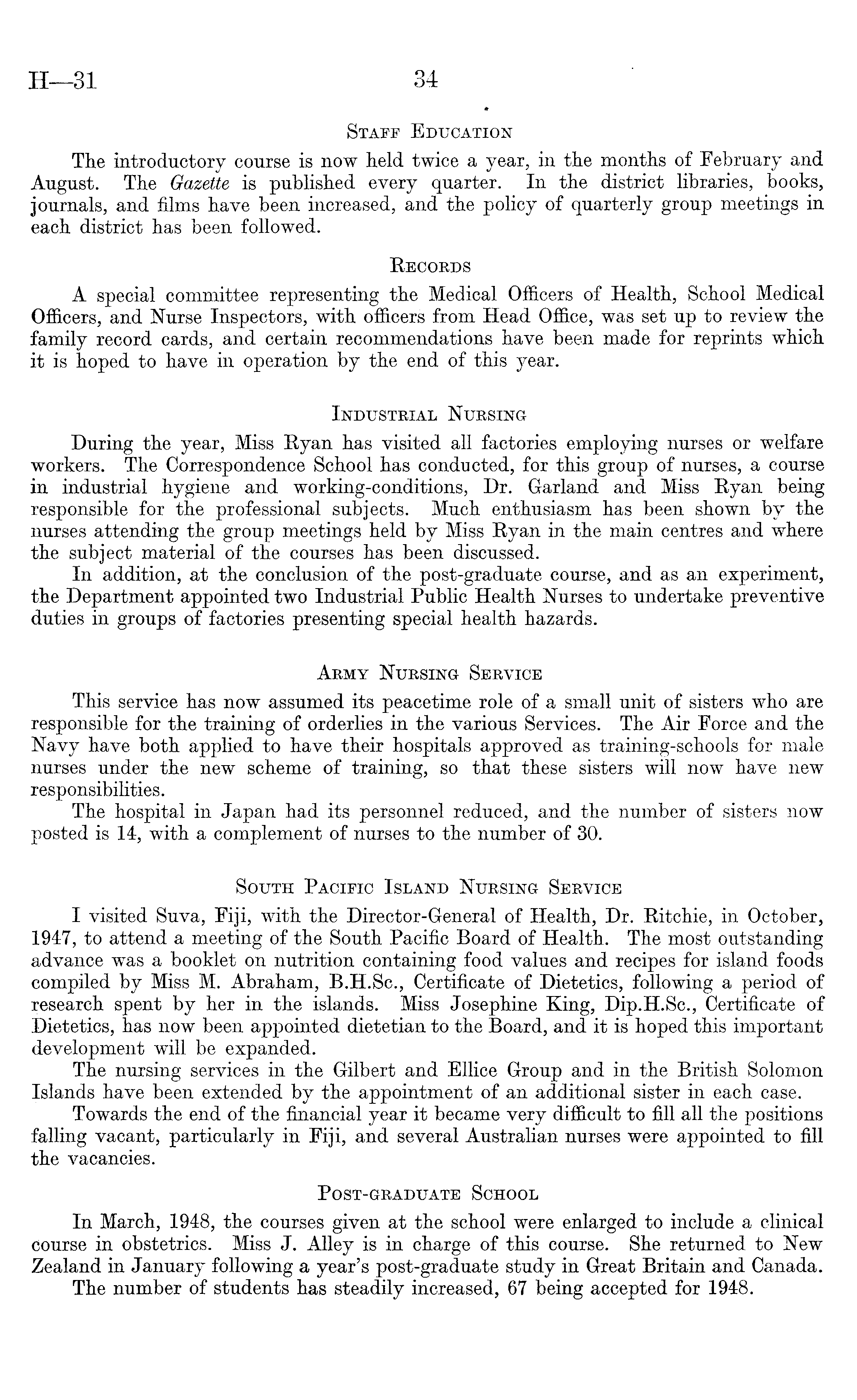 Staff Education The Introductory course is now held twice a year, in the months of February and August. The Gazette is published every quarter. In the district libraries, books, journals, and films have been increased, and the policy of quarterly group meetings in each district has been followed. Records A special committee representing the Medical Officers of Health, School Medical Officers, and Nurse Inspectors, with officers from Head Office, was set up to review the family record cards, and certain recommendations have been made for reprints which it is hoped to have in operation by the end of this year. Industrial Nursing During the year, Miss Ryan has visited all factories employing nurses or welfare workers. The Correspondence School has conducted, for this group of nurses, a course in industrial hygiene and working-conditions, Dr. Garland and Miss Ryan being responsible for the professional subjects. Much enthusiasm has been shown by the nurses attending the group meetings held by Miss Ryan in the main centres and where the subject material of the courses has been discussed. In addition, at the conclusion of the post-graduate course, and as an experiment, the Department appointed two Industrial Public Health Nurses to undertake preventive duties in groups of factories presenting special health hazards. Army Nursing Service This service has now assumed its peacetime role of a small unit of sisters who are responsible for the training of orderlies in the various Services. The Air Force and the Navy have both applied to have their hospitals approved as training-schools for male nurses under the new scheme of training, so that these sisters will now have new responsibilities. The hospital in Japan had its personnel reduced, and the number of sisters now posted is 14, with a complement of nurses to the number of 30. South Pacific Island Nursing Service I visited Suva, Fiji, with the Director-General of Health, Dr. Ritchie, in October, 1947, to attend a meeting of the South Pacific Board of Health. The most outstanding advance was a booklet on nutrition containing food values and recipes for island foods compiled by Miss M. Abraham, B.H.Sc., Certificate of Dietetics, following a period of research spent by her in the islands. Miss Josephine King, Dip.H.Sc., Certificate of Dietetics, has now been appointed dietetian to the Board, and it is hoped this important development will be expanded. The nursing services in the Gilbert and Ellice Group and in the British Solomon Islands have been extended by the appointment of an additional sister in each case. Towards the end of the financial year it became very difficult to fill all the positions falling vacant, particularly in Fiji, and several Australian nurses were appointed to fill the vacancies. Post-graduate School In March, 1948, the courses given at the school were enlarged to include a clinical course in obstetrics. Miss J. Alley is in charge of this course. She returned to New Zealand in January following a year's post-graduate study in Great Britain and Canada. The number of students has steadily increased, 67 being accepted for 1948.