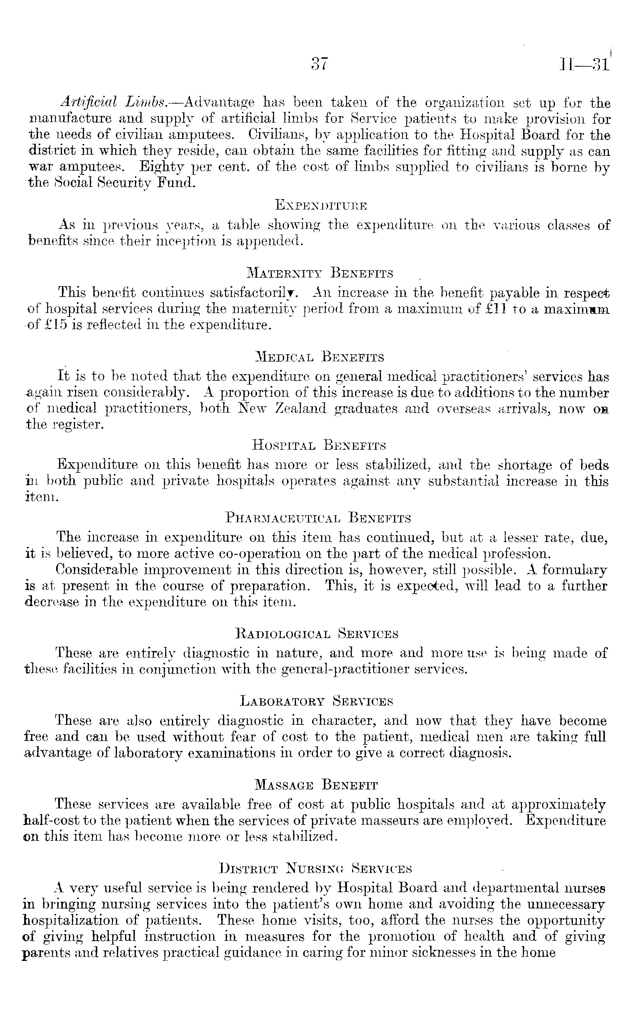 Artificial Limbs.—Advantage has been taken of the organization set up for the manufacture and supply of artificial limbs for Service patients to make provision for the needs of civilian amputees. Civilians, by application to the Hospital Board for the district in which they reside, can obtain the same facilities for fitting and supply as can war amputees. Eighty per cent, of the cost of limbs supplied to civilians is borne by the Social Security Fund. Expenditure As in previous years, a table showing the expenditure on the various classes of •benefits since their inception is appended. Maternity Benefits This benefit continues satisfactorily. An increase in the benefit payable in respect of hospital services during the maternity period from a maximum of £ll to a maximum •of £l5 is reflected in the expenditure. Medical Benefits It is to be noted that the expenditure on general medical practitioners' services has ■again risen considerably. A proportion of this increase is due to additions to the number of medical practitioners, both New Zealand graduates and overseas arrivals, now on the register. Hospital Benefits Expenditure on this benefit has more or less stabilized, and the shortage of beds in both public and private hospitals operates against any substantial increase in this item. Pharmaceutical Benefits The increase in expenditure on this item has continued, but at a lesser rate, due, it is believed, to more active co-operation on the part of the medical profession. Considerable improvement in this direction is, however, still possible. A formulary is at present in the course of preparation. This, it is expected, will lead to a further decrease in the expenditure on this item. Badiological Services These are entirely diagnostic in nature, and more and more use is being made of these facilities in conjunction with the general-practitioner services. Laboratory Services These are also entirely diagnostic in character, and now that they have become free and can be used without fear of cost to the patient, medical men are taking full advantage of laboratory examinations in order to give a correct diagnosis. Massage Benefit These services are available free of cost at public hospitals and at approximately half-cost to the patient when the services of private masseurs are employed. Expenditure on this item has become more or less stabilized. District Nursing Services A very useful service is being rendered by Hospital Board and departmental nurses in bringing nursing services into the patient's own home and avoiding the unnecessary hospitalization of patients. These home visits, too, afford the nurses the opportunity of giving helpful instruction in measures for the promotion of health and of giving parents and relatives practical guidance in caring for minor sicknesses in the home