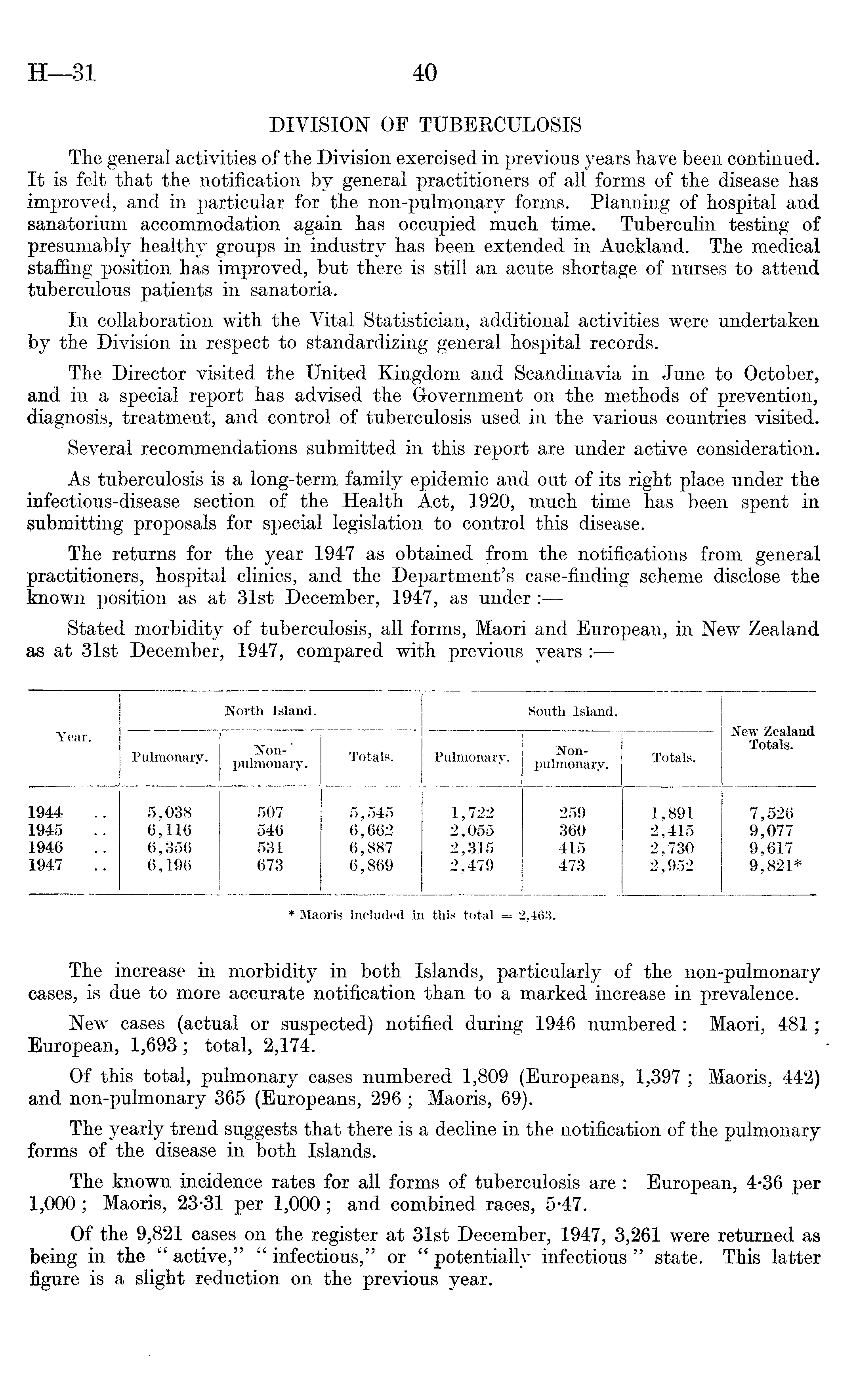 DIVISION OF TUBERCULOSIS The general activities of the Division exercised in previous years have been continued. It is felt that the notification by general practitioners of all forms of the disease has improved, and in particular for the non-pulmonary forms. Planning of hospital and sanatorium accommodation again has occupied much time. Tuberculin testing of presumably healthy groups in industry has been extended in Auckland. The medical staffing position has improved, but there is still an acute shortage of nurses to attend tuberculous patients in sanatoria. In collaboration with the Vital Statistician, additional activities were undertaken by the Division in respect to standardizing general hospital records. The Director visited the United Kingdom and Scandinavia in June to October, and in a special report has advised the Government on the methods of prevention, diagnosis, treatment, and control of tuberculosis used in the various countries visited. Several recommendations submitted in this report are under active consideration. As tuberculosis is a long-term family epidemic and out of its right place under the infectious-disease section of the Health Act, 1920, much time has been spent in submitting proposals for special legislation to control this disease. The returns for the year 1947 as obtained from the notifications from general practitioners, hospital clinics, and the Department's case-finding scheme disclose the known position as at 31st December, 1947, as under : Stated morbidity of tuberculosis, all forms, Maori and European, in New Zealand as at 31st December, 1947, compared with previous years :