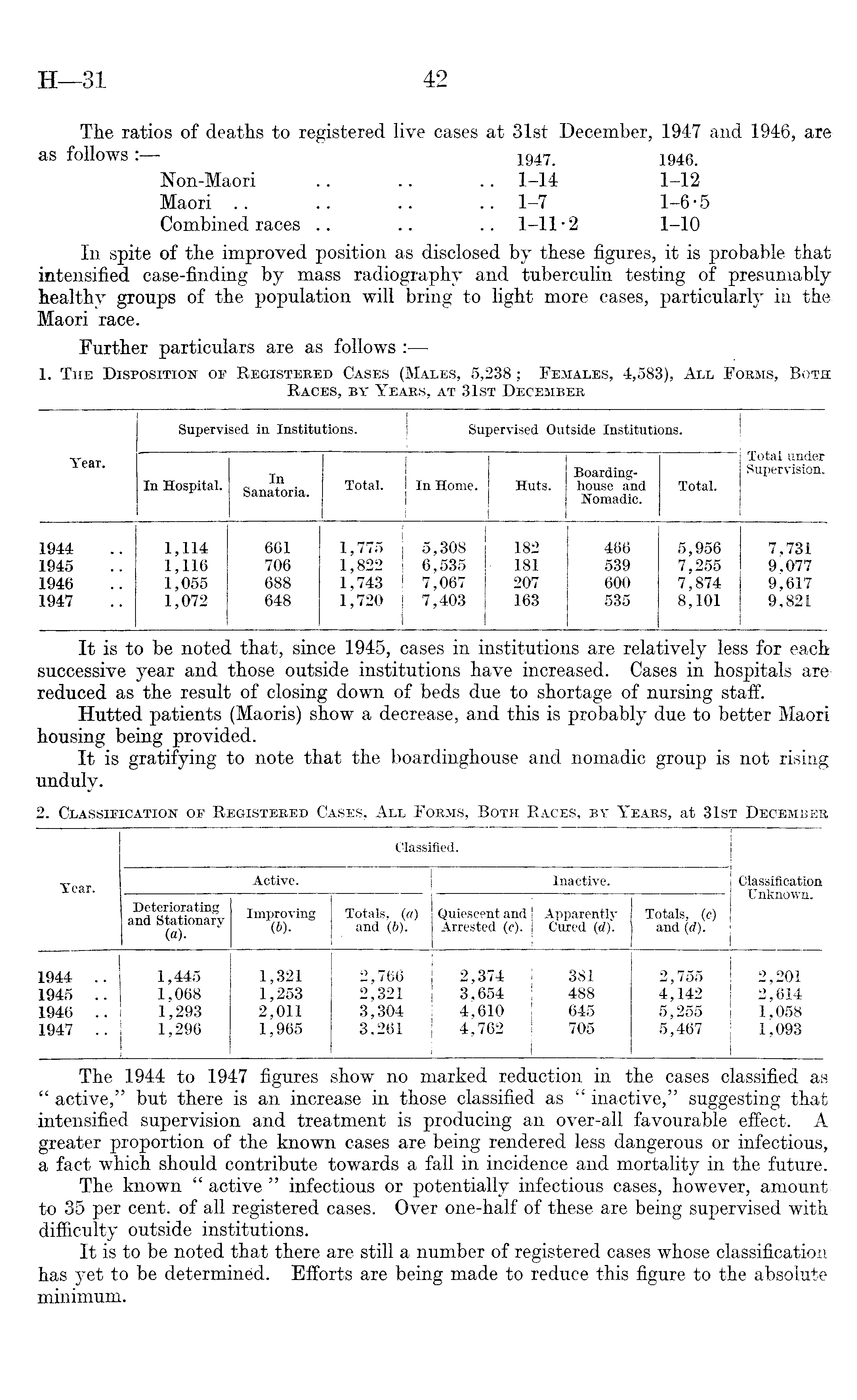 The ratios of deaths to registered live cases at 31st December, 1947 and 1946, are as followsi 9 47. 1946. Non-Maori .. .. .. 1-14 1-12 Maori .. .. .. ..1-7 1-6-5 Combined races .. .. .. 1-11*2 1-10 In spite of the improved position as disclosed by these figures, it is probable that, intensified case-finding by mass radiography and tuberculin testing of presumably healthy groups of the population will bring to light more cases, particularly in the Maori race. Further particulars are as follows :