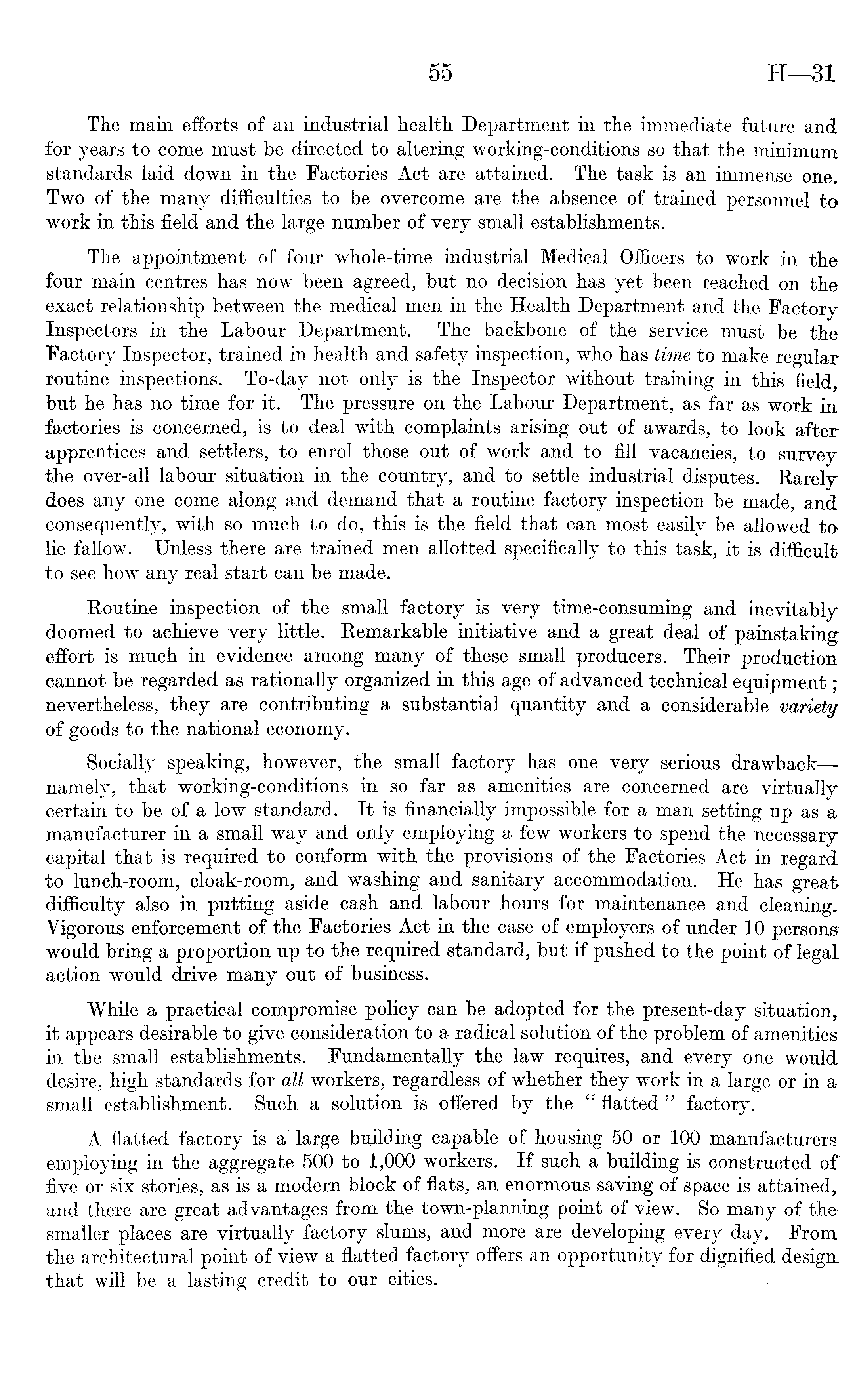 The main efforts of an industrial health. Department in the immediate future and for years to come must be directed to altering working-conditions so that the standards laid down in the Factories Act are attained. The task is an immense one. Two of the many difficulties to be overcome are the absence of trained personnel to work in this field and the large number of very small establishments. The appointment of four whole-time industrial Medical Officers to work in the four main centres has now been agreed, but no decision has yet been reached on the exact relationship between the medical men in the Health Department and the Factory Inspectors in the Labour Department. The backbone of the service must be the Factory Inspector, trained in health and safety inspection, who has time to make regular routine inspections. To-day not only is the Inspector without training in this field, but he has no time for it. The pressure on the Labour Department, as far as work in factories is concerned, is to deal with complaints arising out of awards, to look after apprentices and settlers, to enrol those out of work and to fill vacancies, to survey the over-all labour situation in the country, and to settle industrial disputes. Rarely does any one come along and demand that a routine factory inspection be made, and consequently, with so much to do, this is the field that can most easily be allowed to lie fallow. Unless there are trained men allotted specifically to this task, it is difficult to see how any real start can be made. Routine inspection of the small factory is very time-consuming and inevitably doomed to achieve very little. Remarkable initiative and a great deal of painstaking effort is much in evidence among many of these small producers. Their production cannot be regarded as rationally organized in this age of advanced technical equipment; nevertheless, they are contributing a substantial quantity and a considerable variety of goods to the national economy. Socially speaking, however, the small factory has one very serious drawback—namely, that working-conditions in so far as amenities are concerned are virtually certain to be of a low standard. It is financially impossible for a man setting up as a manufacturer in a small way and only employing a few workers to spend the necessary capital that is required to conform with the provisions of the Factories Act in regard to lunch-room, cloak-room, and washing and sanitary accommodation. He has great difficulty also in putting aside cash and labour hours for maintenance and cleaning. Vigorous enforcement of the Factories Act in the case of employers of under 10 persons would bring a proportion up to the required standard, but if pushed to the point of legal action would drive many out of business. While a practical compromise policy can be adopted for the present-day situation, it appears desirable to give consideration to a radical solution of the problem of amenities in the small establishments. Fundamentally the law requires, and every one would desire, high standards for all workers, regardless of whether they work in a large or in a small establishment. Such a solution is offered by the " flatted " factory. A flatted factory is a large building capable of housing 50 or 100 manufacturers employing in the aggregate 500 to 1,000 workers. If such a building is constructed of five or six stories, as is a modern block of flats, an enormous saving of space is attained, and there are great advantages from the town-planning point of view. So many of the smaller places are virtually factory slums, and more are developing every day. From the architectural point of view a flatted factory offers an opportunity for dignified design that will be a lasting credit to our cities.
