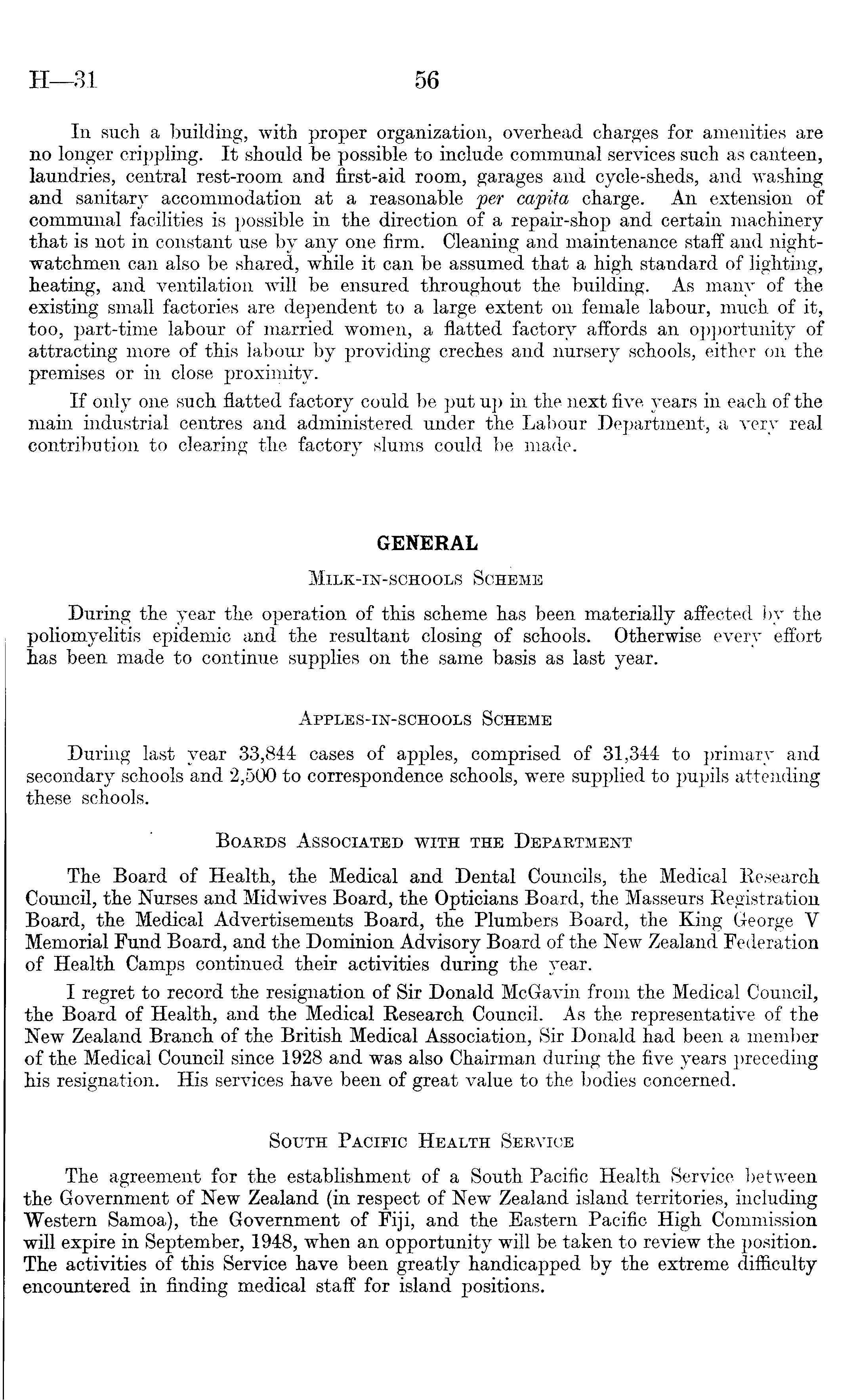 In such a building, with proper organization, overhead charges for amenities are no longer crippling. It should be possible to include communal services such as canteen, laundries, central rest-room and first-aid room, garages and cycle-sheds, and washing and sanitary accommodation at a reasonable per capita charge. An extension of communal facilities is possible in the direction of a repair-shop and certain machinery that is not in constant use by any one firm. Cleaning and maintenance staff and nightwatchmen can also be shared, while it can be assumed that a high standard of lighting, heating, and ventilation will be ensured throughout the building. As many of the existing small factories are dependent to a large extent on female labour, much of it, too, part-time labour of married women, a flatted factory affords an opportunity of attracting more of this labour by providing creches and nursery schools, either on the premises or in close proximity. If only one such flatted factory could be put up in the next five years in each of the main industrial centres and administered under the Labour Department, a very real contribution to clearing the factory slums could be made. GENERAL Milk-in-schools Scheme During the year the operation of this scheme has been materially affected bv the poliomyelitis epidemic and the resultant closing of schools. Otherwise every effort has been made to continue supplies on the same basis as last year. Apples-in-schools Scheme During last year 33,844 cases of apples, comprised of 31,344 to primary and secondary schools and 2,500 to correspondence schools, were supplied to pupils attending these schools. Boards Associated with the Department The Board of Health, the Medical and Dental Councils, the Medical Research Council, the Nurses and Midwives Board, the Opticians Board, the Masseurs Registration Board, the Medical Advertisements Board, the Plumbers Board, the King George Y Memorial Fund Board, and the Dominion Advisory Board of the New Zealand Federation of Health Camps continued their activities during the year. I regret to record the resignation of Sir Donald McGavin from the Medical Council, the Board of Health, and the Medical Research Council. As the representative of the New Zealand Branch of the British Medical Association, Sir Donald had been a member of the Medical Council since 1928 and was also Chairman during the five years preceding his resignation. His services have been of great value to the bodies concerned. South Pacific Health Service The agreement for the establishment of a South Pacific Health Service between the Government of New Zealand (in respect of New Zealand island territories, including Western Samoa), the Government of Fiji, and the Eastern Pacific High Commission will expire in September, 1948, when an opportunity will be taken to review the position. The activities of this Service have been greatly handicapped by the extreme difficulty encountered in finding medical staff for island positions.