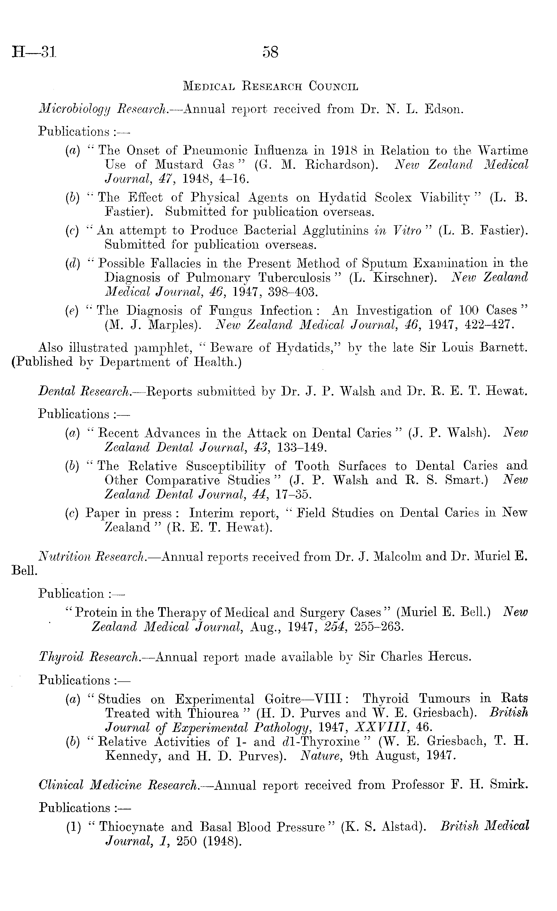 Medical Research Council Microbiology Research.—Annual report received from Dr. N. L. Edson. Publications : (a) " The Onset of Pneumonic Influenza in 1918 in Relation to the Wartime Use of Mustard Gas" (G. M. Richardson). New Zealand Medical Journal, 47, 1948, 4-16. (b) " The Effect of Physical Agents on Hydatid Scolex Viability " (L. B. Pastier). Submitted for publication overseas. (c) " An attempt to Produce Bacterial Agglutinins in Vitro " (L. B. Fastier). Submitted for publication overseas. (d) " Possible Fallacies in the Present Method of Sputum Examination in the Diagnosis of Pulmonary Tuberculosis " (L. Kirschner). New Zealand Medical Journal, 46, 1947, 398-403. (e) ut The Diagnosis of Fungus Infection : An Investigation of 100 Cases " (M. J. Marples). New Zealand Medical Journal, 46, 1947, 422-427. Also illustrated pamphlet, " Beware of Hydatids," by the late Sir Louis Barnett. (Published by Department of Health.) Dental Research.—Reports submitted by Dr. J. P. Walsh and Dr. R. E. T. Hewat, Publications : (a) " Recent Advances in the Attack on Dental Caries " (J. P. Walsh). New Zealand Dental Journal, 43, 133-149. (b) " The Relative Susceptibility of Tooth Surfaces to Dental Caries and Other Comparative Studies " (J. P. Walsh and R. S. Smart.) New Zealand Dental Journal, 44, 17-35. (c) Paper in press : Interim report, " Field Studies on Dental Caries in New Zealand " (R. E. T. Hewat). Nutrition Research. —Annual reports received from Dr. J. Malcolm and Dr. Muriel E. Bell. Publication : " Protein in the Therapy of Medical and Surgery Cases " (Muriel E. Bell.) New Zealand Medical Journal, Aug., 1947, 254, 255-263. Thyroid Research. —Annual report made available by Sir Charles Hercus. Publications (a) " Studies on Experimental Goitre—Vlll: Thyroid Tumours in Rats Treated with Thiourea " (H. D. Purves and W. E. Griesbach). British Journal of Experimental Pathology, 1947, XXVIII, 46. (b) " Relative Activities of 1- and tZI-Thyroxine " (W. E. Griesbach, T. H. Kennedy, and H. D. Purves). Nature, 9th August, 1947. Clinical Medicine Research.—Annual report received from Professor F. H. Smirk. Publications : (1) " Thiocynate and Basal Blood Pressure " (K. S. Alstad). British Medical Journal, 1, 250 (1948).