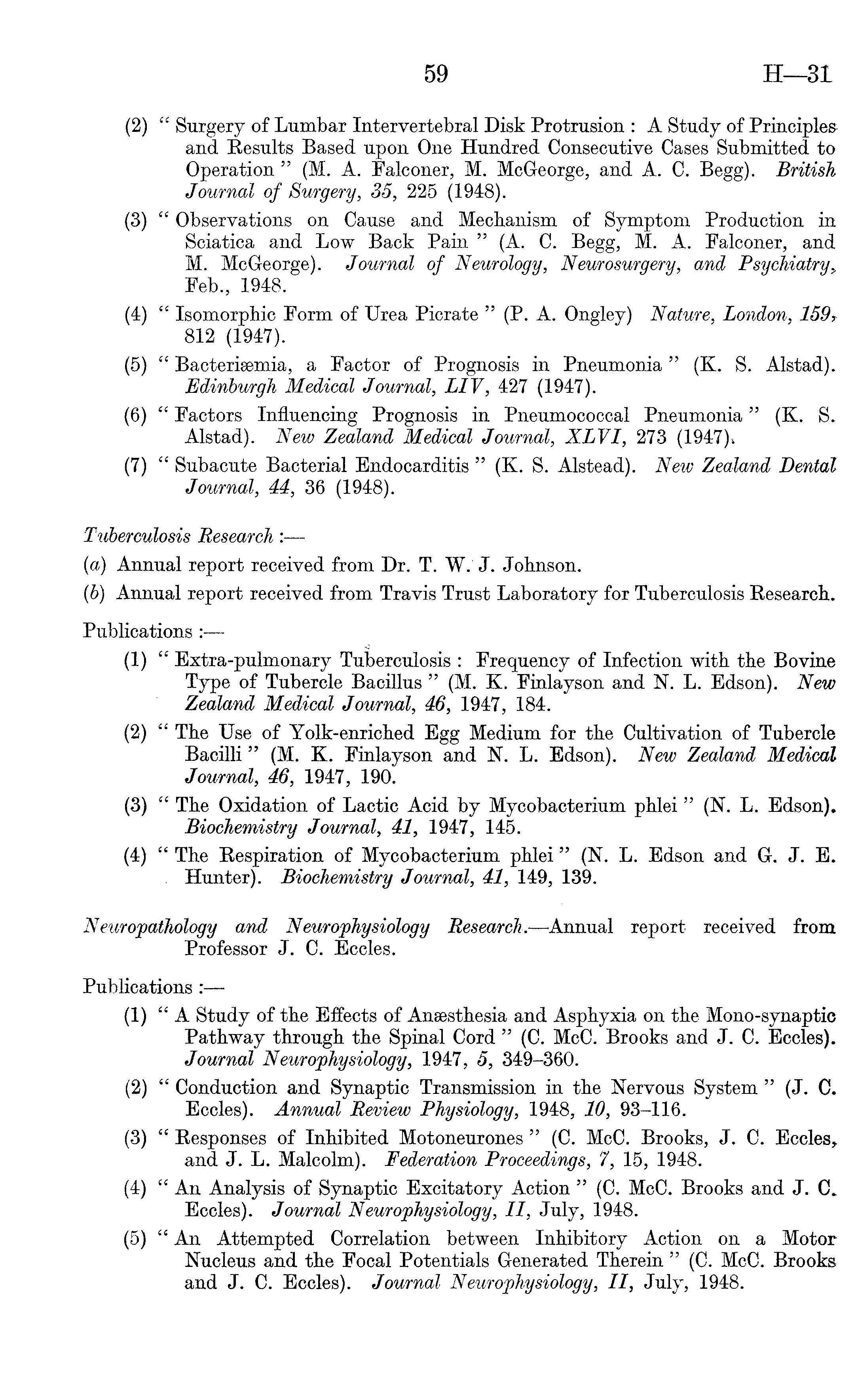 (2) " Surgery of Lumbar Intervertebral Disk Protrusion : A Study of Principles and Results Based upon One Hundred Consecutive Cases Submitted to Operation " (M. A. Falconer, M. McGeorge, and A. C. Begg). British Journal of Surgery, 35, 225 (1948). (3) " Observations on Cause and Mechanism of Symptom Production in Sciatica and Low Back Pain " (A. C. Begg, M. A. Falconer, and M. McGeorge). Journal of Neurology, Neurosurgery, and Psychiatry > Feb., 1948. (4) " Isomorphic Form of Urea Picrate " (P. A. Ongley) Nature, London, 159? 812 (1947). (5) " Bacterisemia, a Factor of Prognosis in Pneumonia " (K. S. Alstad). Edinburgh Medical Journal, LIV, 427 (1947). (6) " Factors Influencing Prognosis in Pneumococcal Pneumonia" (K. S. Alstad). New Zealand Medical Journal, XLVI, 273 (1947)» (7) " Subacute Bacterial Endocarditis " (K. S. Alstead). New Zealand Dental Journal, 44, 36 (1948). Tuberculosis Research:— (a) Annual report received from Dr. T. W. J. Johnson. (b) Annual report received from Travis Trust Laboratory for Tuberculosis Research. Publications : * (1) " Extra-pulmonary Tuberculosis : Frequency of Infection with the Bovine Type of Tubercle Bacillus " (M. K. Finlayson and N. L. Edson). New Zealand Medical Journal, 46, 1947, 184. (2) " The Use of Yolk-enriched Egg Medium for the Cultivation of Tubercle Bacilli" (M. K. Finlayson and N. L. Edson). New Zealand Medical Journal, 46, 1947, 190. (3) " The Oxidation of Lactic Acid by Mycobacterium phlei " (N. L. Edson). Biochemistry Journal, 41, 1947, 145. (4) " The Respiration of Mycobacterium phlei" (N. L. Edson and G. J. E. Hunter). Biochemistry Journal, 41, 149, 139. Neuropathology and Neurophysiology Research. —Annual report received from Professor J. C. Eccles. Publications : (1) "A Study of the Effects of Anaesthesia and Asphyxia on the Mono-synaptic Pathway through the Spinal Cord " (C. McC. Brooks and J. C. Eccles). Journal Neurophysiology, 1947, 5, 349-360. (2) " Conduction and Synaptic Transmission in the Nervous System " (J. C. Eccles). Annual Review Physiology, 1948, 10, 93-116. (3) " Responses of Inhibited Motoneurones " (C. McC. Brooks, J. C. Eccles, and J. L. Malcolm). Federation Proceedings, 7, 15, 1948. (4) " An Analysis of Synaptic Excitatory Action " (C. McC. Brooks and J. C. Eccles). Journal Neurophysiology, 11, July, 1948. (5) "An Attempted Correlation between Inhibitory Action on a Motor Nucleus and the Focal Potentials Generated Therein " (C. McC. Brooks and J. C. Eccles). Journal Neurophysiology, 11, July, 1948.