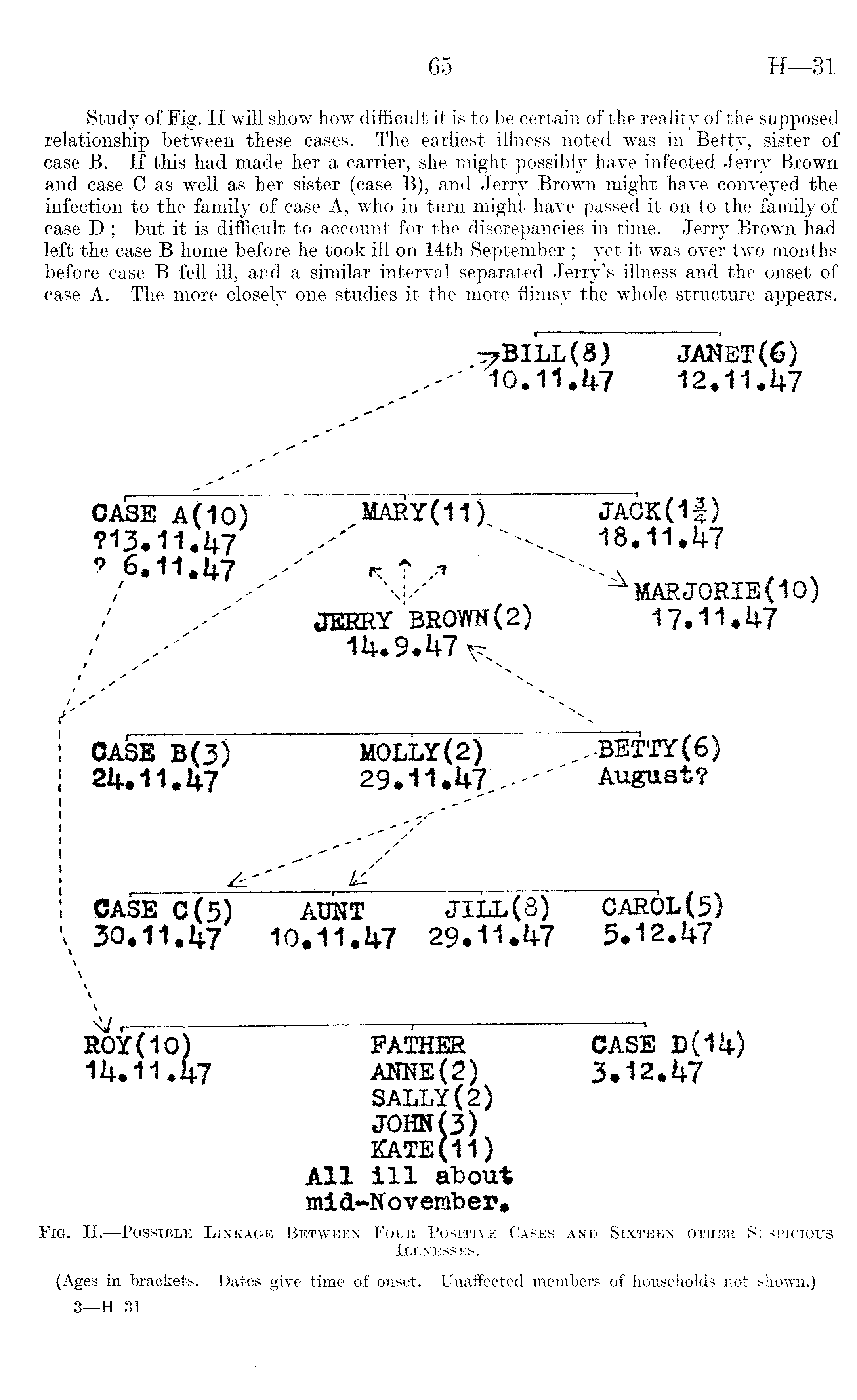 Study of Fig. II will show how difficult it is to be certain of the reality of the supposed relationship between these cases. The earliest illness noted was in Betty, sister of case B. If this had made her a carrier, she might possibly have infected Jerry Brown and case C as well as her sister (case B), and Jerry Brown might have conveyed the infection to the family of case A, who in turn might have passed it on to the family of case D ; but it is difficult to account for the discrepancies in time. Jerry Brown had left the case B home before he took ill on 14th September ; yet it was over two months before case B fell ill, and a similar interval separated Jerry's illness and the onset of case A. The more closely one studies it the more flimsy the whole structure appears.