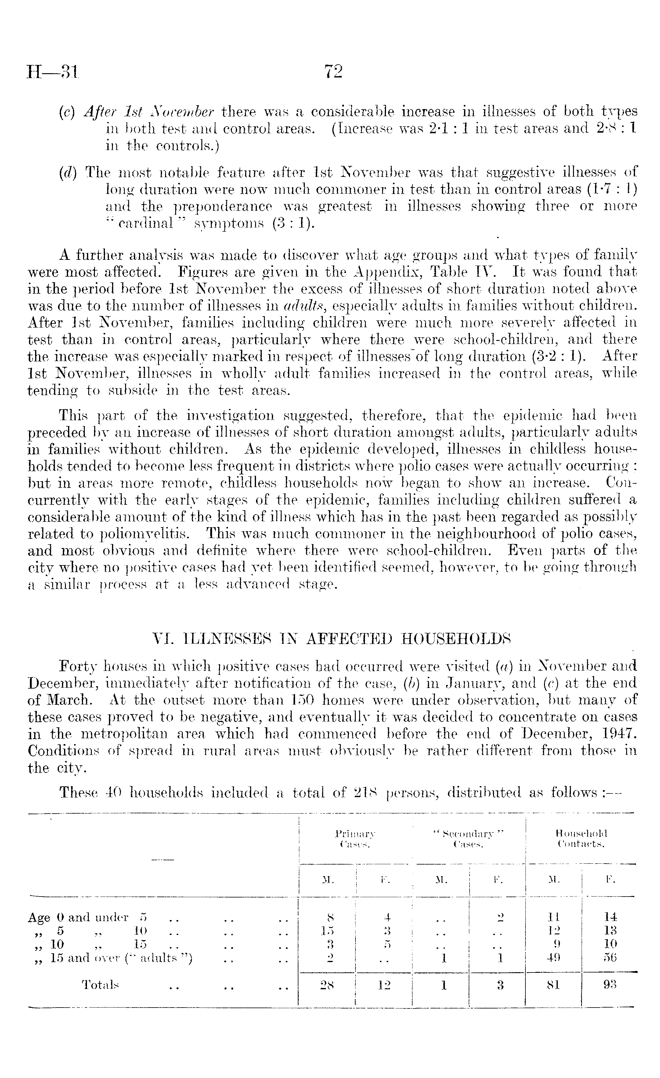 (c) After Ist November there was a considerable increase in illnesses of both types in both test and control areas. (Increase was 2-1:1 in test areas and 2-8 :1 in the controls.) (d) The most notable feature after Ist November was that suggestive illnesses of long duration were now much commoner in test than in control areas (1-7 : 1) and the preponderance was greatest in illnesses showing three or more " cardinal " symptoms (3 : 1). A further analysis was made to discover what age groups and what types of family were most affected. Figures are given in the Appendix, Table IV. It was found that in the period before Ist November the excess of illnesses of short duration noted above was due to the number of illnesses in adults, especially adults in families without children. After Ist November, families including children were much more severely affected in test than in control areas, particularly where there were school-children, and there the increase was especially marked in respect of illnesses*of long duration (3-2 :1). After Ist November, illnesses in wholly adult families increased in the control areas, while tending to subside in the test areas. This part of the investigation suggested, therefore, that the epidemic had been preceded by an increase of illnesses of short duration amongst adults, particularly adults in families without children. As the epidemic developed, illnesses in childless households tended to become less frequent in districts where polio cases were actually occurring ; but in areas more remote, childless households now began to show an increase. Concurrently with the early stages of the epidemic, families including children suffered a considerable amount of the kind of illness which has in the past been regarded as possibly related to poliomyelitis. This was much commoner in the neighbourhood of polio cases, and most obvious and definite where there were school-children. Even parts of the city where no positive cases had yet been identified seemed, however, to be going through a similar process at a less advanced stage. VI. ILLNESSES IN AFFECTED HOUSEHOLDS Forty houses in which positive cases had occurred were visited (a) in November and December, immediately after notification of the case, (b) in January, and (c) at the end of March. At the outset more than 150 homes were under observation, but many of these cases proved to be negative, and eventually it was decided to concentrate on cases in the metropolitan area which had commenced before the end of December, 1947. Conditions of spread in rural areas must obviously be rather different from those in the city. These 40 households included a total of 218 persons, distributed as follows